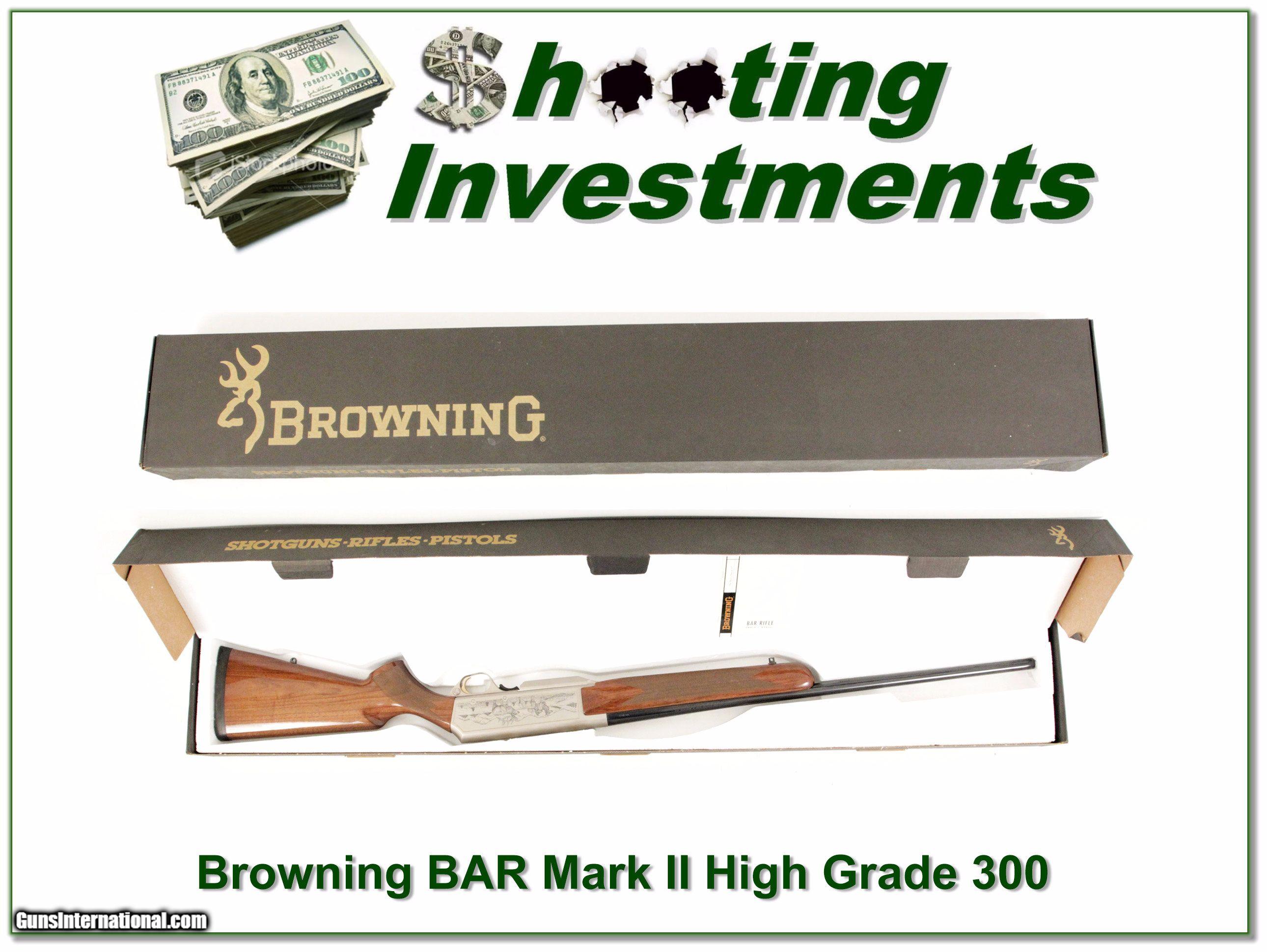 Description: This is an as new in the box Browning BAR Mark II High Grade in 300 Winchester Magnum. It has a sliver receiver with etched scene and beautiful wood. It comes as seen in original box. It will make a nice addition to your collection! These in 300 are hard to find. Shipping and insurance is $35 or $15 more if you want it shipped in a new Plano hard case. Please email me with any questions or larger pictures. (Consign your quality firearms with Shooting Investments for only 10%! Let me know if you have any you would like to sell!) 17-0957 Payment: Payment is by Money Order, Cashiers Check or Personal Check. I can now also accept MasterCard and Visa with a 3% convenience fee. PayPal can be used for some items but never firearms. Please let us know if you would like to pay via PayPal. Shipping: The shipping charge will be listed in each description. It is $35 for most guns. Some heavy guns or those insured for over $2000 will be higher. Shipments to Alaska and Hawaii are higher because air shipment is required. Most firearms are shipped within 5 days of receipt of payment. We prefer shipping at the beginning of the week to avoid firearms in transit over weekends. We package all shipments carefully and insure them for the full purchase price, rounded up to the next $100. In the unlikely event that damage occurs, it is important that you save all packaging material for the claims process. Optics are shipped Priority Mail and most other non-firearm shipments are shipped First Class. Returns: Our return policy is simple. If for any reason you are not pleased with your purchase, you may return your item for a refund. The only exception is ammunition, it cannot be returned. It is important to us that you are happy. Guns cannot be fired or dissembled before returning them and must be returned in the same condition as received. Notification of a return must occur with-in 3 days of receipt at your dealer. Shipping, convenience and dealer fees are not refundable and are the responsibility of the buyer. Lay-a-way: If needed, we offer a 60 day lay-a-way option on most firearms. It is 1/3 now, 1/3 in 30 days and 1/3 in 60 days. Lay-a-way firearm sales are final. Consigning your firearms with Shooting Investments: We will help you get top dollar for your firearms. While most local guns shops charge 20% or more, our fee is only 10% with a minimum of $50. At your local gun shop it might take months to sell. Selling on-line provides instant access to thousands of interested buyers. You won’t find any other on-line dealer willing to sell your firearms for only 10% or listing every gun on 4 separate s. Selling through an House typically costs the seller 15% and the buyer an addition 15% (so 30%) and you have to wait several months to sell and longer to receive funds. If properly priced, we will sell your firearms in a week or two. Send us an email or give us a call and we’ll explain how easy it is for you to get top dollar. Trading: We collect guns and usually just trade for guns we want to add to our collections. We often sell guns for others wanting to purchase one of ours. We find this the most fair to both of us. Our Commission is only 10% and we hold the gun you want until yours sells. Please contact us if you want to sell one of yours to buy one of ours. Help for California Buyers: We are happy to ship to California. It is the buyer’s responsibility to make sure any item you buy is legal in your state. We are also happy to help with your purchase of a firearm from someone other than us. If you see a gun you would like to buy but the seller can’t or won’t ship to California we can help. You buy the gun and have it shipped to us. We’ll then ship it to your California dealer. The cost for this service is only $30 + shipping. Let me know if we can help! SOLD |