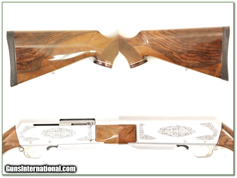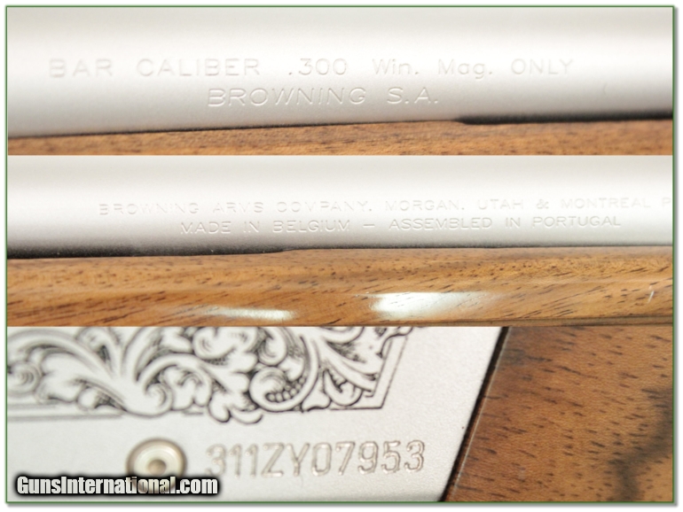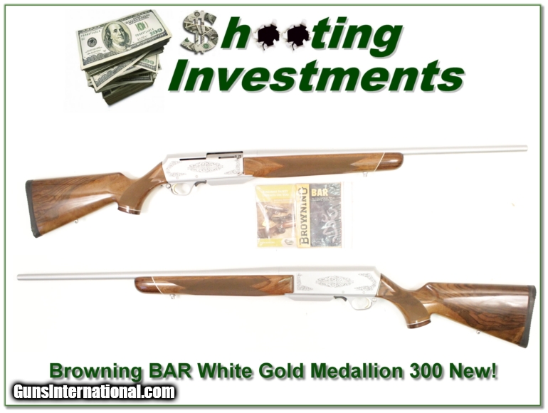 Description: This is an unfired and perfect BAR White Gold in 300 Winchester Mag. It has nicer wood than most of even these high grade guns. It comes with manual as shown. It will make a nice addition to any collection or be an impressive hunting gun for those that want to be a little different than all their hunting friends. I expect this one is sure to increase in value over time. Shipping and insurance is $30 or $18 more if you want it shipped in a new Plano hard case. Please email me with any questions or larger pictures. (I now consign quality firearms only 10%! Let me know if you have any you would like to sell!) [14-0648] Terms & Conditions Payment: Payment is by Money Order, Cashiers Check or Personal Check. I can now also accept MasterCard and Visa with a 3% convenience fee. PayPal can be used for some items but never firearms. Please let us know if you would like to pay via PayPal. Shipping: The shipping charge will be listed in each description. It is $30 for most guns. Some heavy guns or those insured for over $2000 may be higher. Shipments to Alaska and Hawaii are higher because air shipment is required. Most firearms are shipped within 5 days of receipt of payment. We prefer shipping at the beginning of the week to avoid firearms in transit over weekends. We package all shipments carefully and insure them for the full purchase price, rounded up to the next $100. In the unlikely event that damage occurs, it is important that you save all packaging material for the claims process. Optics are shipped Priority Mail and most other non-firearm shipments are shipped First Class. Returns: Our return policy is simple. If for any reason you are not pleased with your purchase, you may return your item for a refund. The only exception is ammunition, it cannot be returned. It is important to us that you are happy. Guns cannot be fired or dissembled before returning them and must be returned in the same condition as received. Notification of a return must occur with-in 3 days of receipt at your dealer. Shipping, convenience and dealer fees are not refundable and are the responsibility of the buyer. Lay-a-way: If needed, we offer a 60 day lay-a-way option on most firearms. It is 1/3 now, 1/3 in 30 days and 1/3 in 60 days. Lay-a-way firearm sales are final. Consigning your firearms with Shooting Investments: We will help you get top dollar for your firearms. While most local guns shops charge 20% or more, our fee is only 10% with a minimum of $50. At your local gun shop it might take months to sell. Selling on-line provides instant access to thousands of interested buyers. You won’t find any other on-line dealer willing to sell your firearms for only 10% or listing every gun on 4 separate s. Selling through an House typically costs 15% and you have to wait several months to sell and longer to receive funds. If properly priced, we will sell your firearms in a week or two. Send us an email or give us a call and we’ll explain how easy it is for you to get top dollar. Trading: We collect guns and usually just trade for guns we want to add to our collections. We often sell guns for others wanting to purchase one of ours. We find this the most fair to both of us. Our Commission is only 10% and we hold the gun you want until yours sells. Please contact us if you want to sell one of yours to buy one of ours. Help for California Buyers: We are happy to ship to California. It is the buyer’s responsibility to make sure any item you buy is legal in your state. We are also happy to help with your purchase of a firearm from someone other than us. If you see a gun you would like to buy but the seller can’t or won’t ship to California we can help. You buy the gun and have it shipped to us. We’ll then ship it to your California dealer. The cost for this service is only $30 + shipping. Let me know if we can help! SOLD |