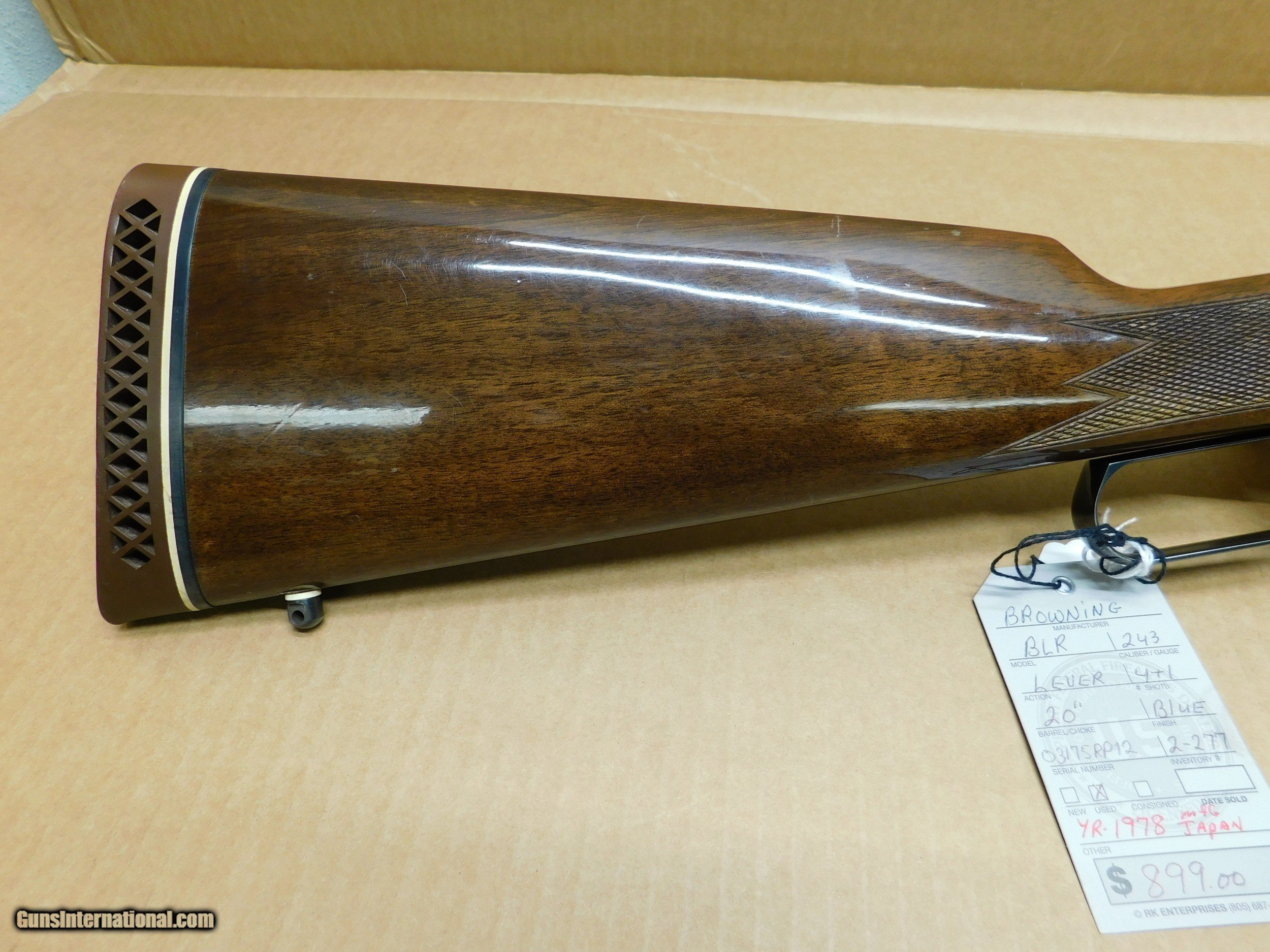 Description: This is a used Browning BLR 243 lever action rifle It is a 4+1 shot with a 20" blued barrel Mfg in Japan in 1978 There is a scratch on stock, shows in pic #11 SN-03175RP12 SOLD Manufacturer: Browning Model: BLR Serial Number: 03175RP12 Caliber Info: 243 Bore: good Condition: Used Metal Condition: very good Wood Condition: good Bore Condition: good Barrels: 20 Barrel Type: round Action: Lever Triggers: Gold Stock: Checkered walnut with sling studs Butt Pad: Browning Rubber Finish: Blue Sights: open Manufacture Date: 1978 Japan |