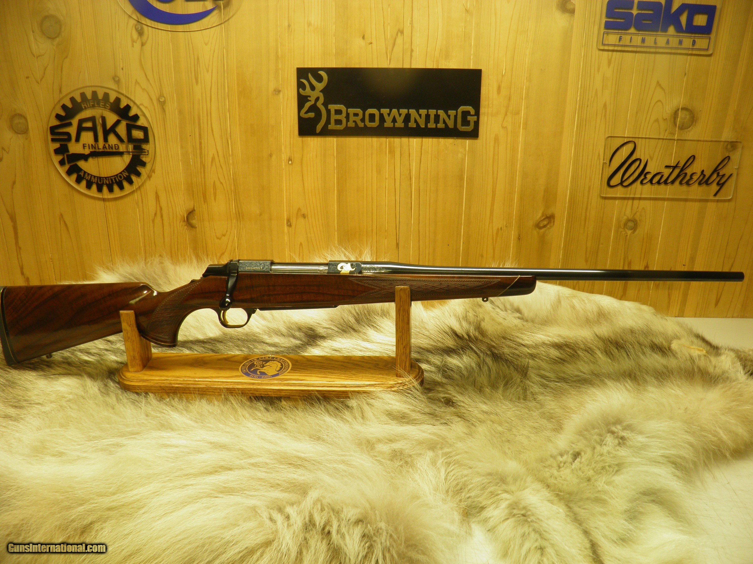 Description: BROWNING LIMITED EDITION BIG HORN SHEEP CAL> 270 WIN. MANF: 1986 1 OF 600, DEEP RELIEF ENGRAVING ON THE RECEIVER, BARREL, TRIGGERGUARD AND FLOOR PLATE, 5 BEAUTIFUL ENGRAVED BIG HORN SHEEP WITH 24 KT> GOLD OVERLAY,BEAUTIFUL HIGH GRADE WALNUT STOCK PROFILED IN THE CLASSIC STYLE AND IS EMBELLISHED WITH SKIPLINE CHECKERING AND A PEARL DORDER DESIGN, ROSEWOOD FOREND TIP AND GRIP CAP WITH BRASS SPACERS, HIGH GLOSS FINISH, HIGHLY POLISHED BOLT WITH FLUTES, GOLD TRIGGER, METAL IS HIGHLY POLIHED AND DEEPLY BLUED, BARREL LENGTH 22" OVERALL LENGTH 42 1/2", LENGTH OF PULL 13 5/8", CONDITION, 100% NEW AND UNFIRED IN FACTORY BOX, WITH OWNERS MANUAL WITH WARRANTY CARD AND FACTORY SWIVELS SOLD |
