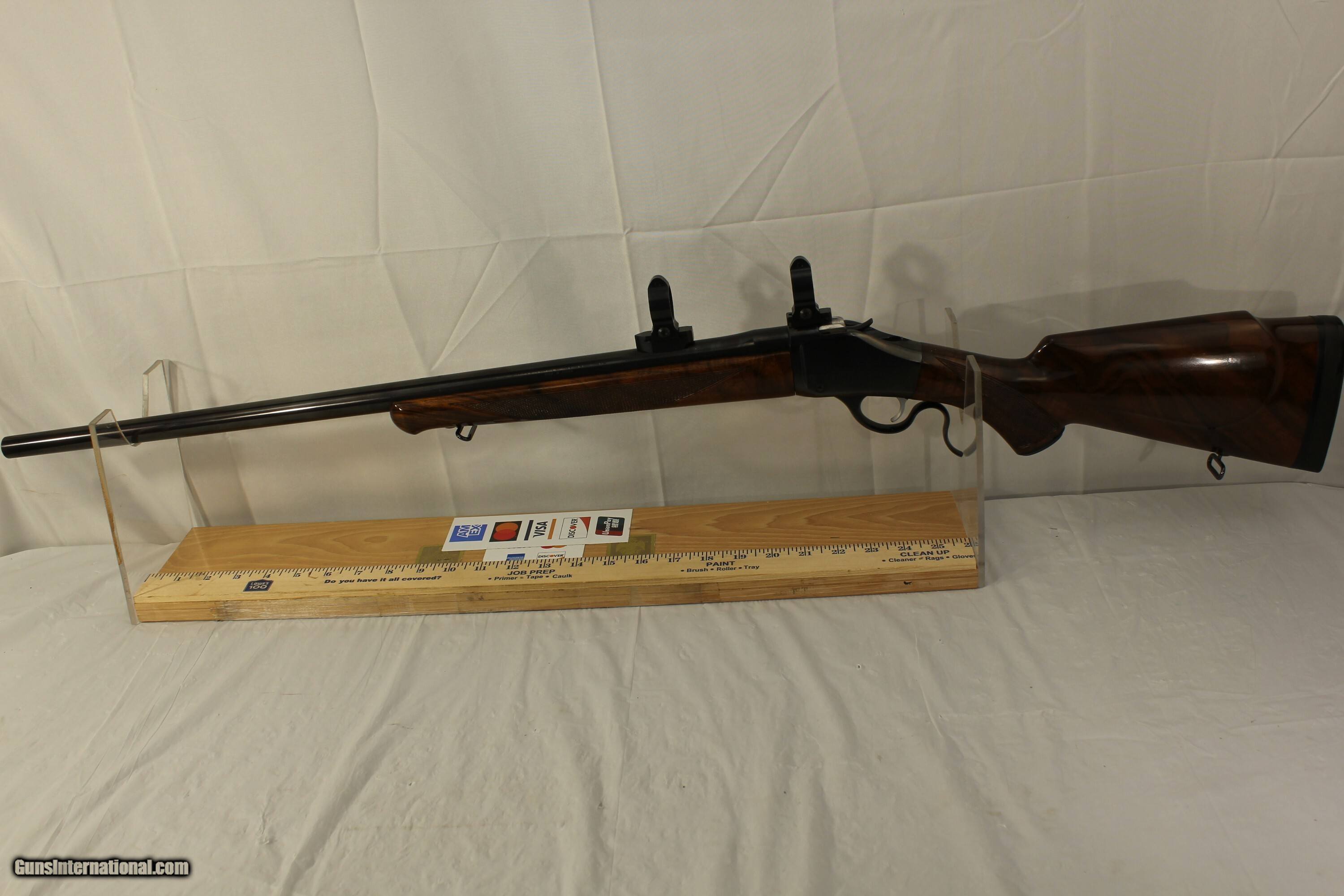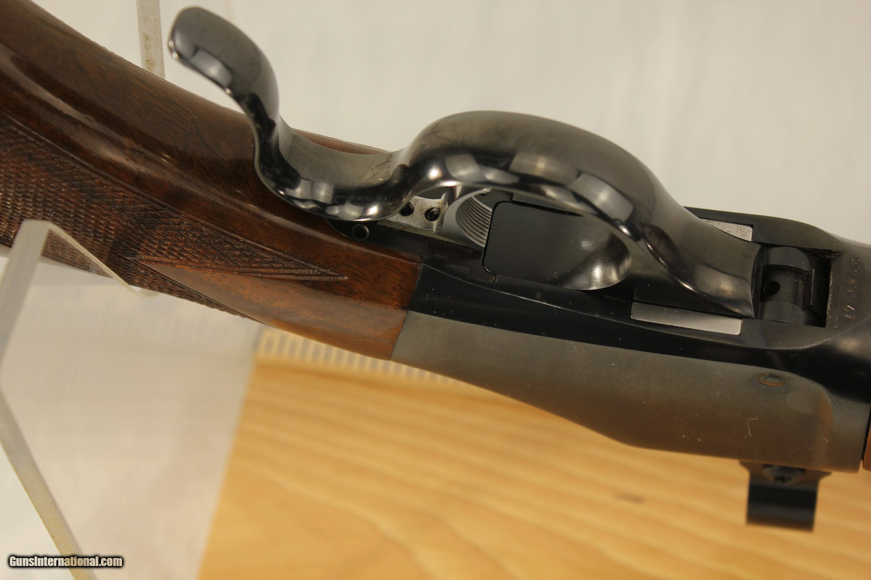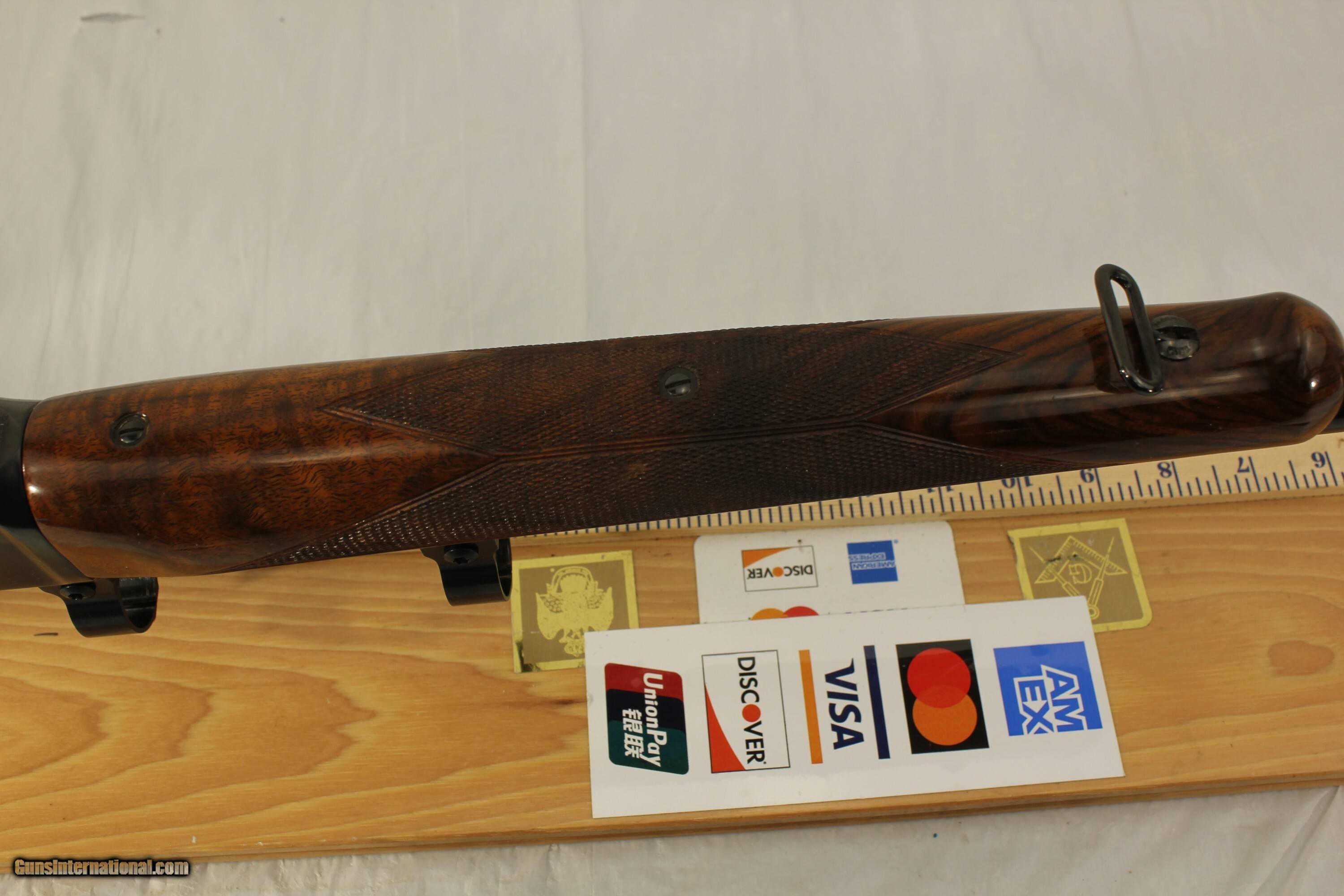 Description: This Browning Model 1885 single shot has some of the best figured wood I have seen on these guns. The checkering is also excellent. It comes with the excellent Talley Mounts and 1 inch rings and factory sling swivels. It is chambered in the versitile .30-06 Gevernment caliber with a 26 inch barrel and an excellent bright shiney bore. The gun has the minimum of dings and scratches and is fitted with a Kicki ease pad. Please use the ZOOM to make your evaluation of this fine clasic rifle. $80.00 shipping via Priority Mail Price: $2,000.00 Buy Now Contact Seller |