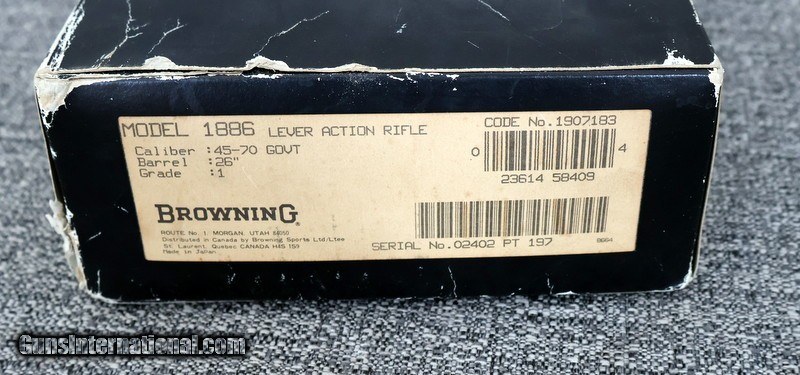 Description: Browning Model 1886 Lever Action Rifle in 45-70 This is a Browning 1886 Rifle Grade 1 in 45-70 with a 26" full octagon barrel, buckhorn adjustable rear sight and bead blade front sight. It has walnut stocks crescent rifle butt plate, the metal surfaces are finished in deep blue. The Browning Model 1886, is a reproduction of the original Winchester 1886 design that was a limited production in 1986 to commemorate the 100th anniversary of the 1886 Winchester rifle. These were made by Miroku in Japan and the 1986 Grade 1 run were limited to 7000. Condition: The overall condition of this Browning 1886 rifle is excellent almost new. The stocks are in excellent condition with some very light handling marks probably from use or storage. The overall metal surfaces are excellent as well retaining 99% of its original dark blue finish. The bore is near new, also in excellent condition with sharp bright rifling. All legends and markings are crisp and sharp. The rifle appears to have been used lightly if at all. The rifle comes complete with a factory box, end labeled and numbered to the gun, in very good condition with light storage wear We like to offer these Browning 1886 rifles and carbines and we usually have these in stock. They are well made, without the rebounding hammers and tang safeties. In our opinion, they are as close as you can get to a modern version of the original Winchester 1886. Since they are made with modern steel they are capable of hard use in the field with full load 45-70 ammunition. This is a rifle that is ready to be put to work. SN: 02402PT197 Modern Check out The Gray Fox Shop, LLC Rifle Caliber: .45-70 Government Manufacturer: Browning Model: 1886 Serial Number: 02402PT197 Bore Info: 45-70 Condition: Excellent Metal Condition: Excellent Wood Condition: excellent Bore Condition: excellent Barrel Type: octagon Action: lever action Triggers: single Stock: standard walnut Finish: blue Sights: Semi Buckhorn/beaded blade front Manufacture Date: 1986 Extras: Factory matching box and instruction manual Price: $2,550.00 Shipping: $45.00 Contact Seller |