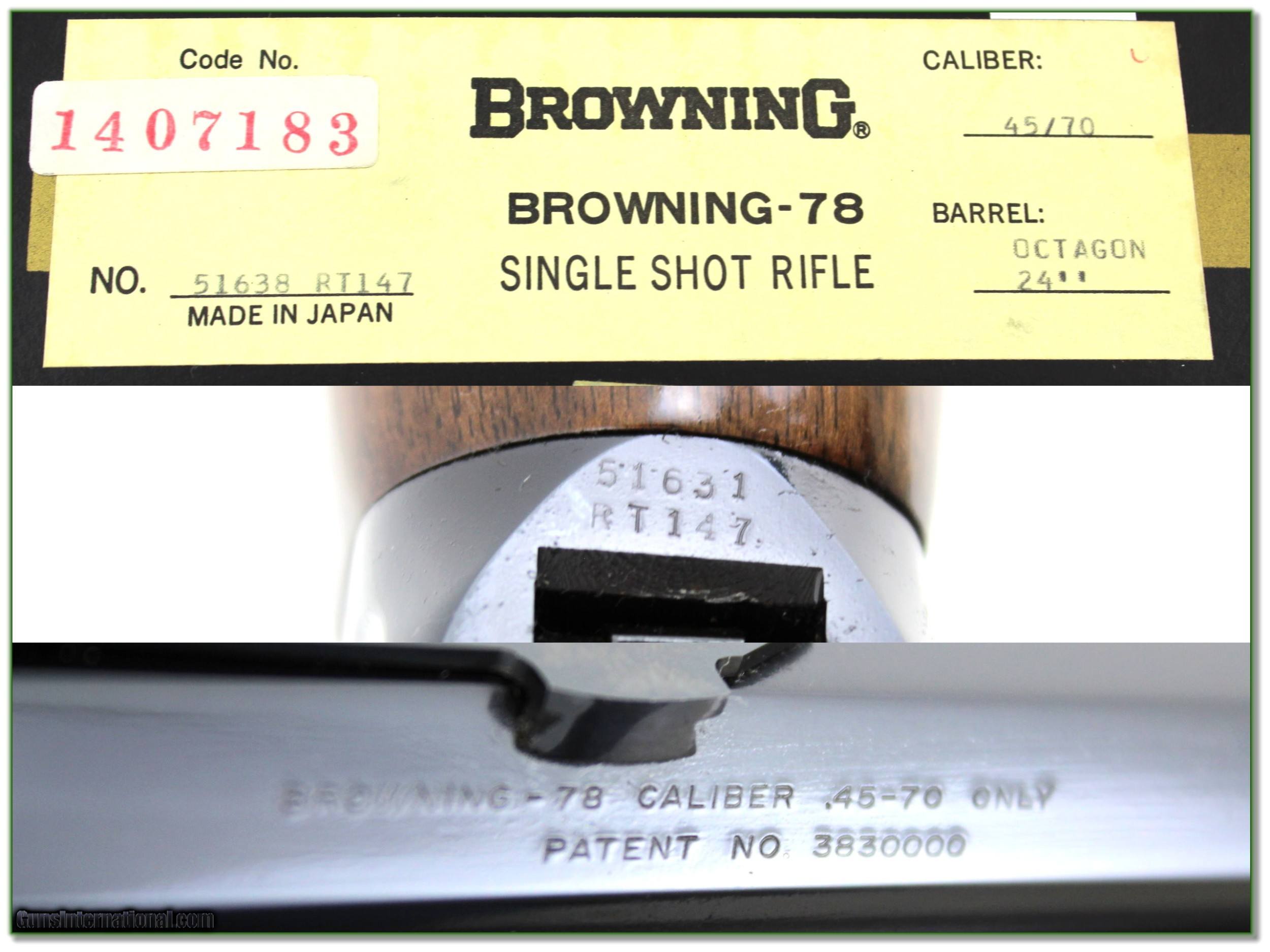 Description: This is a new, unfired and in the box Browning Model 78 in the hard hitting 45-70. It has a 24in octagonal barrel and traditional stock. It will make a classic big game gun or be a fine addition to your collection. Shipping with insurance is $39. Please email me with any questions or larger pictures. (Consign your quality firearms with Shooting Investments for only 12%! Let me know if you have any you would like to sell!) 20-0255 Payment: Payment is by Money Order, Cashiers Check or Personal Check. I can now also accept MasterCard and Visa with a 3% convenience fee. PayPal can be used for some items but never firearms. Please let us know if you would like to pay via PayPal. Shipping: The shipping charge will be listed in each description. It is $39 for most guns. Some heavy guns or those insured for over $2000 will be higher. Shipments to Alaska and Hawaii are higher because air shipment is required. Most firearms are shipped on Tuesday and Thursday and usually in 5 days of receipt of payment. We package all shipments carefully and insure them. Returns: Our return policy is simple. If for any reason you are not pleased with your purchase, you may return your item for a full refund of purchase price. Ammunition cannot be returned. It is important to us that you are happy. Guns cannot be fired or dissembled before returning them and they must be returned in the same condition as received. Notification of a return must occur with-in 3 days of receipt at your dealer. Shipping, convenience and dealer fees are not refundable and are the responsibility of the buyer. Lay-a-way: If needed, we offer a 60 day lay-a-way option on most firearms. It is 1/3 now, 1/3 in 30 days and 1/3 in 60 days. Lay-a-way firearm sales are final and if not completed the first payment cannot be returned. Consigning your firearms with Shooting Investments: We will help you get top dollar for your firearms. While most local guns shops charge 20% or more, our fee is only 12% with a minimum of $75. At your local gun shop it might take months to sell. Selling on-line provides instant access to thousands of interested buyers. You won’t find any other on-line dealer willing to sell your firearms for only 12% or listing every gun on 3 separate s. Selling through an House typically costs the seller 15% and the buyer an addition 15% (so 30%) and you have to wait several months to sell and longer to receive funds. If properly priced, we will sell your firearms in a few weeks. Send us an email or give us a call and we’ll explain how easy it is for you to get top dollar. Trading: Trading for use is really just buying your gun to re-sell. If you have a gun you want to trade, please email a picture and we will let you know what we can give or it. You will always get more if we sell it for you on consignment. Help for California Buyers: We are happy to ship to California. It is the buyer’s responsibility to make sure any item you buy is legal in your state. We are also happy to help with your purchase of a firearm from someone other than us. If you see a gun you would like to buy but the seller can’t or won’t ship to California they can ship to use and we’ll then ship it to your California dealer. The cost for this service is only $30 + shipping. Let us know if we can help! SOLD |