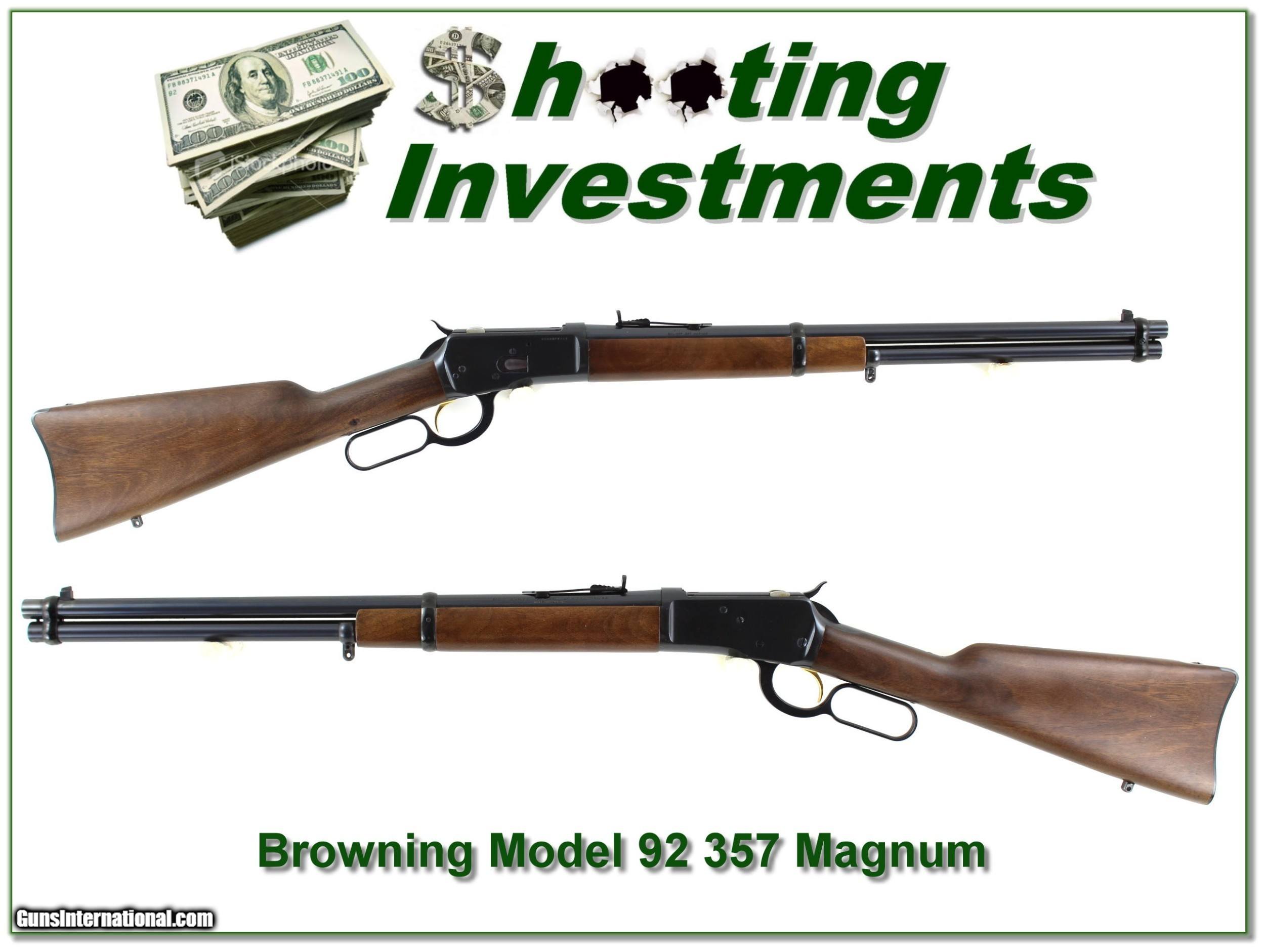 Description: Collectors, shooters, and hunters, this is a VERY hard to find Browning 92 in 357 Magnum with 20in barrel! It looks to be unfired! These have become sought after guns for collectors and hunters alike. I see no marks of note. This will make a great deer gun or fine addition to your collection. Shipping and insurance is $39. Please email me with any questions or larger pictures. (Consign your quality firearms with Shooting Investments for only 12%! Let me know if you have any you would like to sell!) 20-0346 Payment: Payment is by Money Order, Cashiers Check or Personal Check. I can now also accept MasterCard and Visa with a 3% convenience fee. PayPal can be used for some items but never firearms. Please let us know if you would like to pay via PayPal. Shipping: The shipping charge will be listed in each description. It is $39 for most guns. Some heavy guns or those insured for over $2000 will be higher. Shipments to Alaska and Hawaii are higher because air shipment is required. Most firearms are shipped on Tuesday and Thursday and usually in 5 days of receipt of payment. We package all shipments carefully and insure them. Returns: Our return policy is simple. If for any reason you are not pleased with your purchase, you may return your item for a full refund of purchase price. Ammunition cannot be returned. It is important to us that you are happy. Guns cannot be fired or dissembled before returning them and they must be returned in the same condition as received. Notification of a return must occur with-in 3 days of receipt at your dealer. Shipping, convenience and dealer fees are not refundable and are the responsibility of the buyer. Lay-a-way: If needed, we offer a 60 day lay-a-way option on most firearms. It is 1/3 now, 1/3 in 30 days and 1/3 in 60 days. Lay-a-way firearm sales are final and if not completed the first payment cannot be returned. Consigning your firearms with Shooting Investments: We will help you get top dollar for your firearms. While most local guns shops charge 20% or more, our fee is only 12% with a minimum of $75. At your local gun shop it might take months to sell. Selling on-line provides instant access to thousands of interested buyers. You won’t find any other on-line dealer willing to sell your firearms for only 12% or listing every gun on 3 separate s. Selling through an House typically costs the seller 15% and the buyer an addition 15% (so 30%) and you have to wait several months to sell and longer to receive funds. If properly priced, we will sell your firearms in a few weeks. Send us an email or give us a call and we’ll explain how easy it is for you to get top dollar. Trading: Trading for use is really just buying your gun to re-sell. If you have a gun you want to trade, please email a picture and we will let you know what we can give or it. You will always get more if we sell it for you on consignment. Help for California Buyers: We are happy to ship to California. It is the buyer’s responsibility to make sure any item you buy is legal in your state. We are also happy to help with your purchase of a firearm from someone other than us. If you see a gun you would like to buy but the seller can’t or won’t ship to California they can ship to use and we’ll then ship it to your California dealer. The cost for this service is only $30 + shipping. Let us know if we can help! SOLD |