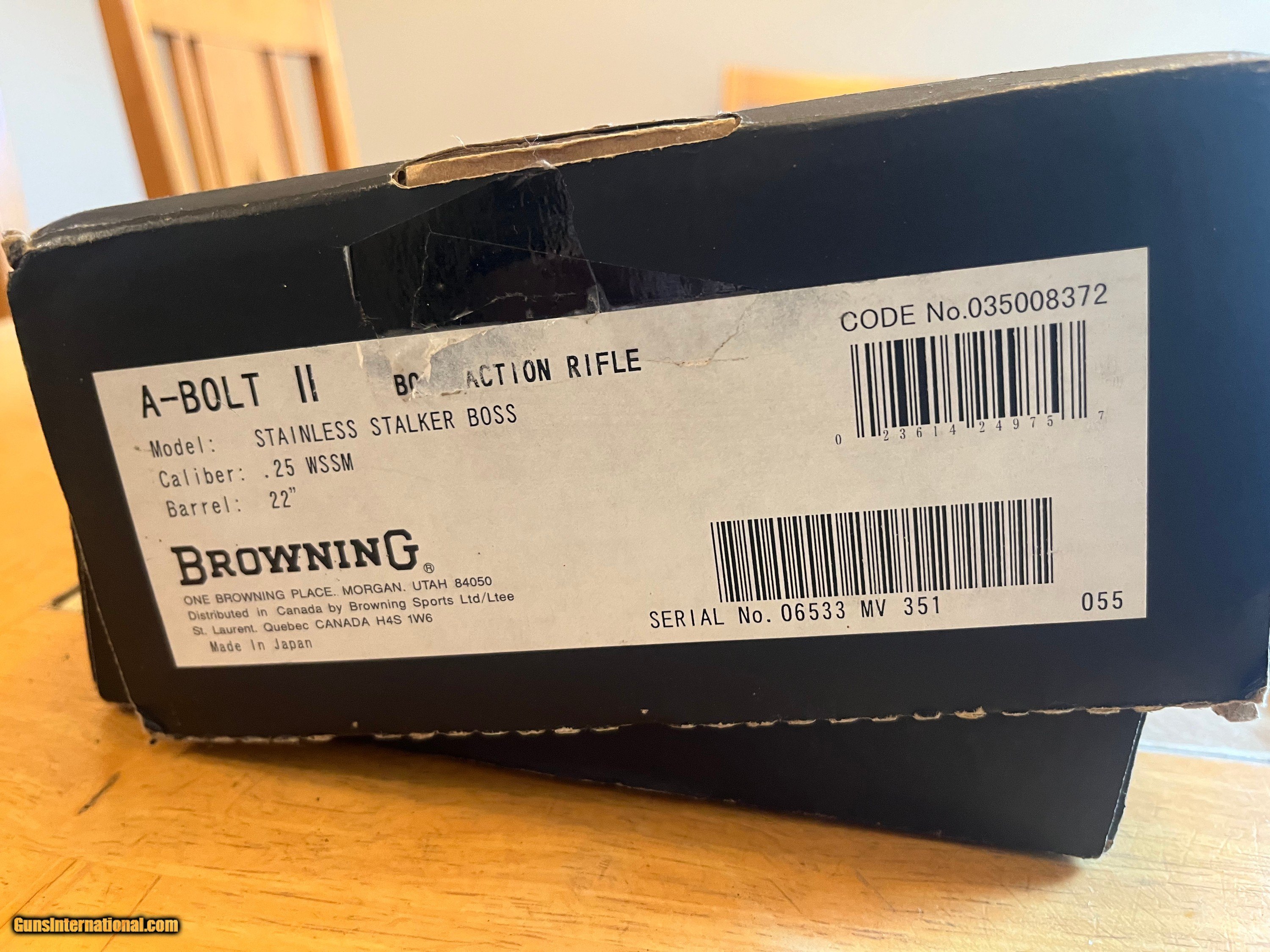 Description: New in Box. Browning Stalker Stainless BOSS. Photos attached. $1200.00 or best offer. 25 WSSM. Free Shipping. 817 881 9040. James SOLD |