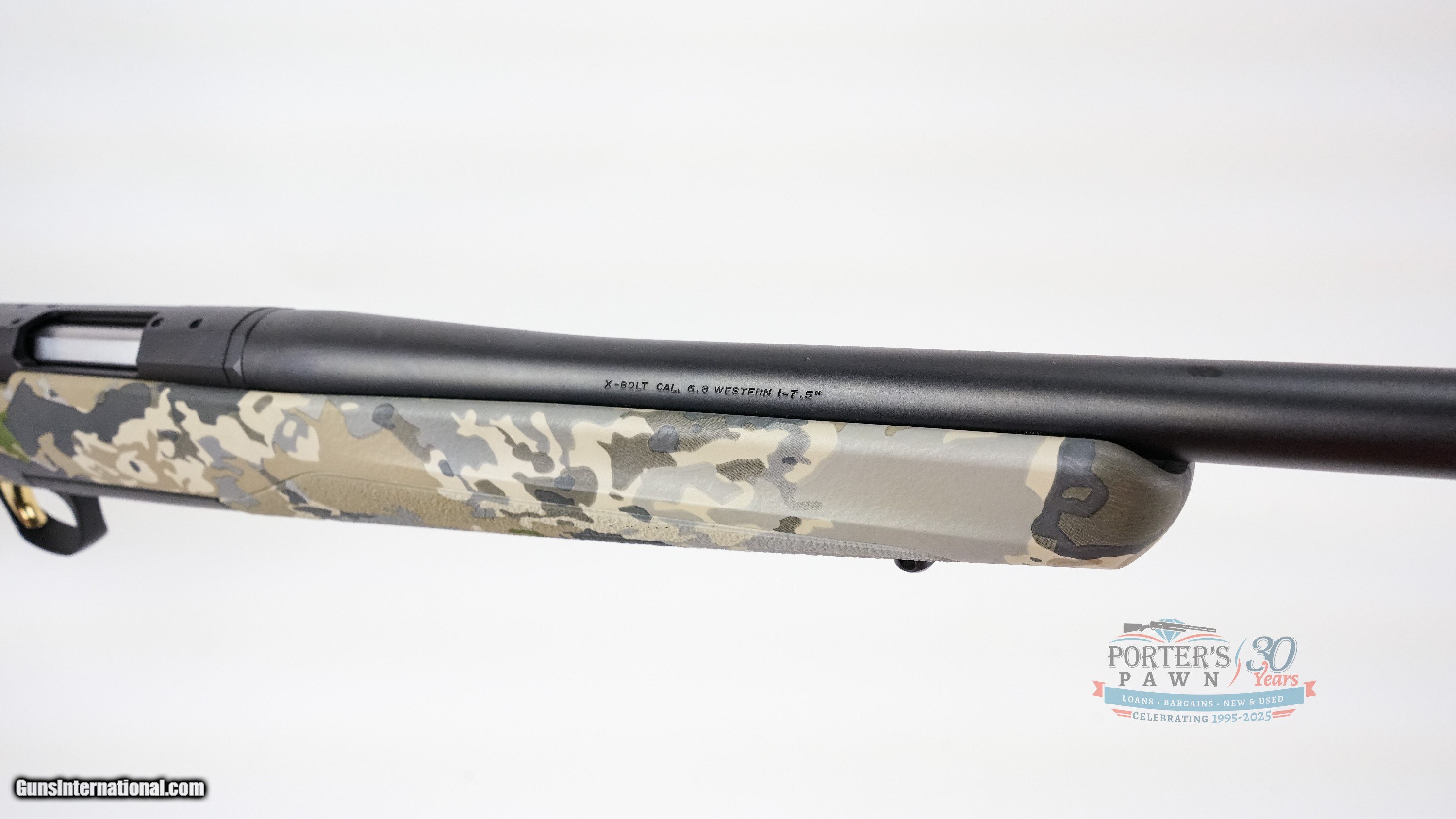 Description: Field-Ready Power & Precision — Browning X-Bolt Western Hunter in 6.8 Western Up for sale is a Browning X-Bolt Western Hunter chambered in the modern hunting cartridge 6.8 Western. This rifle is in Excellent Condition and pairs Browning’s proven X-Bolt action with hunting-focused ergonomics and finishes to deliver reliable performance where it matters most — in the field. Built for the serious hunter, this X-Bolt features a precision-contoured 25" free-floated barrel with a 1:7.5" twist to stabilize long, heavy bullets for superior downrange performance. The rugged composite stock includes an adjustable cheekpiece to achieve perfect eye-to-optic alignment, and the receiver is drilled and tapped for scope mounting for fast, secure optics installation. Safety and control are engineered into every detail — the rifle employs a two-position bolt-locking tang safety with bolt lock override, providing secure handling and simplified unloading in the field. The camo stock and matte blued metal finish help keep the rifle discreet in hunting environments while resisting wear. Specifications