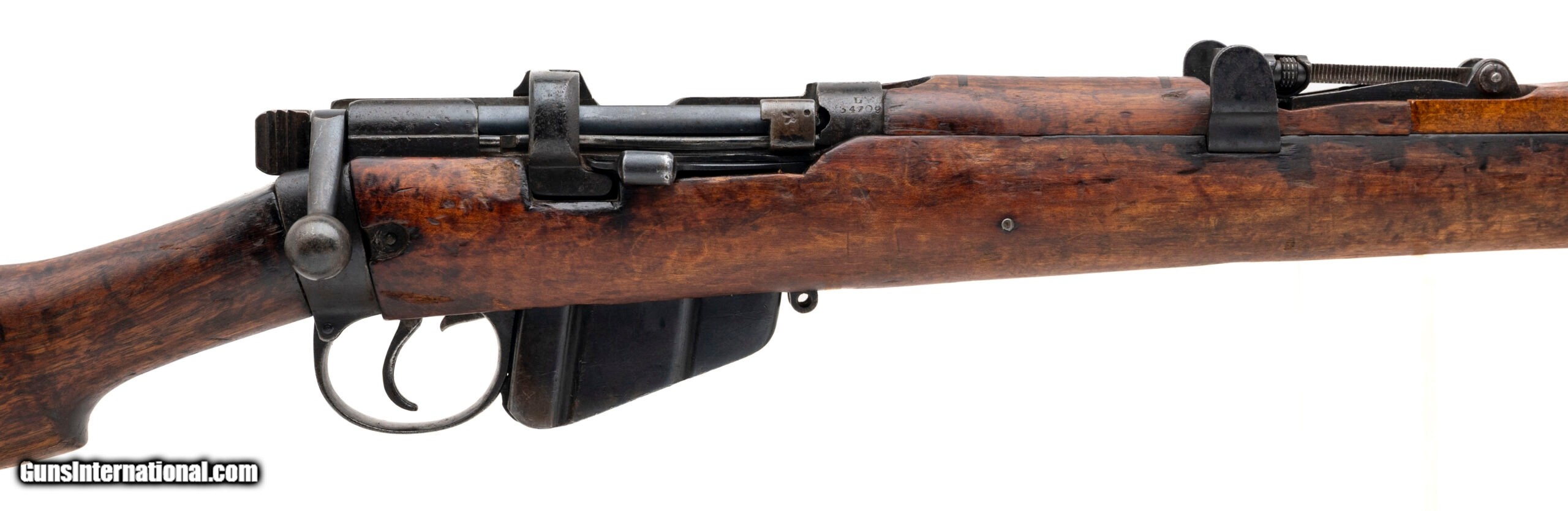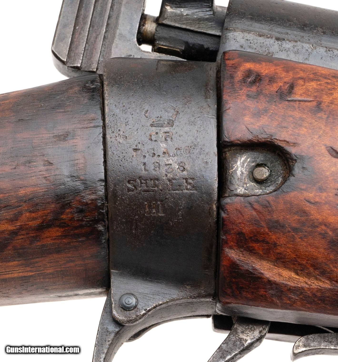 Description: "Serial No. L34709, manufactured in 1933, chambered in .303 British with a 25" round barrel. Bore is bright with strong rifling. Bolt is non-matching, and the rifle was refurbished at some point during its long service life—typical of rifles that saw extended Commonwealth use in the interwar and WWII periods. Metal finish shows scattered areas of surface oxidation, while the stock displays expected handling marks from regular field carry. The stock disk bears Indian service markings, indicating later issue to colonial forces where these rifles continued to serve well into the mid-20th century. Action is smooth and functions correctly. Curio/Relic: Yes Price: $695.00 Contact Seller |
