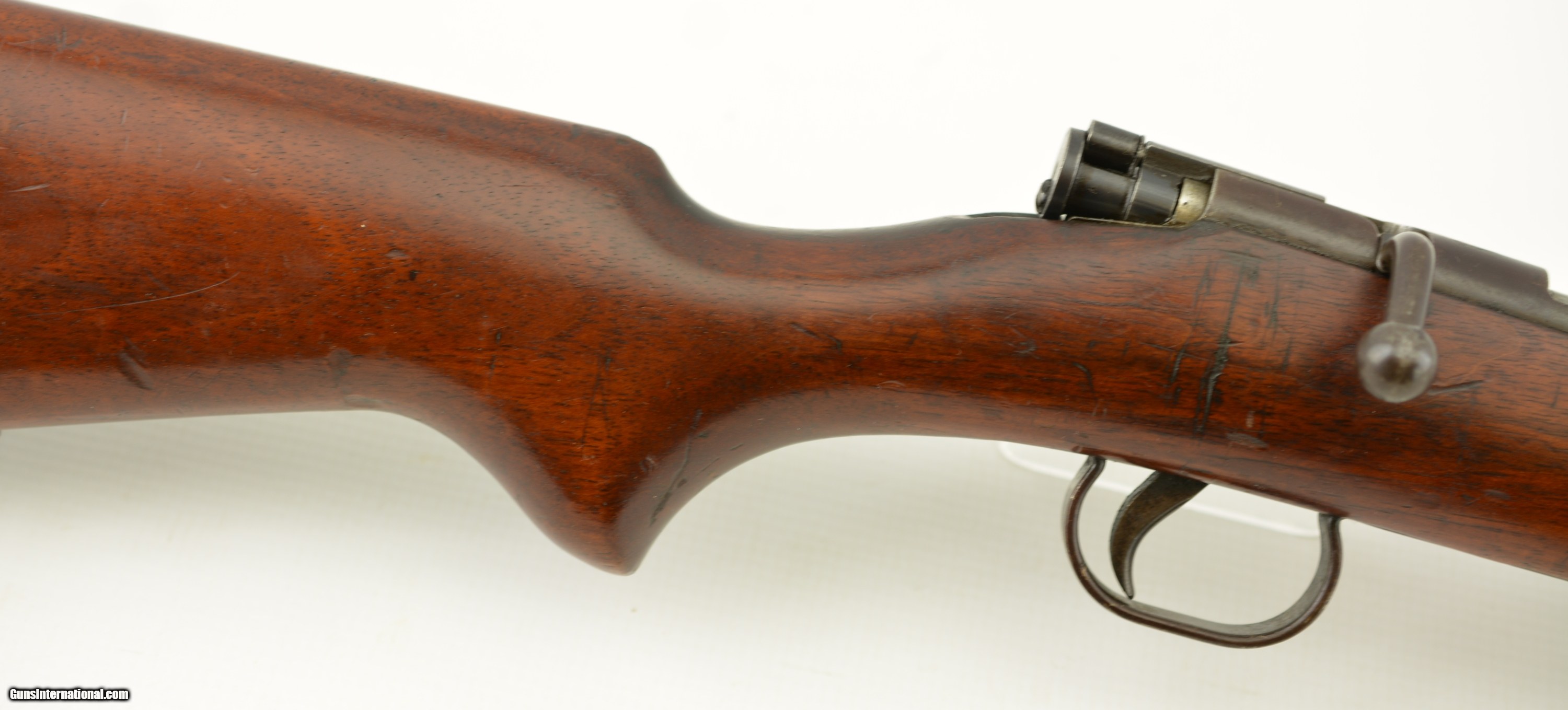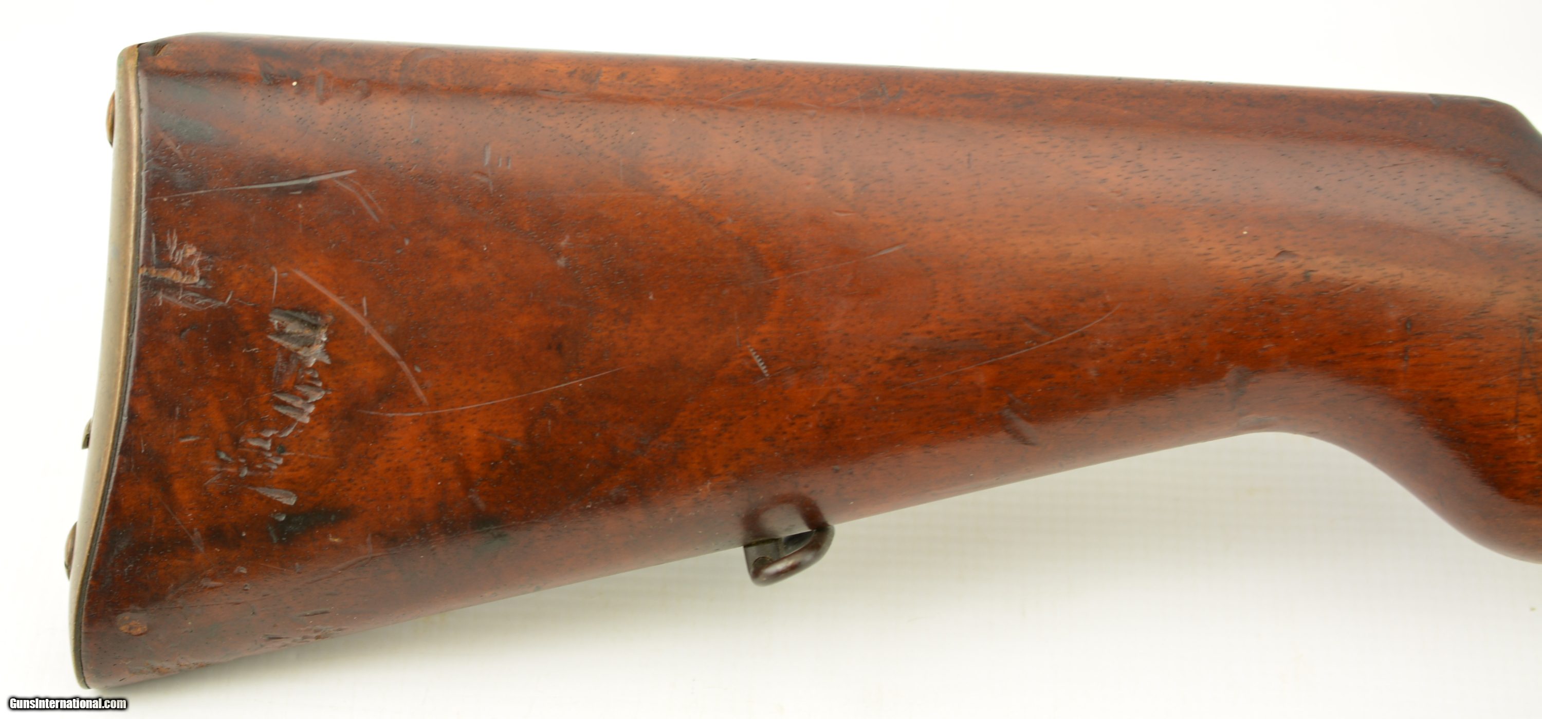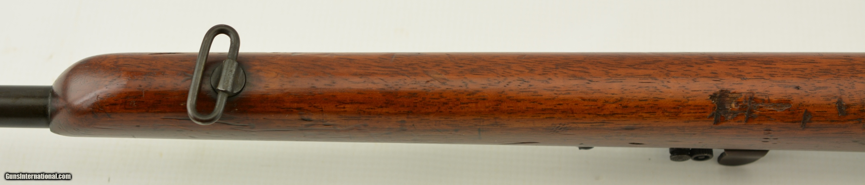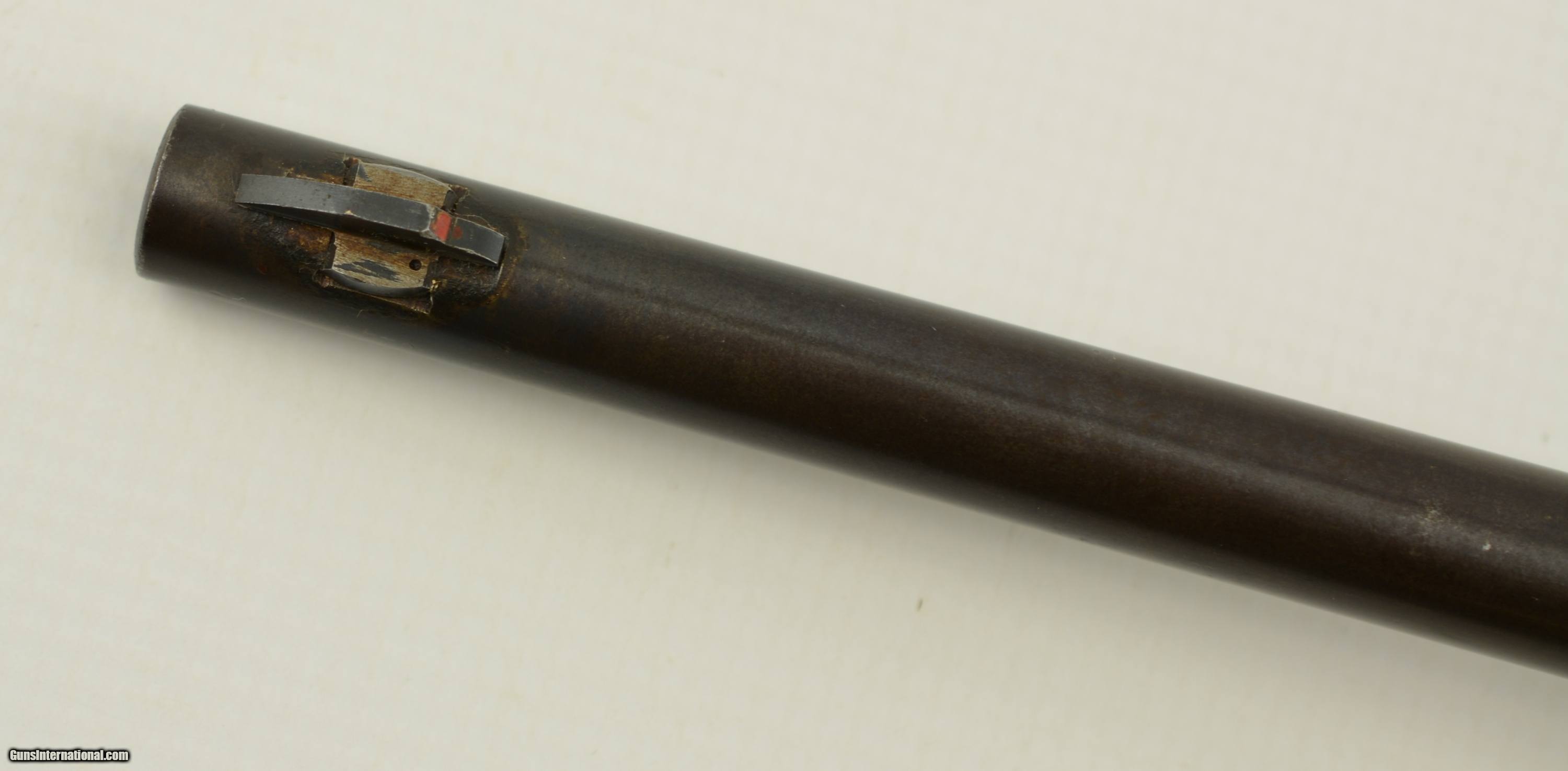 Description: Serial #5345, .22 LR, 23 3/4" barrel with a very good bore that has some mild freckling within the grooves. This is a rare single-shot training rifle, built along military lines, and marked on the top of the barrel breech: “MIN. RIFLE (Crown) W.O. PATT.", and “MADE BY / THE BIRMINGHAM SMALL ARMS Co. Ltd. / BIRMINGHAM / CARTRIDGE .220 LONG RIFLE". The metal retains 80-85% of the original blue finish with some silvering along the high edges and projections, and scattered spots of mild surface freckling throughout. The bolt has a mottled pewter gray and brown patina with some traces of original fire blue on the extractor. The rifle is fitted with a non-original sporting style front sight, and a miniature version of the SMLE rear sight, complete with “wings". The walnut stock has numerous small handling marks scattered about the original varnish, as well as a crisp original “(Stacked rifles)" trademark stamp on the left side of the buttstock. This is a very nice example of a very rare British military training rifle, and would make a great addition to any collection. FFL or C&R SOLD Curio/Relic: Yes Manufacturer: BSA Model: Martini Serial Number: 5345 Caliber Info: .22 Gauge Info: .22 |