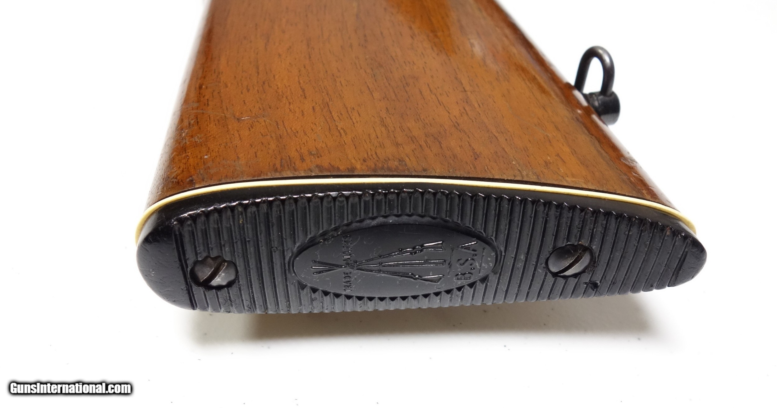 Description: BSA Royal Fwt. 30-06 made in England mid 1950s. S/N 7D***. 22" light contoured barrel with factory muzzle break. 90-95% original Blue and Varnish. Mauser type claw extractor/controlled round feeding. Includes rare and expensive Parker Hale scope rings on undrilled receiver. A very hard to find rifle in the U.S. and one of the best sporting rifles ever produced, often preferred by Alaskan mountain guides of the day over the Winchester 70 fwt. SOLD Curio/Relic: Yes |