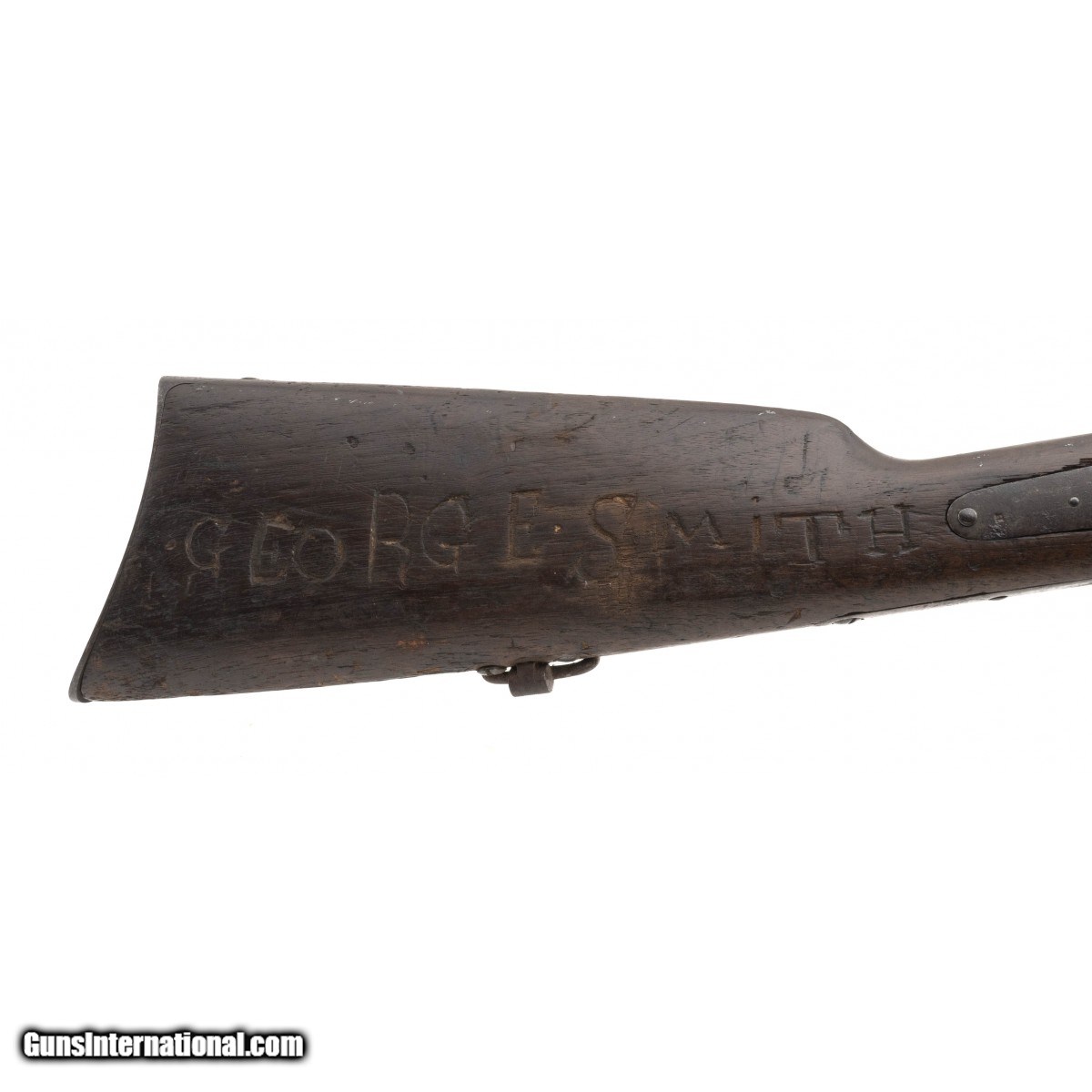 Serial No. 33448, circa 1863-1865, .54 caliber, 21"" round barrel. Carbine is in an untouched condition, traces of original case coloring are visible in protected areas. Factory markings are present but faint in some areas. Stock has expected nicks, dings and marring. Right side of the butt stock has ""George Smith"" carved from the butt plate to the rear of the receiver. Left has ""1865-.15.MO:Co. H"" records show a George Smith was a private for the 15th Missouri Cavalry Co. H during the Civil War on the Union side. Bore has scattered areas of pitting in the grooves, rifling remains strong.