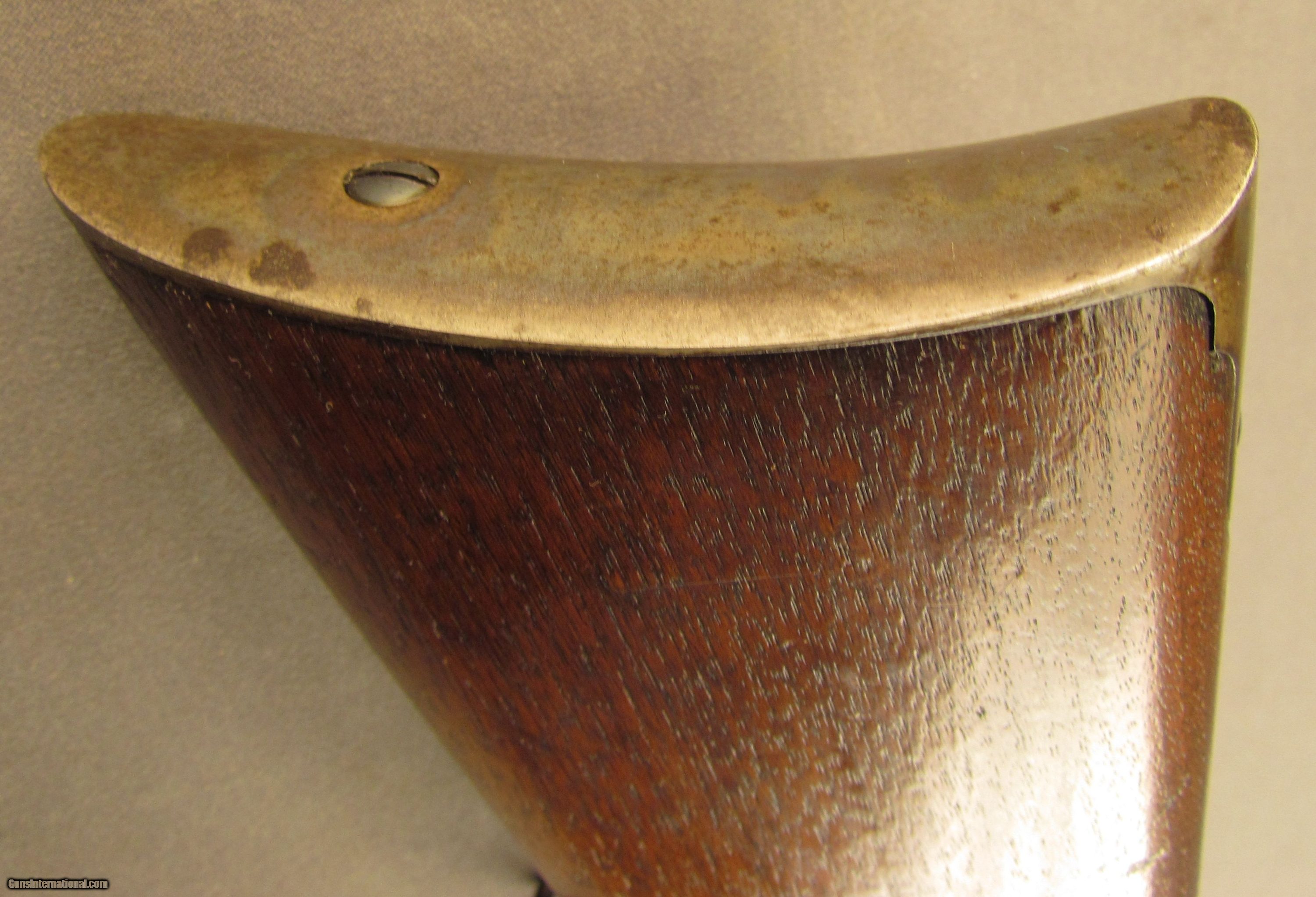 Description: Serial #17432, .54 Caliber, 21" barrel with an excellent, bright bore. This is a very handsome carbine that retains 92-95% of the original blue on the barrel which has only a small amount of fading and freckling at the muzzle and hints of a mild, plum-brown patina along the exposed portions of the barrel. The frame has retained 70-80% of the original color case-hardening which blends smoothly into mottled plum-brown freckling on the balance. The lever, breech block, and wrist tangs have 90-92% of their bright, nitre blue finish remaining as well. The sling bar and ring have an overall slightly freckled bright gray patina. The walnut forend and buttstock have only a few small handling blemishes scattered about the period-added oil finish, but the cartouches on the left side of the wrist are crisp and clear. The mechanical lock-up is solid and the action functions flawlessly. This is a splendid example of a Civil War Burnside, in excellent original condition and would be a great addition to any collection. Antique SOLD Antique: Yes Manufacturer: Burnside Model: Cavalry Carbine Serial Number: 17432 Caliber Info: .54 Cal Gauge Info: .54 Cal |