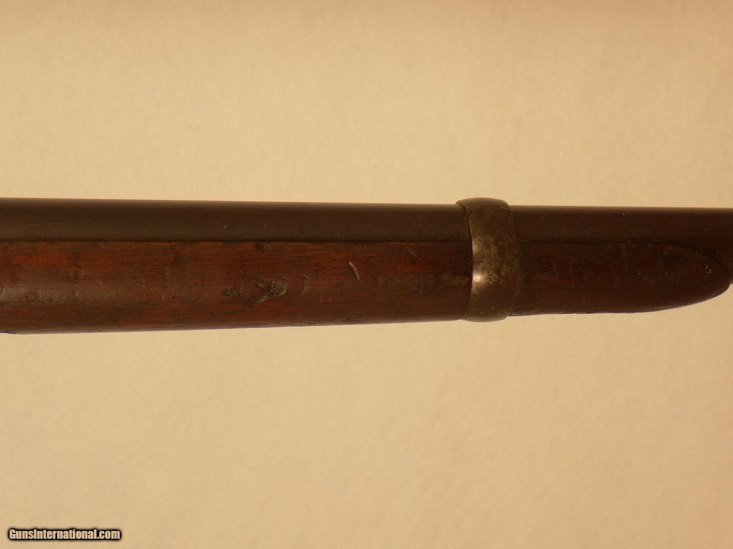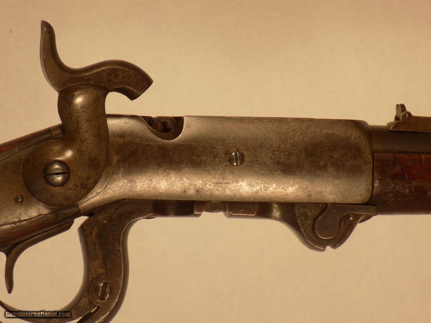 Description: #966A BURNSIDE CIVIL WAR SRC 4TH MODEL, 54 cal., 21" bbl., original sights, VG wood with inspectors stamp, 60% casehardening on frame thinning, 90% blue turning, good bore, sling swivel, saddle ring & bar, some dings in wood. $2950 SOLD |
