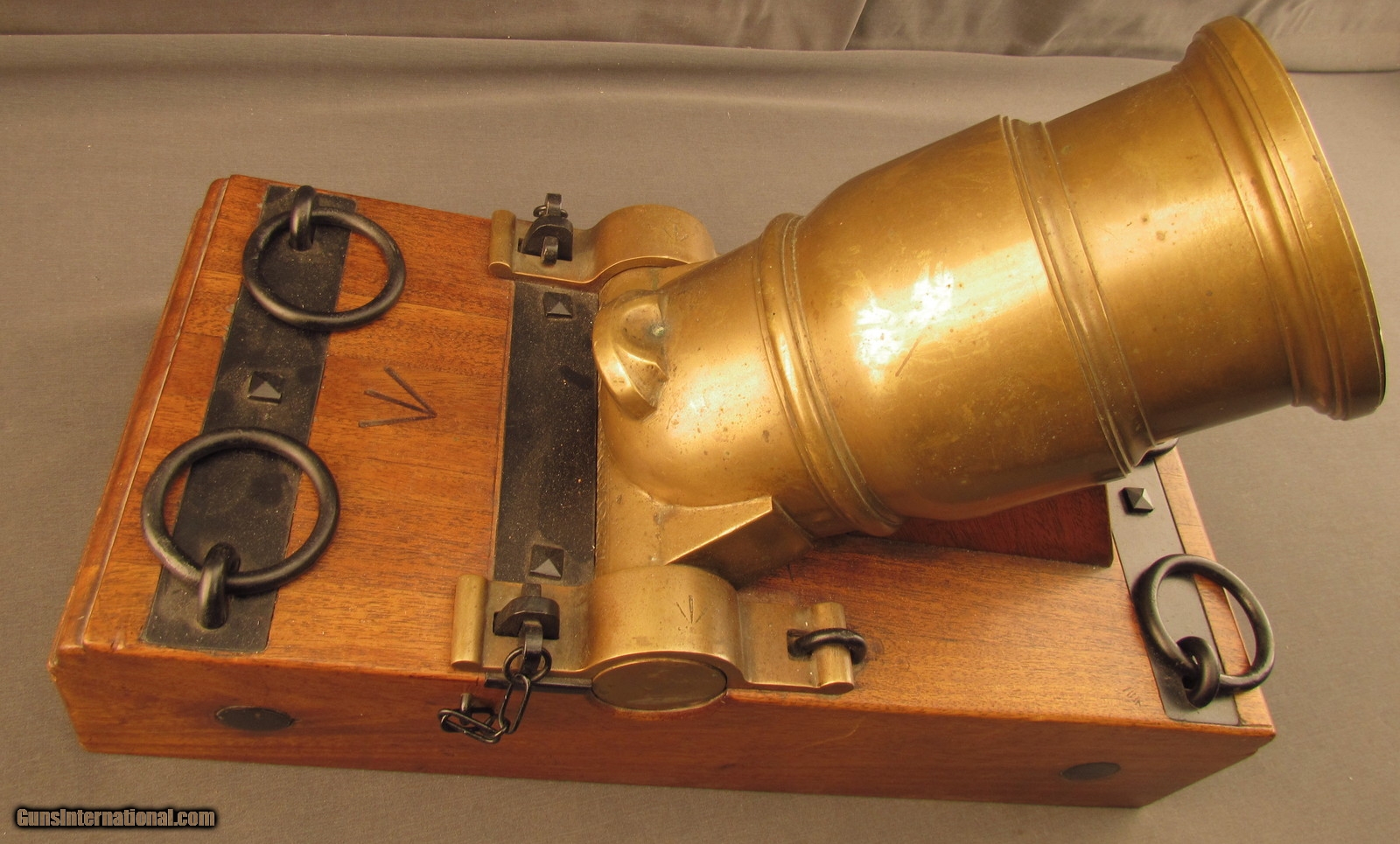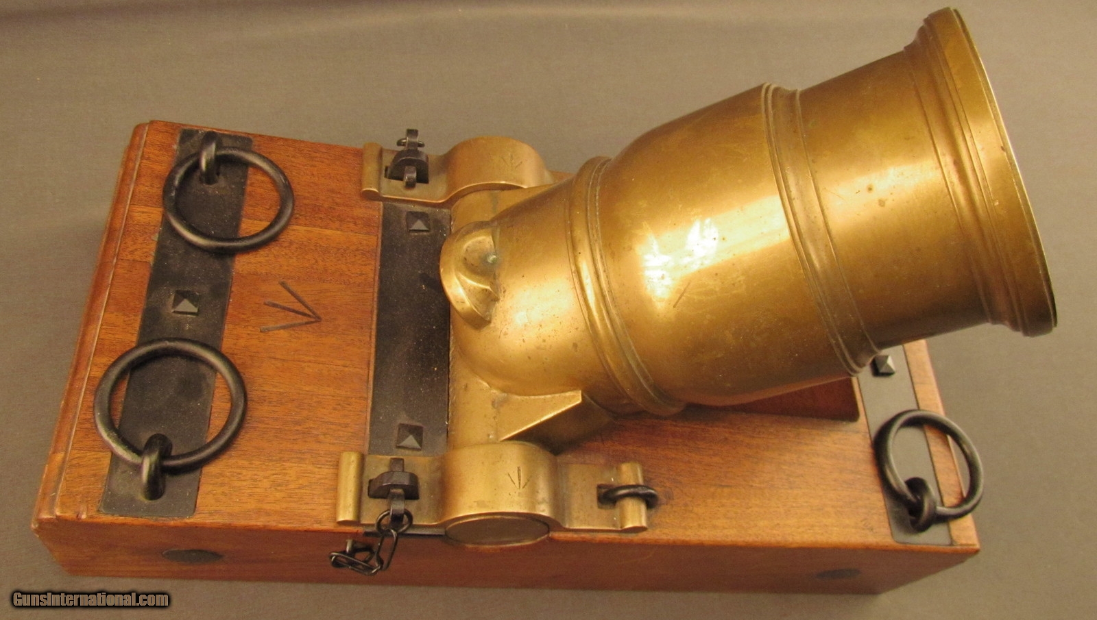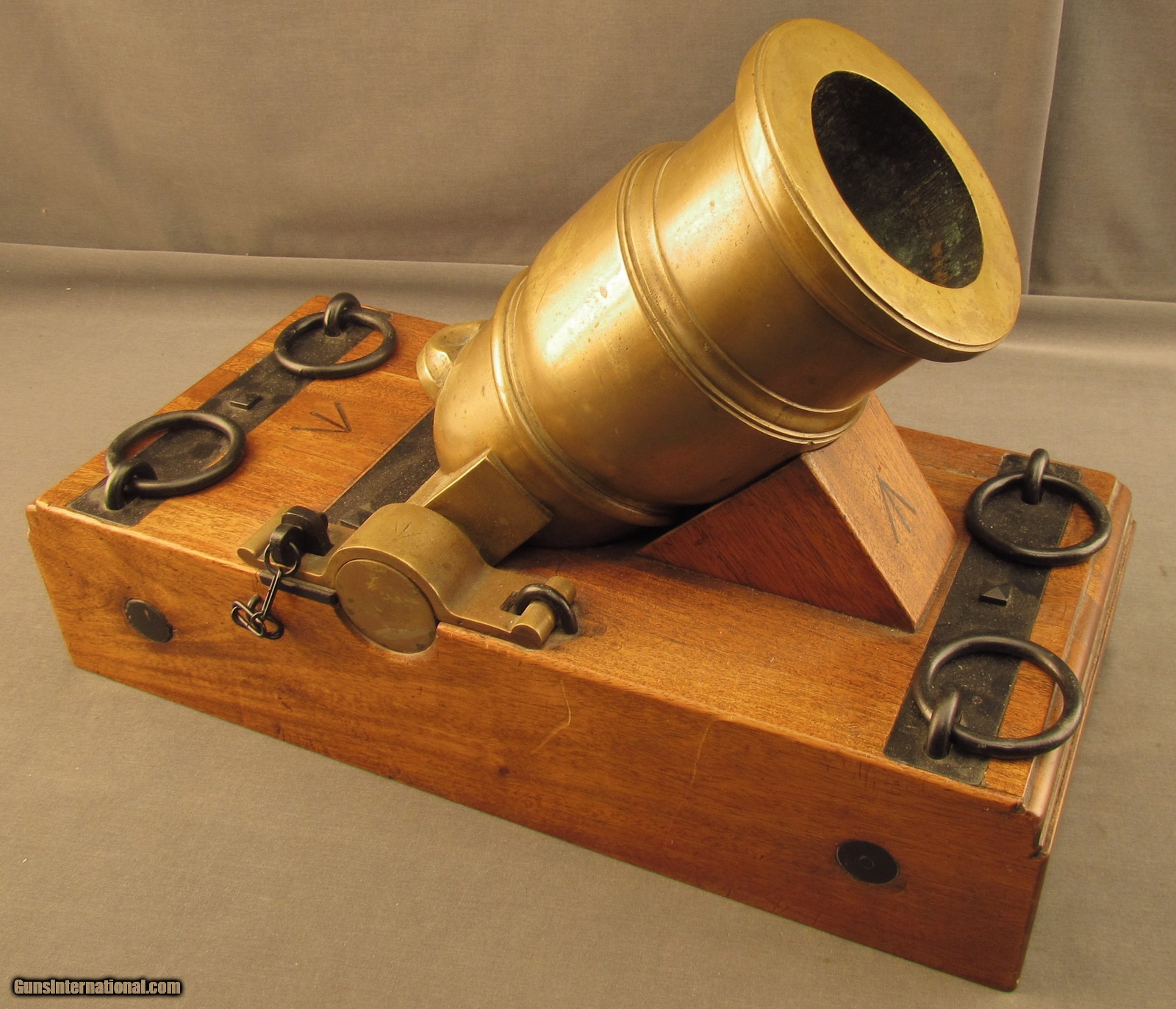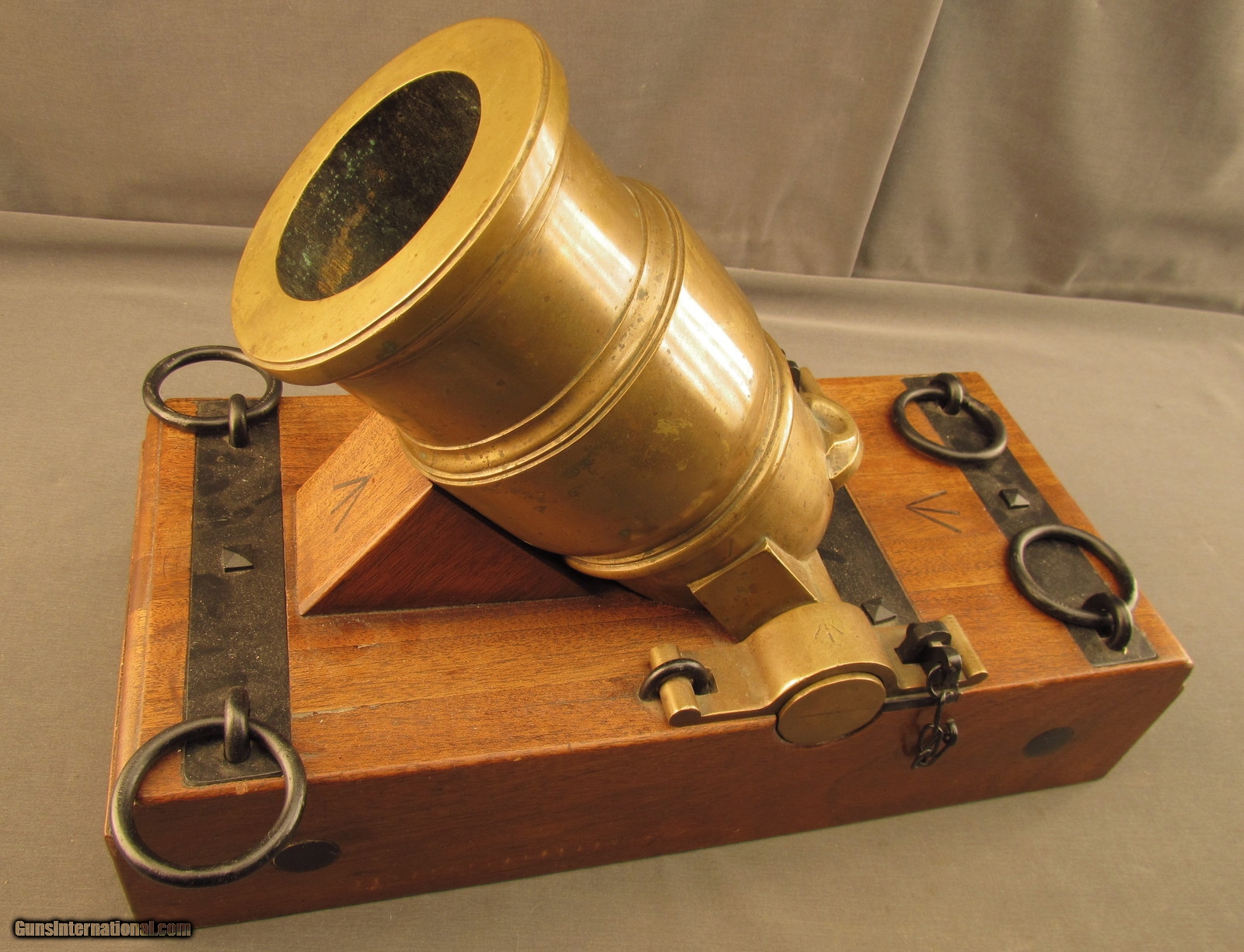 Description: This is a half-scale version of a British 12-Pounder Coehorn Mortar and has an 11 1/4" long, slightly bell-shaped bronze tube with 3 5/8" bore (92mm; approx. 6-Pounder). The metal has a dull but attractive yellow-ochre patina throughout with mild green verdigris visible within the bore. The tube rests on a rectangular wooden base that measures 19 1/2" x 8 3/4" x 4 1/2" with large Broad Arrows on the barrel rest and behind the trunnions. The black metal fittings and furniture are in excellent, little-used condition and a replica, non-metal spherical "shell" is included (the inert "fuze" has fallen into the shell cavity). This is a splendid firing replica of a Coehorn mortar and would make a great decorative piece for a gunroom or study. Antique SOLD Antique: Yes Manufacturer: Coehorn Model: Mortar Caliber Info: 92mm Gauge Info: 92mm |