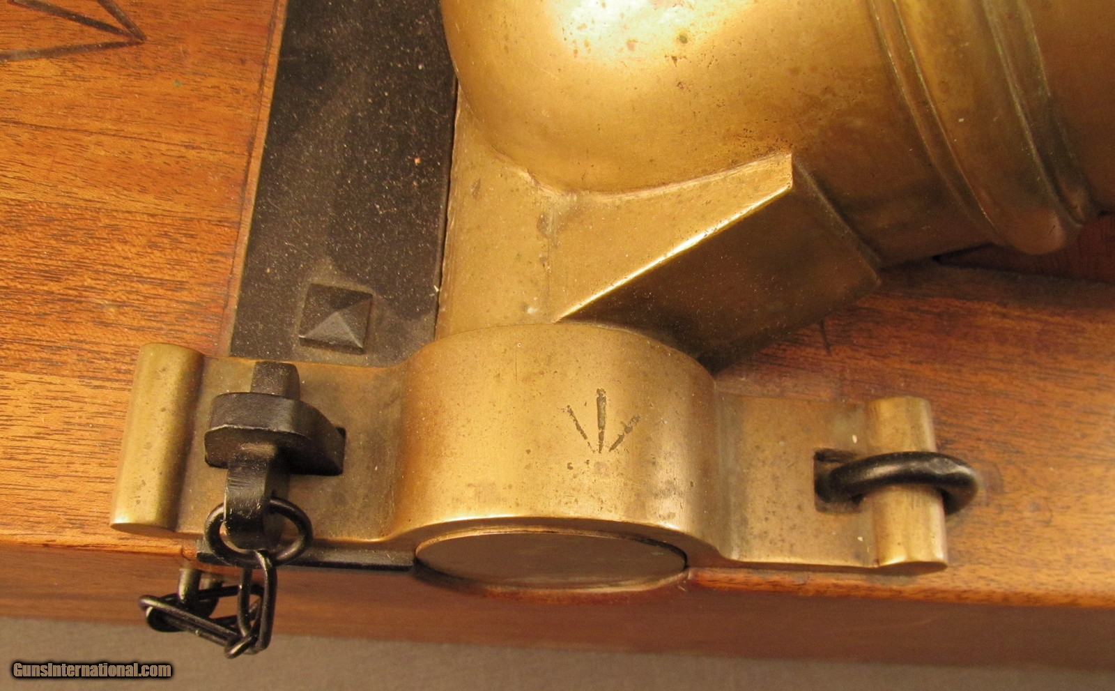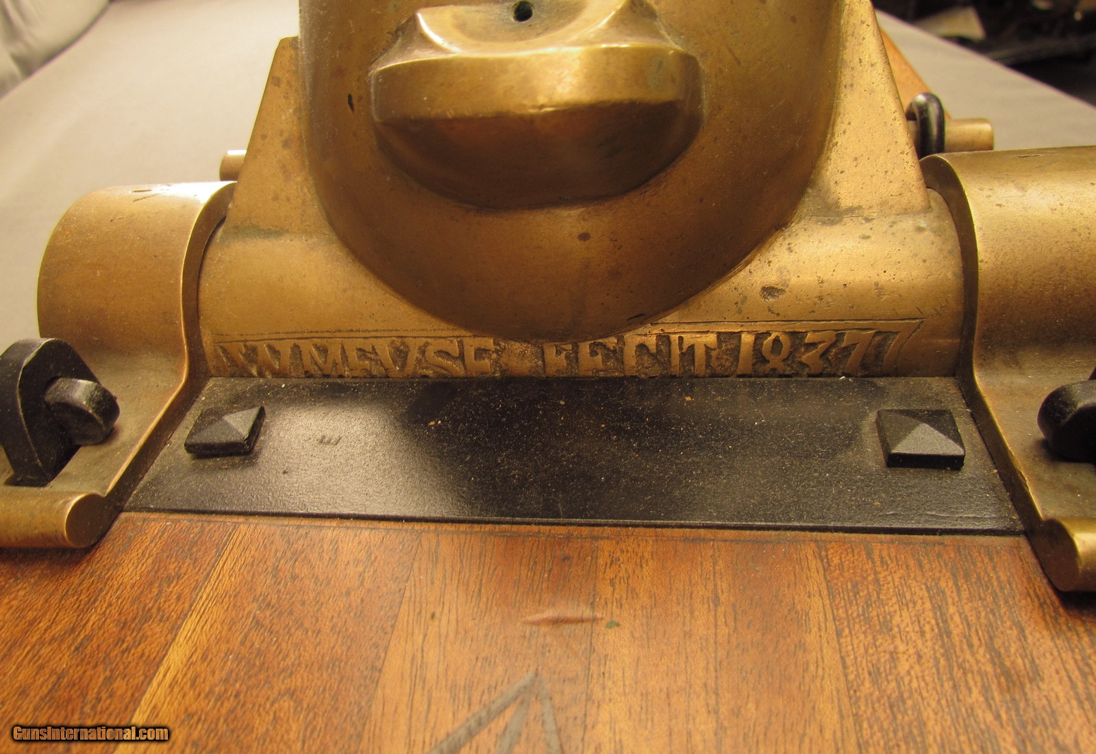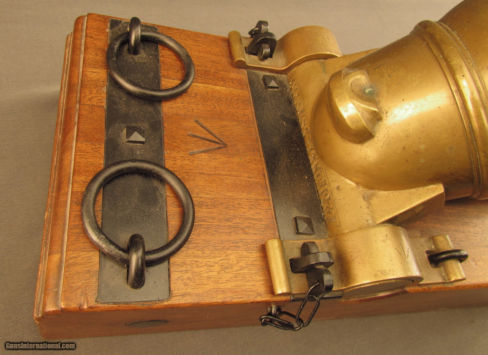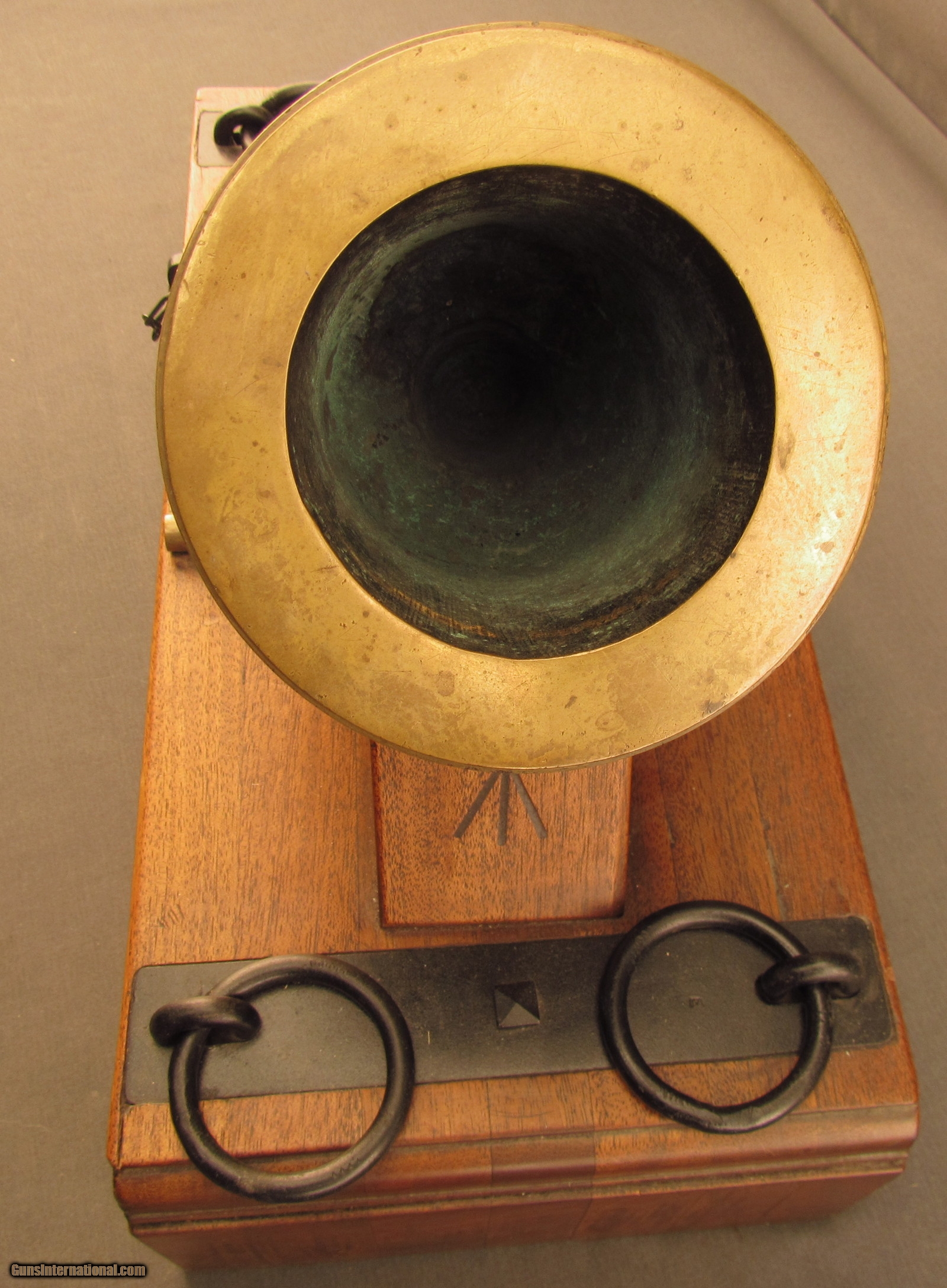 Description: This is a half-scale version of a British 12-Pounder Coehorn Mortar and has an 11 1/4" long, slightly bell-shaped bronze tube with 3 5/8" bore (92mm; approx. 6-Pounder). The metal has a dull but attractive yellow-ochre patina throughout with mild green verdigris visible within the bore. The tube rests on a rectangular wooden base that measures 19 1/2" x 8 3/4" x 4 1/2" with large Broad Arrows on the barrel rest and behind the trunnions. The black metal fittings and furniture are in excellent, little-used condition and a replica, non-metal spherical "shell" is included (the inert "fuze" has fallen into the shell cavity). This is a splendid firing replica of a Coehorn mortar and would make a great decorative piece for a gunroom or study. Antique SOLD Antique: Yes Manufacturer: Coehorn Model: Mortar Caliber Info: 92mm Gauge Info: 92mm |