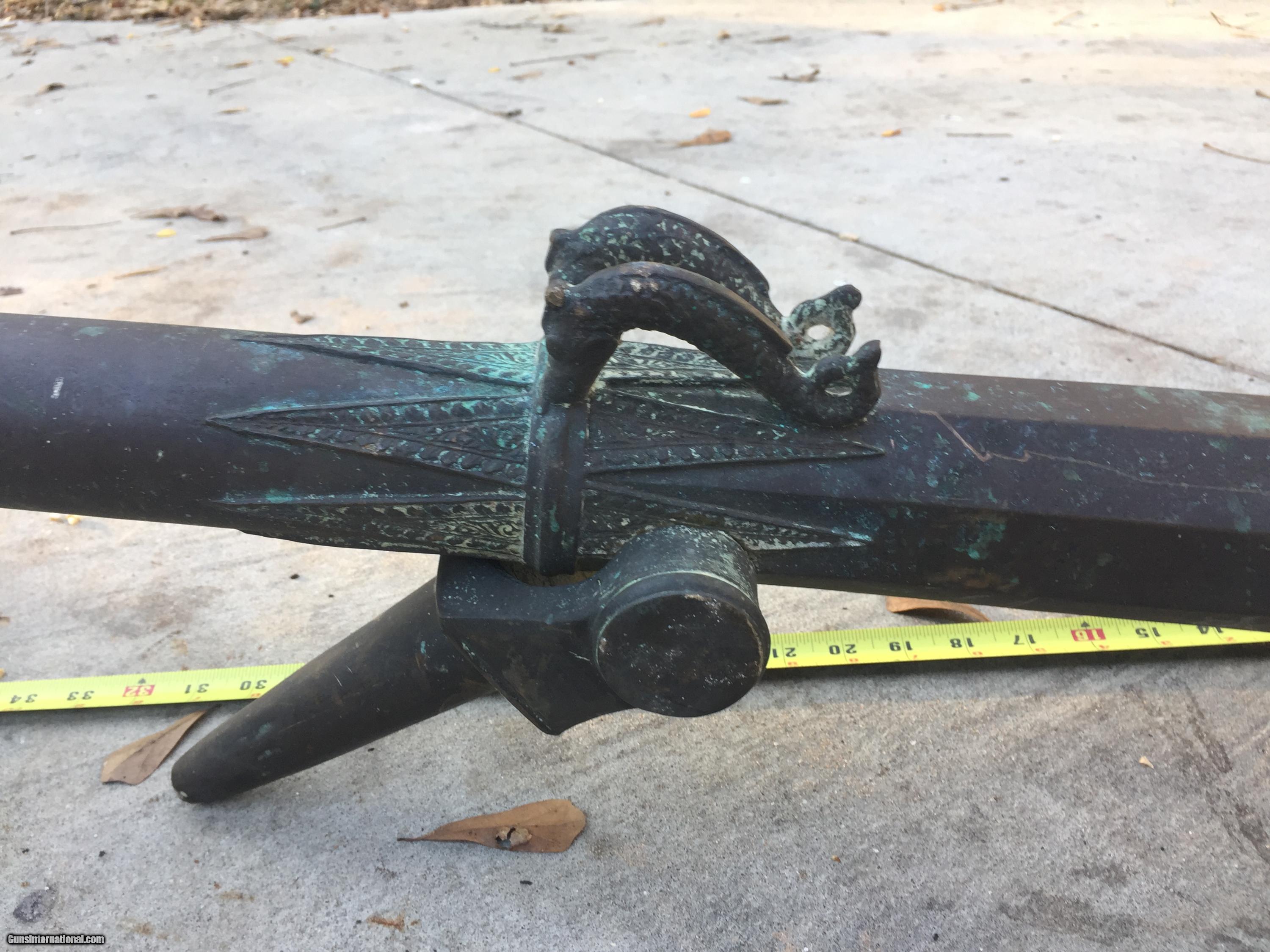 Description: APPRAISED ON "ANTIQUES ROADSHOW!!" VALUED AT $3500+ AT !!! AN ANTIQUE 16TH/17TH CENTURY, LANTAKA CANNON, WITH GREAT PATINA AND BRONZE CROCODILE AND DOLPHINE CASTING. THE CASTINGS AND DESIGN INDICATE AN EVEN EARLIER DATE AND CAST IN MALASIAIT MEASURES 46" END TO END AND WEIGHS 76 LBS. THE MUZZLE MEASURES approx. 28-30MM. THE LANTAKA WAS POPULAR IN THE EAST INDIES. THEY WERE MOUNTED ON SHIP DECK RAILS AND SHIP'S BRIDGES, TO BE TRAINED ON ENEMY BOARDING PARTIES AND AS ANTI PERSONNEL DEFENSE. A VERY RARE ITEM AND IN EXCELLENT CONDITION OVER ALL. IT WAS NOT DESIGNED FOR SOLID BALL SHOT BUT FOR ANTI PERSONNEL SCATTER SHOT. THE BORE IS CLEAR, AS IS THE MATCH IGNITER HOLE. IT MAY STILL FIRE BUT IT HAS NOT BEEN TESTED. NO CREDIT CARD FEES - FFL NOT REQUIRED! "REASONABLE OFFERS CONSIDERED!" SOLD Antique: Yes Manufacturer: MALASIAN Model: RAIL GUN Serial Number: NONE Caliber Info: 28MM Condition: EXCELLENT Metal Condition: BRONZE PATENA Finish: BRONZE Weight: 76 LBS Engraving: CROC & DOLPHINS |