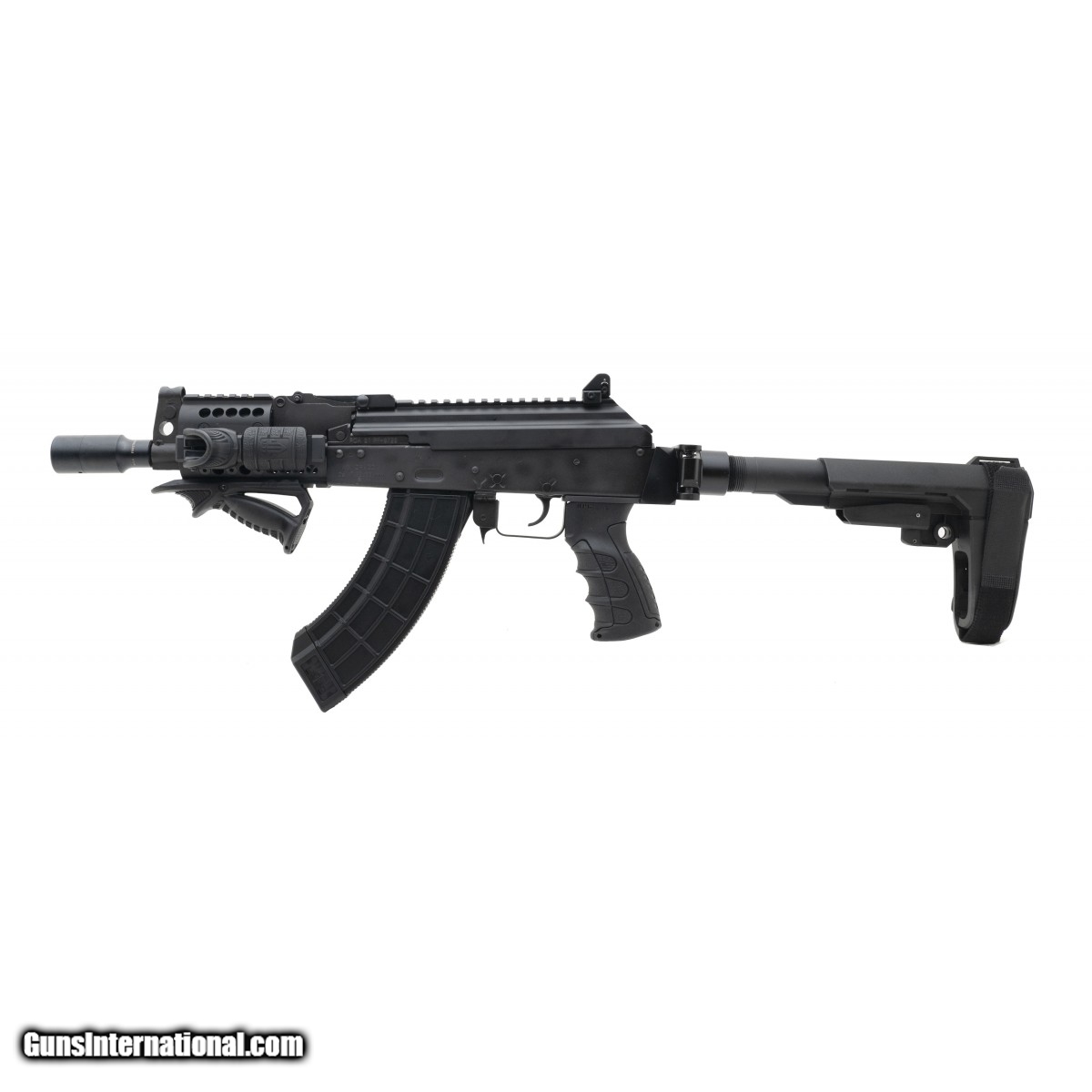 Description: " Semi-auto AK pistol in excellent condition. Comes with a SB tactical brace, a side folding adapter, a UPG pistol grip, a Texas weapons systems dust cover, a Midwest industries quad rail, a Fab defense PTK, a TSS firestrike II and the box. SOLD |