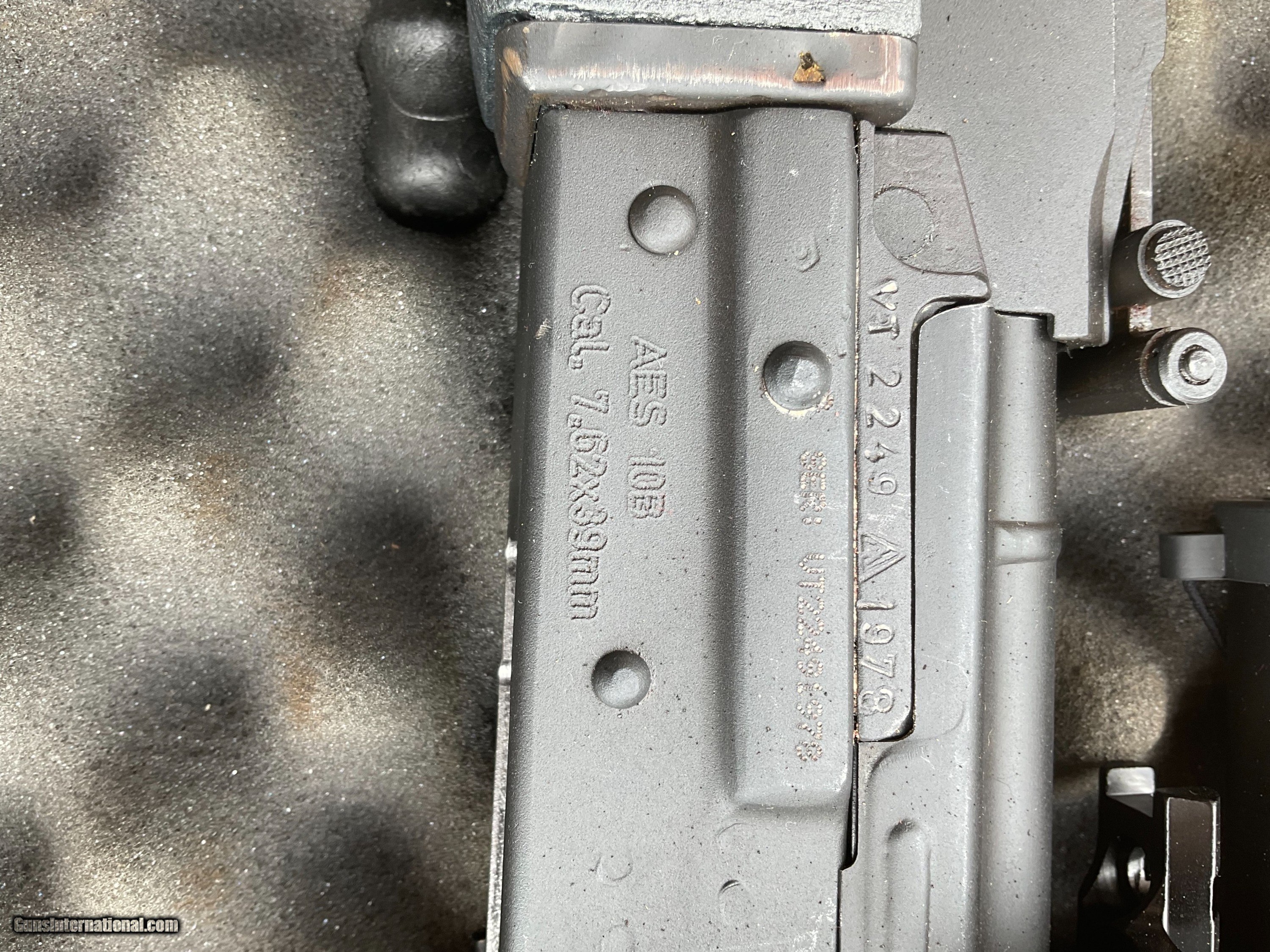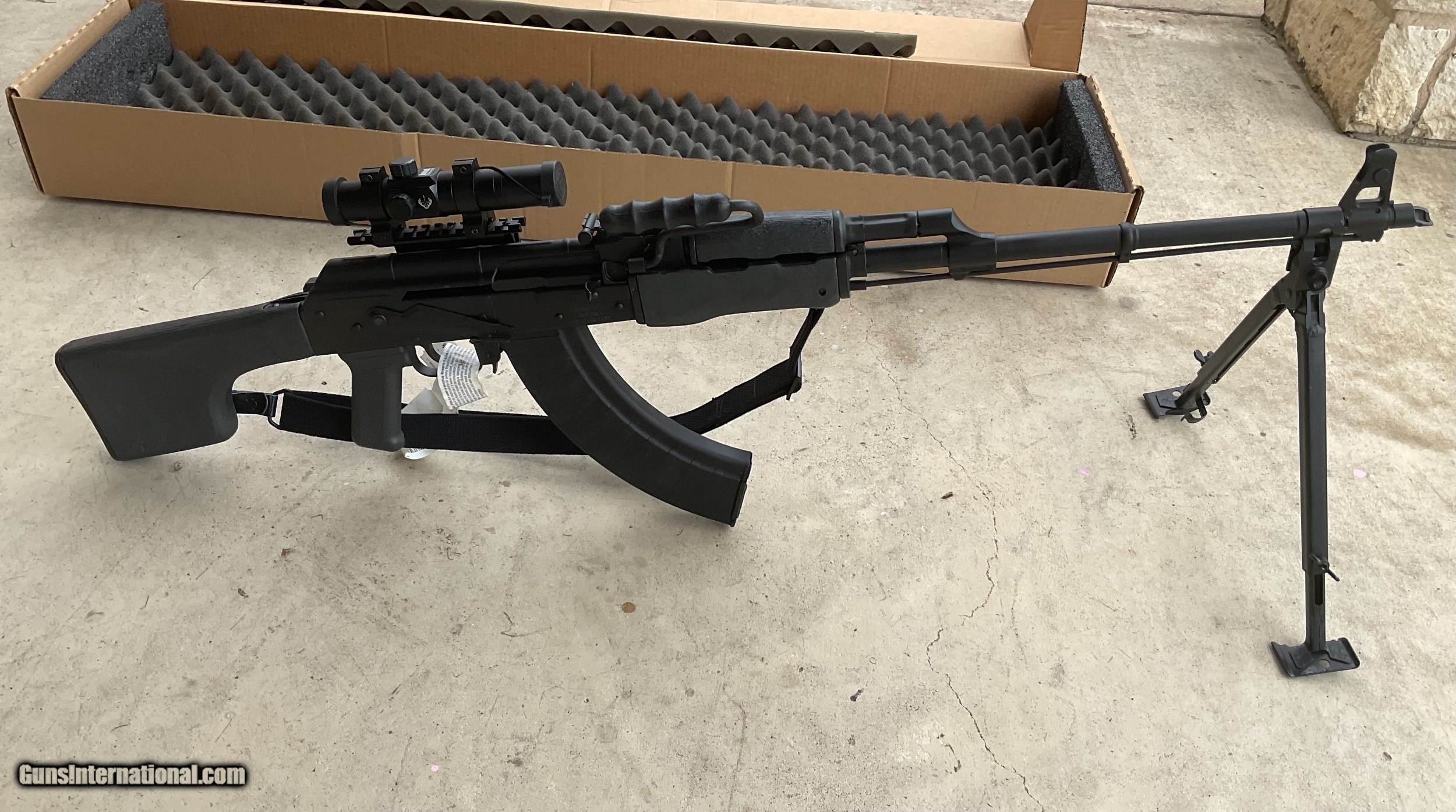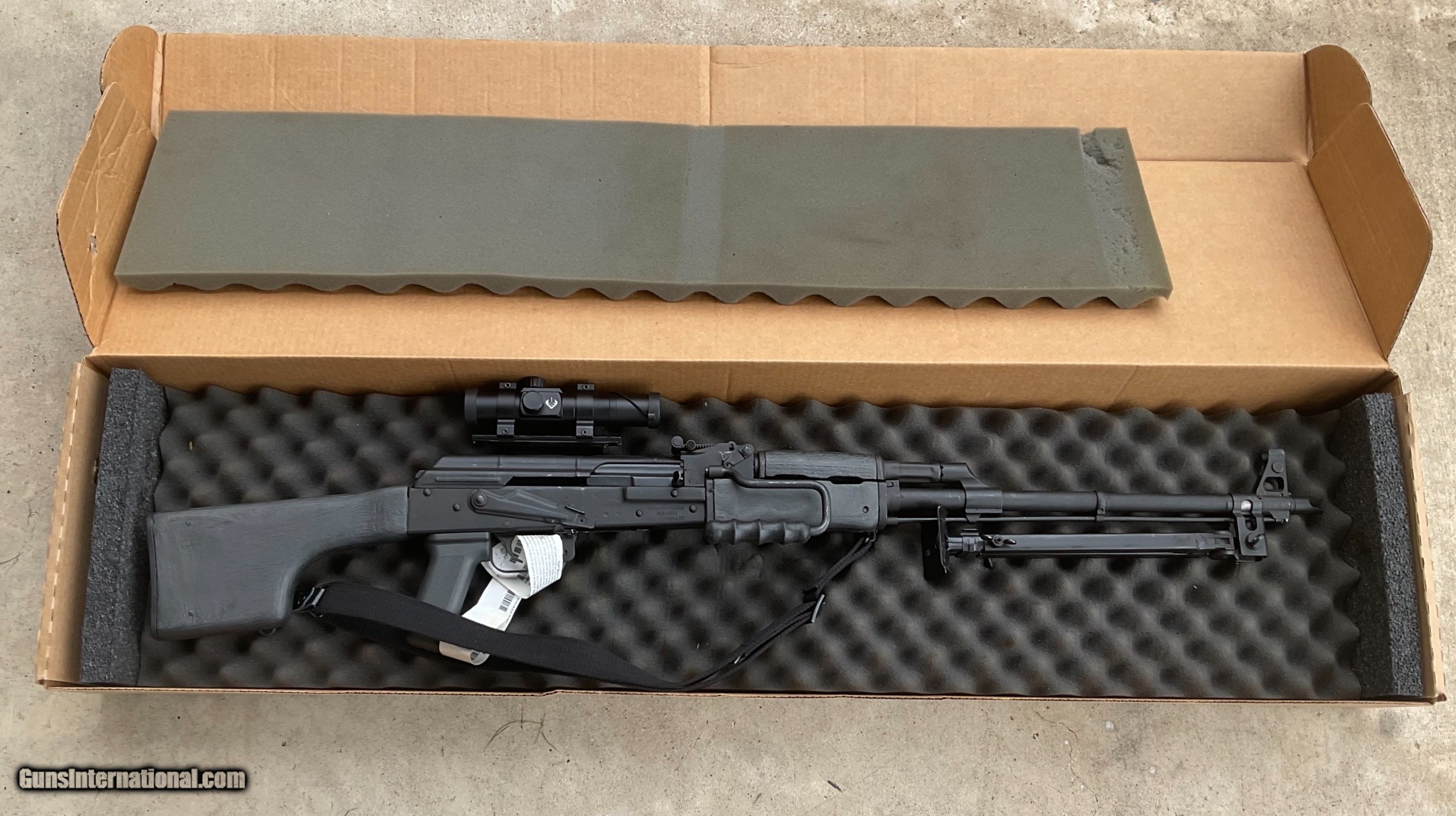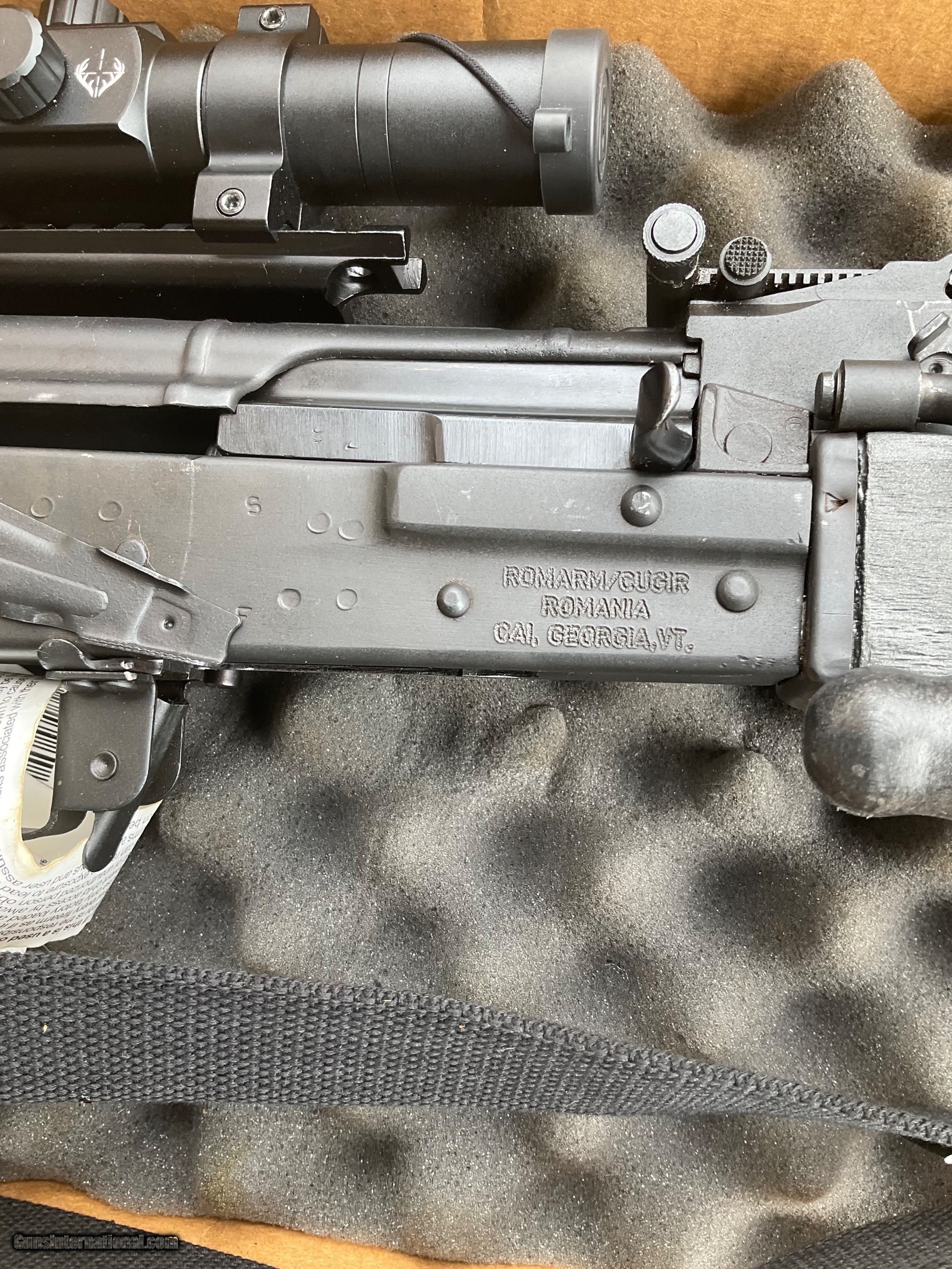 Description: Up for sale is a Century Arms International ROMARM/CUGIR authentic original Romanian AES-10B RPK still in the box with a side mounted rail and Bushnell Scope. In 2011-2012 Romanian receivers were used and assembled by the Romanian military armours. This one was purchased in 2012. The receiver was opened up to accept a double stack magazine by Century Arms. The trunnions, bolt carrier and bolt has matching numbers. Hammer forged chrome lined barrel. It has an adjustable bi-pod that can be removed. The wood furniture is finished in a midnight black. It also has a side carry handle which makes transportation a breeze. These are in short supply, get one this before it's gone. Free shipping in the continental US. SOLD Rifle Caliber: 7.62x39mm |