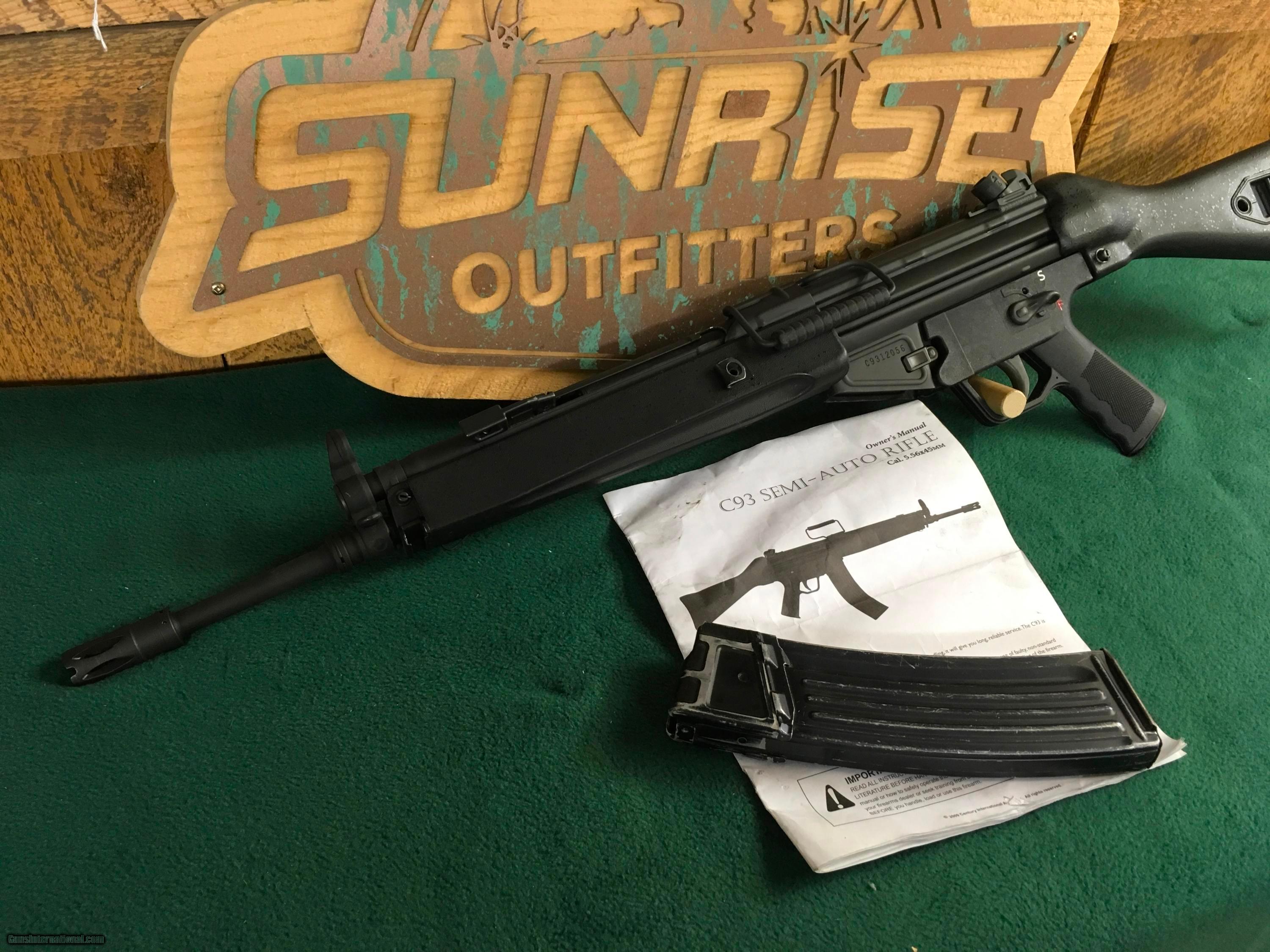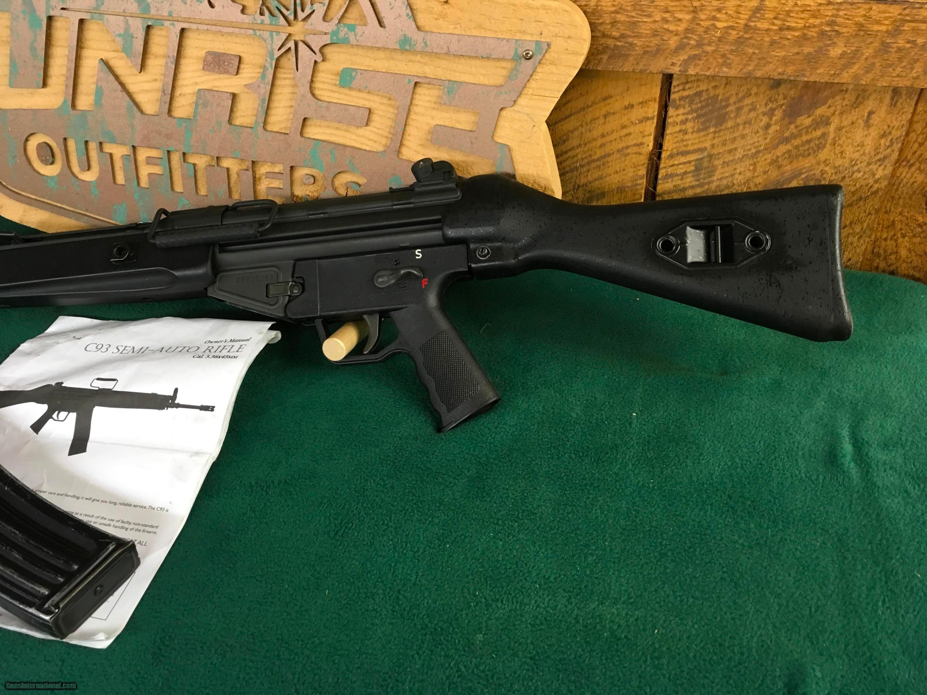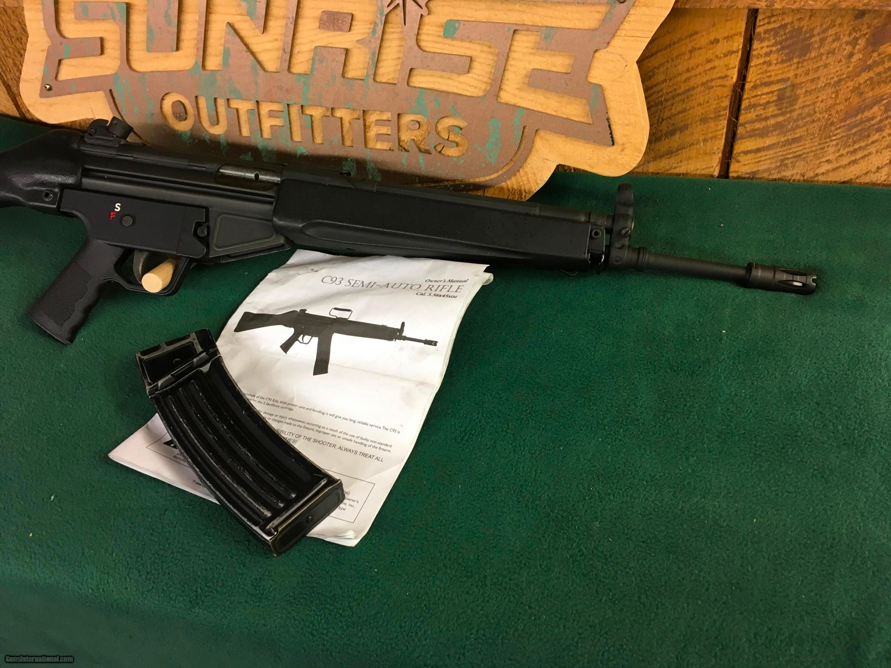 Description: Century Arms C93 Sporter in .223 caliber. It is my understanding these guns were bought and shipped to the U.S, where U.S made trigger groups were installed. This qualifies them as having enough U.S parts so they can be sold here. This is nothing but a HK93 only in semi automatic form. The condition is very good to excellent. Comes with a HK 40 round mag and owners manual. Good buy! SOLD |