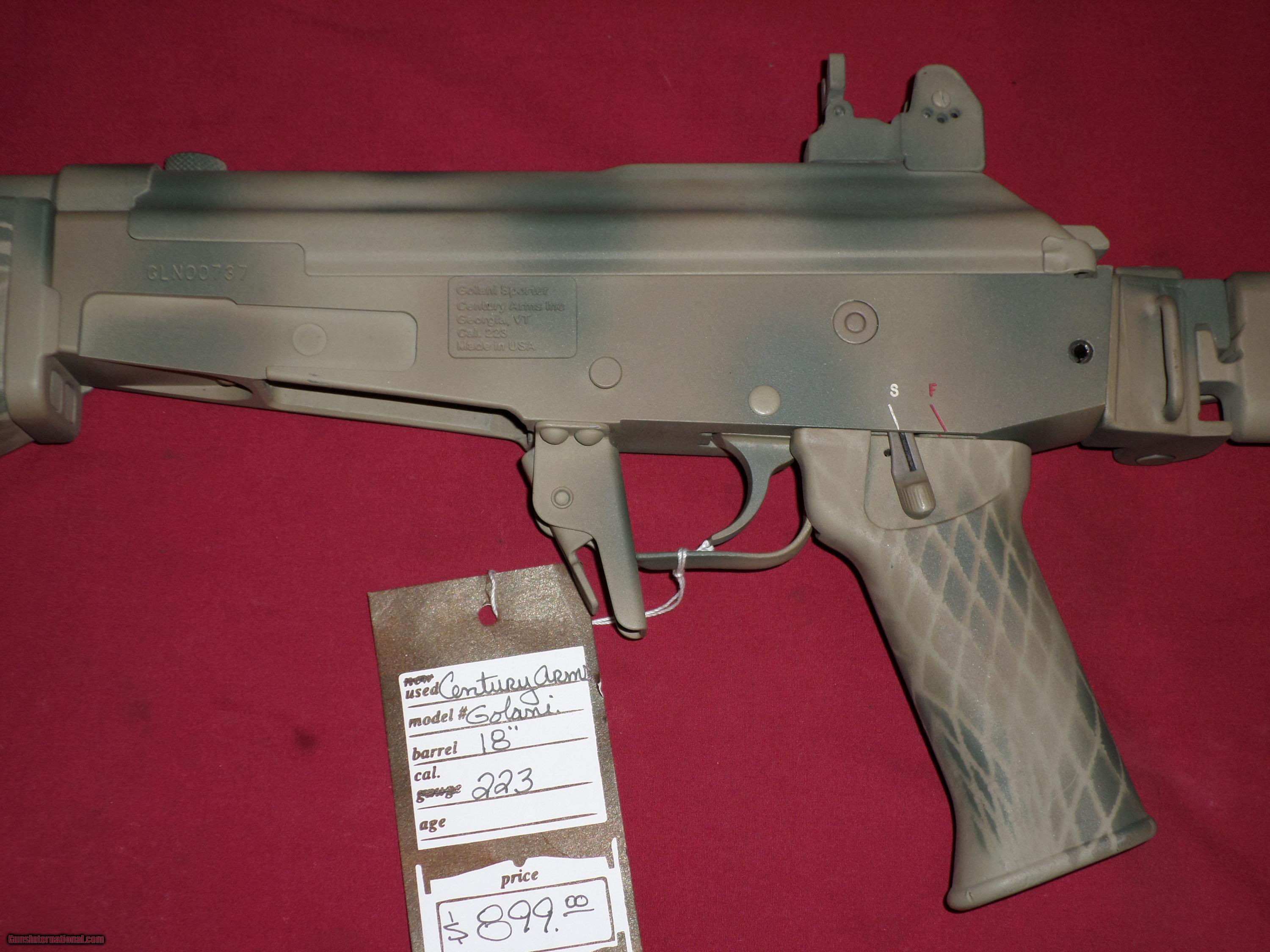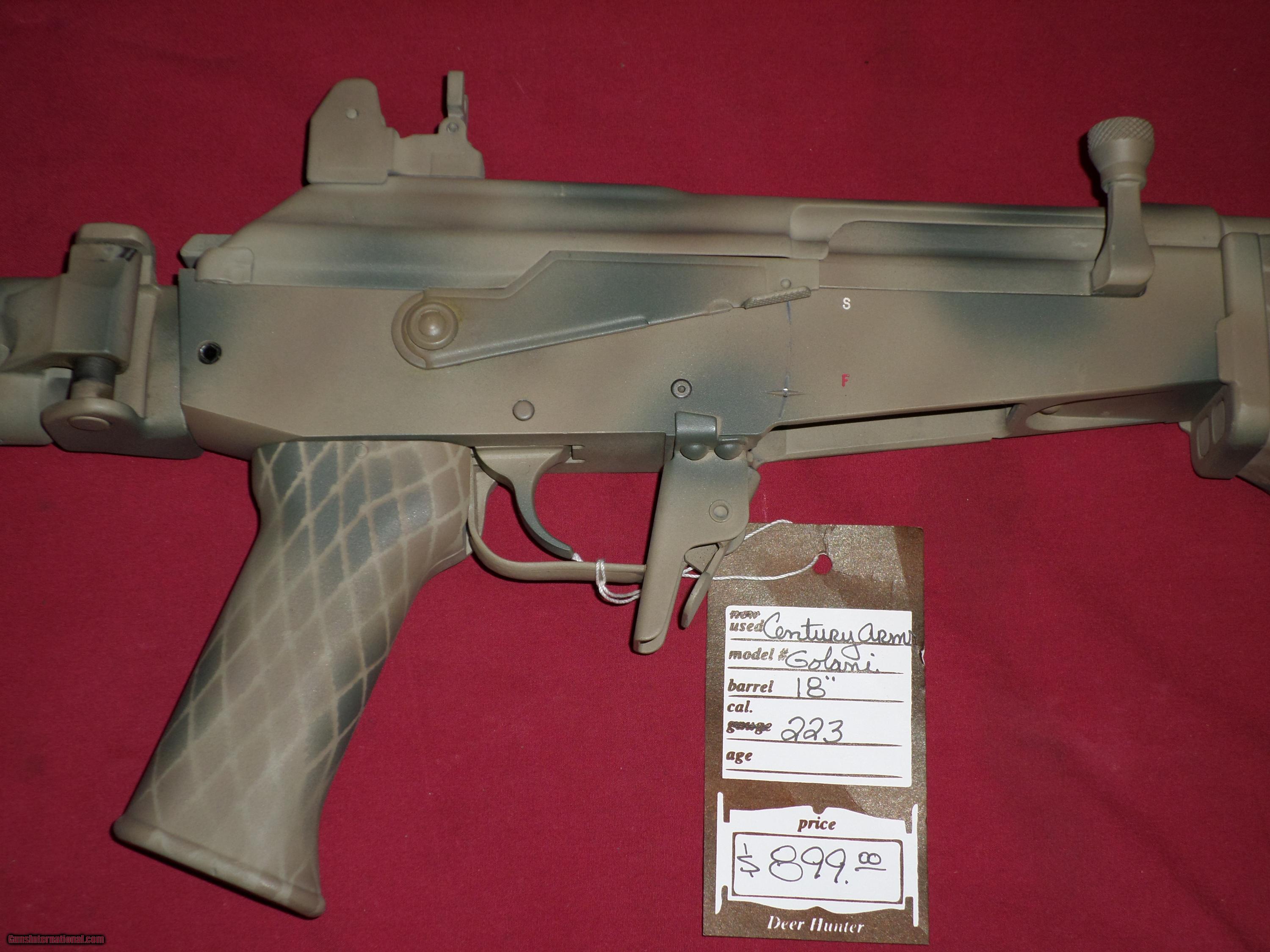 Description: SOLD For sale, Century Arms Golani, side folder, camoflage cerakote finish. Aside from finish, all original, and in excellent condition. SOLD To see more of our inventory, visit deerhunterguns,com We accept MC, Visa and Discover, no AmEx. No Sales to California. Like us on Facebook: Deer Hunter Guns SOLD |