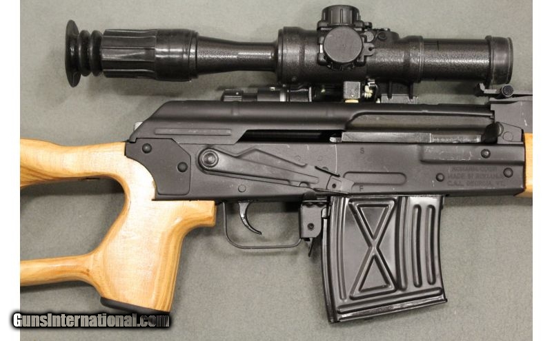 Description: A ROMARM / CUGIR PSL 54 Rifle in 7.62x54R. Made in Romania, and imported by Century Arms, the PSL 54 is a Romanian military designated marksman rifle. The PSL-54 features a 24 1/2 inch chrome lined threaded barrel. The front trunnion is a RPK-style due to the high power 7.62x54R. The rifle has laminated wood furniture and a thumbhole stock. Chambered in 7.62x54R, the PSL is able to engage targets at extended ranges. This rifle is in very good condition with some wear on the receiver from movement of the safety and comes with the Russian PO 4x24 scope with quick detach mount,1 10 Rd. magazine and box. SOLD Manufacturer: Serial # S-6519-XX Caliber Info: 7.62x54R Chambers: Semi-auto rifle. Metal Condition: Very good, wear from movement of safety and sight adjustment. Wood Condition: Excellent. Bore Condition: Excellent. Barrels: 24.5" Chrome lined threaded barrel with muzzle break. Triggers: Single black metal. Stock: Laminated wood thumb hole stock. Stock Dimensions: 12 3/4" LOP. Fore End: Laminated wood. Butt Pad: Metal but plate. Weight: 11lbs, 2oz. Sights: Elevation adjustable rear and fixed front sights, PO 4x24 scope. Item Location: Acworth, GA |