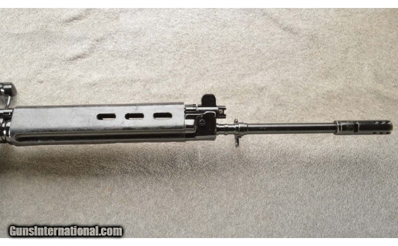 Description: L1A1 parts set assembled by Century Arms on a "Hesse" FN style receiver. 21" round barrel with adjustable post front sight, and flip-up style rear peep sight. Multi-port flash hider. Hand-adjustable gas port. Swiveling Belgian style carrying handle. Thumb safety on left side trigger housing. Gloss-black metal finish. Black synthetic, ventilated hand guards, smooth black stock and pistol grip. Overall this L1A1 is in very good condition. .308 Winchester SOLD Chambers: "Semi auto, 20+1 removable magazine. Metal Condition: "Refinished, Gloss black finish shows various nicks and scratches through out. Bore Condition: Strong and shinny. Barrels: 21" barrel. Triggers: Single. Stock Dimensions: LOP14.25". Fore End: "Synthetic, ventilated. Butt Pad: Black rubber. Weight: 10.5 lbs Sights: "Adjustable front post, adjustable rear peep. Item Location: Owatonna, MN |