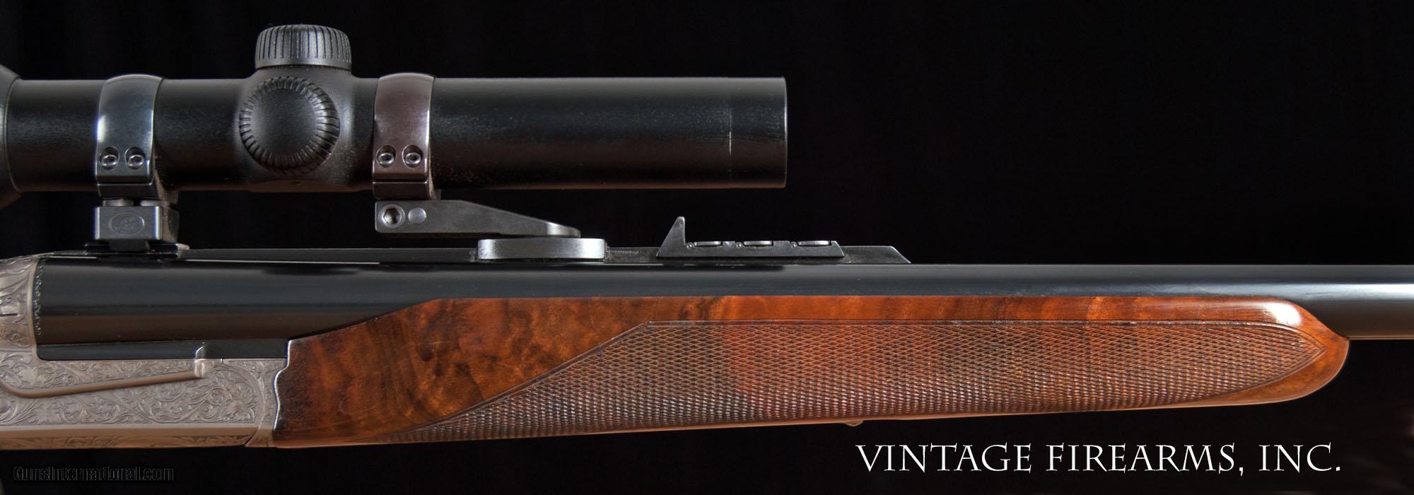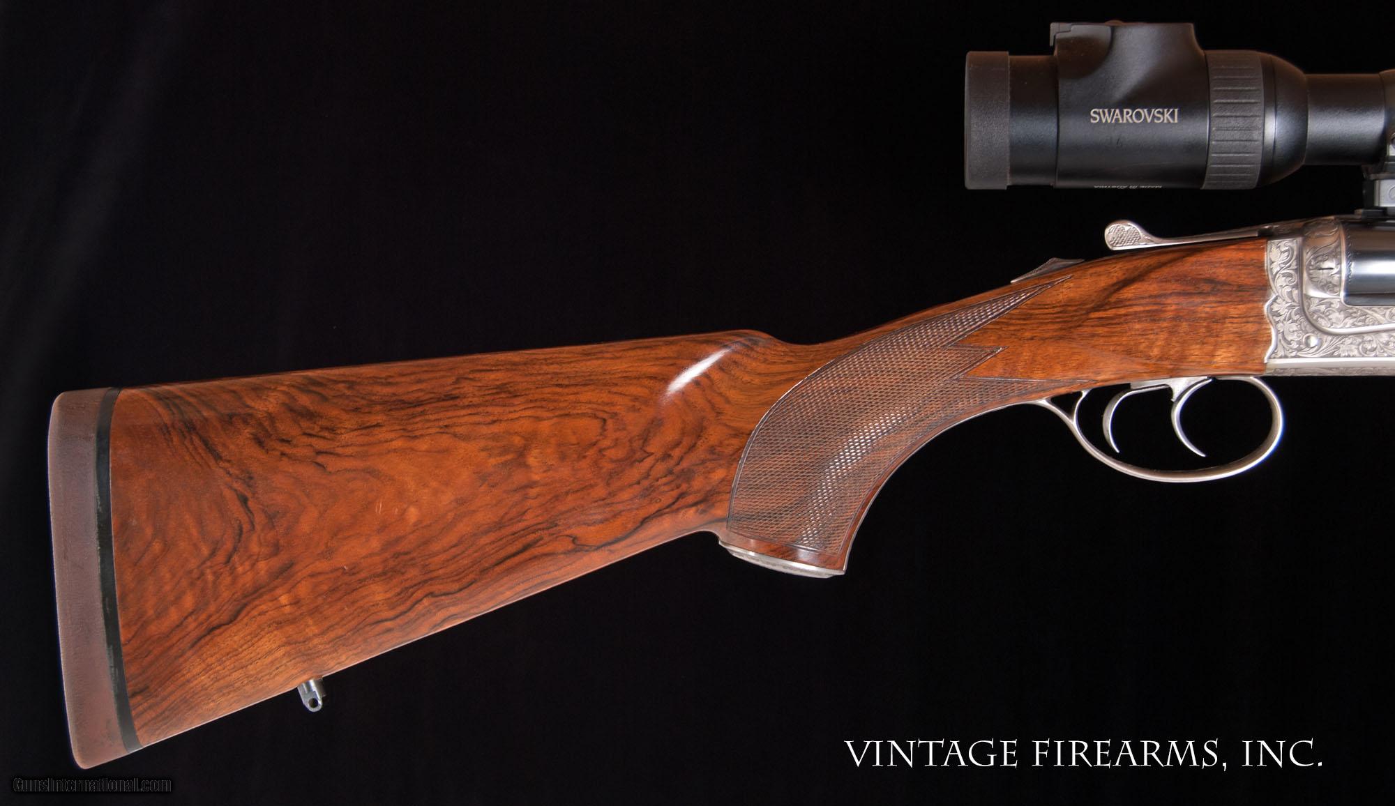 Description: Chapuis African PH II .470 Nitro Express Rifle SWAROVSKI SCOPE, AFRICA PROVEN General Specs: Chapuis Model Brousse, Year 2000's, 470 nitro express, 10 1/2 lbs with scope, Side-by-Side Rifle Serial Number: 45359 The Chapuis Model Brousse (same as African PHII) in 470 Nitro Express with 23 5/8" Ejector Barrels with Quarter rib 1 standing & 3 folding sights, Double triggers, Bolstered frame, Bushed strikers, Scalloped action back, Beavertail forend, Open pistol grip stock, Cheekpiece, Steel engraved grip cap, Rolled trigger guard edge with the strap to the grip cap plus 3 tiedown screws in the guard strap, precision quick detachable scope mounts, Swarovski Z6i 1-6 X 24 EE scope ($2500 scope!). This gun is in 99% condition and has made 2 trips to Africa with 4 Water Buffalo dead on the ground accredited to this rifle. Gorgeous highly figured wood laid out to perfection to take the heavy recoil from the .470 Nitro Express. There are a few light handling marks in the wood, but no dings or cracks. Bores are perfect, mechanics perfect. This gun is accurate with 1" groups shot offhand at 50 yards. There is a box plus a few extra rounds of Federal Cape Shock 500 grain Trophy Bonded Sledgehammer ammo that goes with the rifle. The scope is like new, with no marks and the locked in QD mounts return to zero every time you remove and re-attach the scope. This is a great African dangerous game rifle that has been proven under fire at least 4 times in the last 2 years. This outfit purchase new would exceed $17,500 in cost. We have this rifle and scope priced to sell, so don't let her slip by you! Thanks for looking. Barrels Barrel Length: 23 5/8" Bores: as new Bore Diameter: 0.47 % Blue: 99% Ribs: 1/4 rib with 1 standing sight, 3 folding Sights: 1 stnd; 3 fold calibrated to 300yrds, Swarovski Z6i 1-6x24 EE scope as new Action Action: tight, way right of center Ejectors or Extractors: ejectors Case Color: coin finish Screws: perfect Engraving: scroll and buffalo Trigger Type: double, crisp Trigger Guard Color: full tang coin engraved Stock Type: capped pistol grip/beavertail forend/ cheek piece LOP: 15 1/4" LOP To End Of Wood: 14 1/4" DAH: 2 1/2" DAC: 1 1/2" Cast: 1/4" off Checkering Condition: perfect Butt Treatment: decelerator There are more photos upon request. We offer a 30 day mechanical warranty on this fine shotgun. Call us for full details. PLEASE SEE MY OTHER FINE VINTAGE FIREARMS. Just open one of my ads and click on the line that says “see all items from this seller” and a very nice list of fine sporting and collectible arms will appear. I have many more fine sxs shotguns not yet listed. Thanks for looking! We employ a full time gunsmith on premises and can perform alterations to suit your needs within a few weeks of purchase. Payment Methods: Money Order, Certified Check, Personal Check, Wire Transfer Inspection Period / Return Policy: Three Days from the date the item was received. Sales Tax: 6% Michigan Only Shipping & Insurance: Ground $110.00 We ship internationally! Item Condition: Used Requires FFL?: Yes If you have any questions about this item or payment, please email or call us directly, at #616-292-6240. Thanks! Jay Shachter, Vintage Firearms, Inc SOLD |