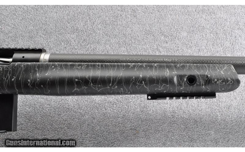 Description: For long range tactical and precision shooting applications. .338 MAG SOLD Chambers: .338 Norma Magnum Metal Condition: Appears in near new condition Wood Condition: Carbon fiber composite stock is in very good condition Bore Condition: Sharp & bright Barrels: 26" Carbon fiber with stainless steel side-baffle muzzle brake Stock Dimensions: Variable with supplied spacers Fore End: Flat bottom with accessory rail and QD sling mounts Butt Pad: LimbSaver Weight: 9 lbs. Sights: No sights, features an integral 20-MOA optics rail Item Location: Grand Junction, CO |