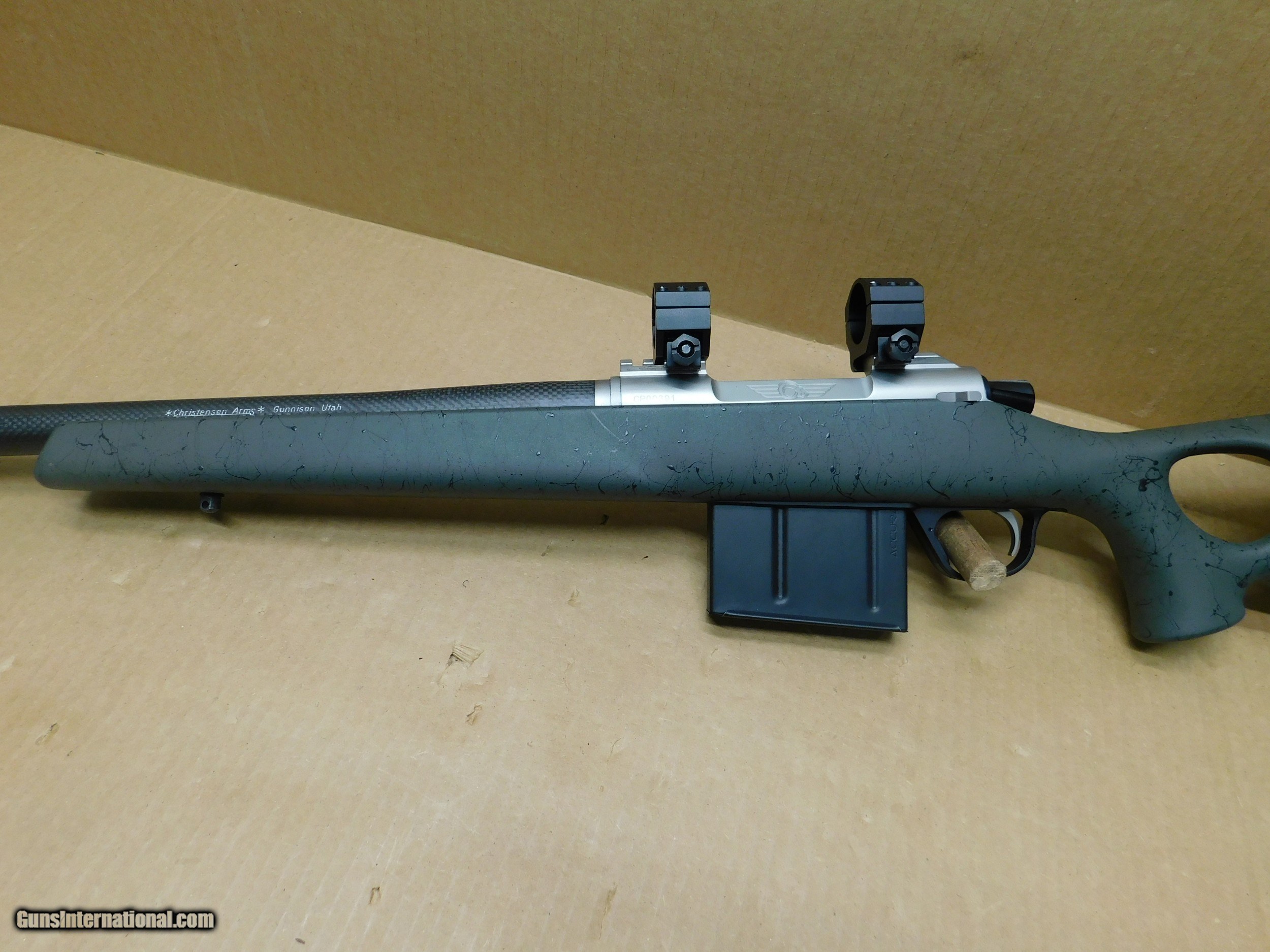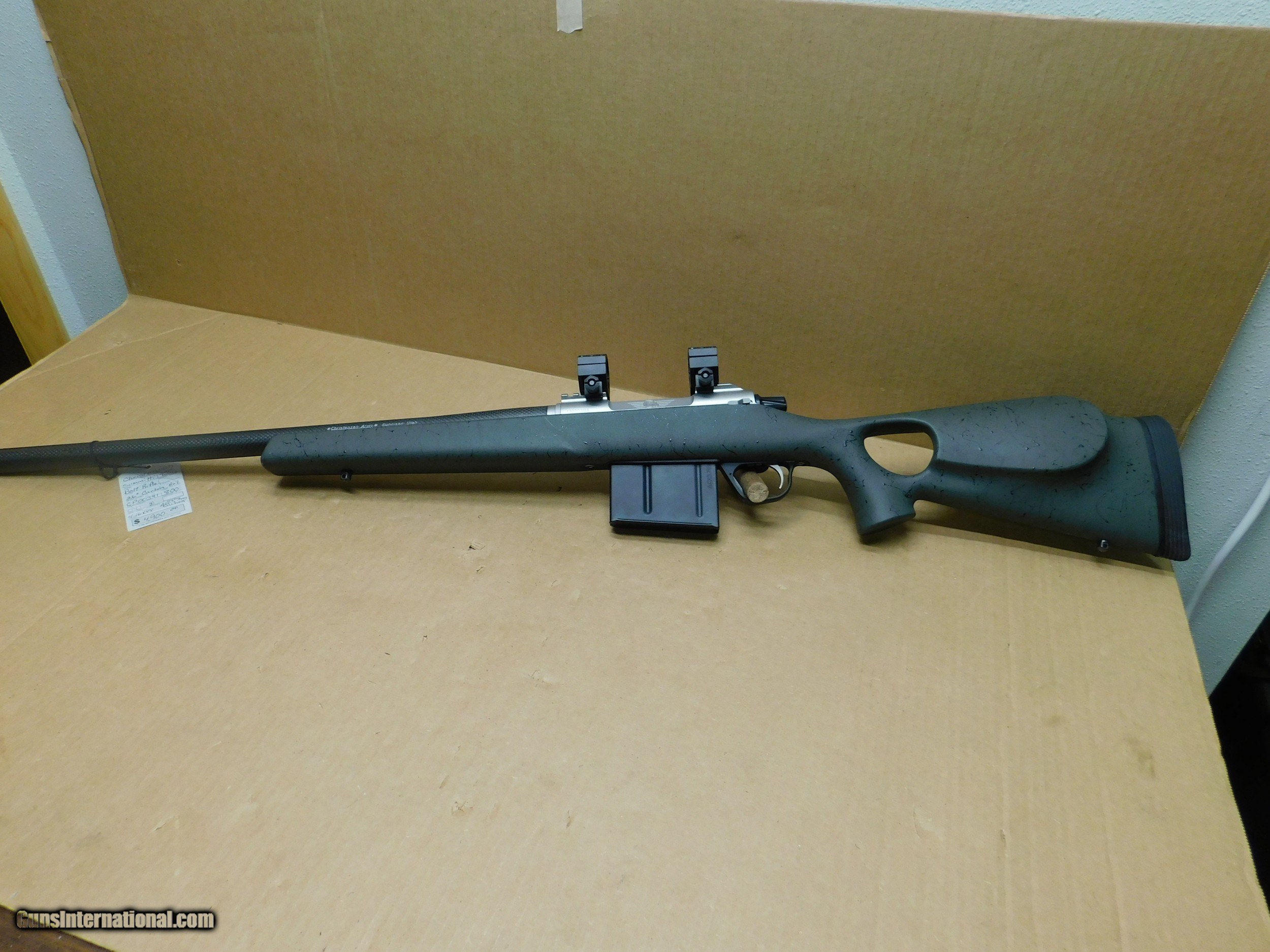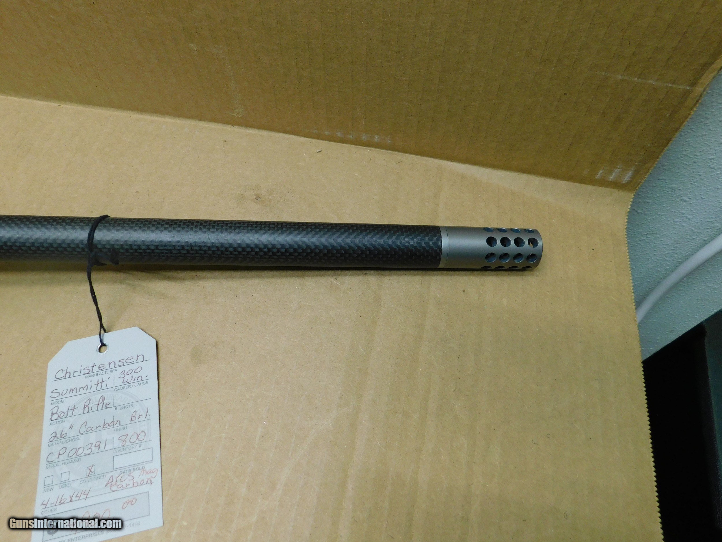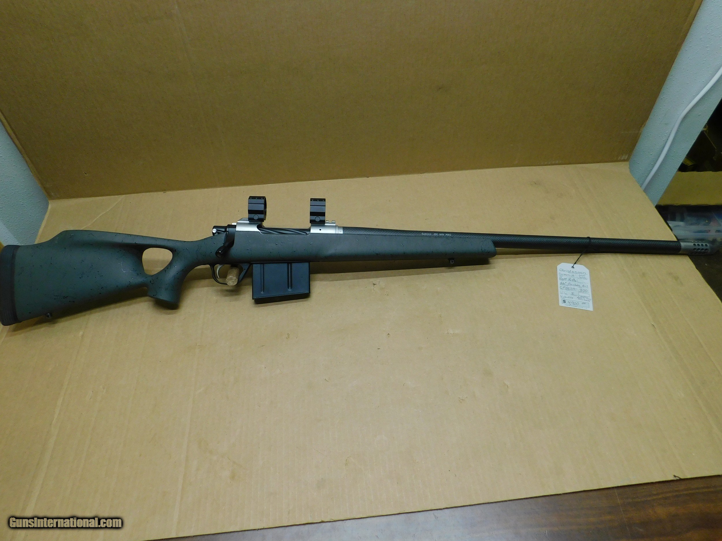 Description: This is a great one for your collection. It has had wonderful care. Christensen Arms, Summit Ti, 300 Win Mag bolt action rifle. Only 6.5 lbs. It has a 26" carbon fiber barrel with stainless boss and AICS carbon mag., Burris scope mounts. Stock is green with black webbing, limbsaver butt, thumb hole and check rest. SN-CO00391 $4,100.00 SOLD Manufacturer: Christensen Arms Model: Summit Ti Serial Number: CP00391 Caliber Info: 300 Win Mag Bore: very good Condition: Very good Metal Condition: very good Bore Condition: Very good Barrels: 26" Carbon Barrel Type: round Action: Bolt Triggers: adjustable Stock: Green w/black webbing Butt Pad: rubber limbsaver Finish: Carbon Fiber Sights: None Extras: stainless boss-AICS mag |