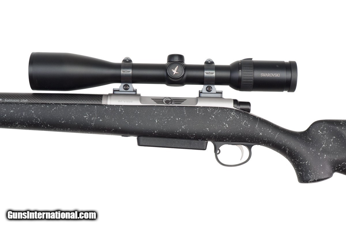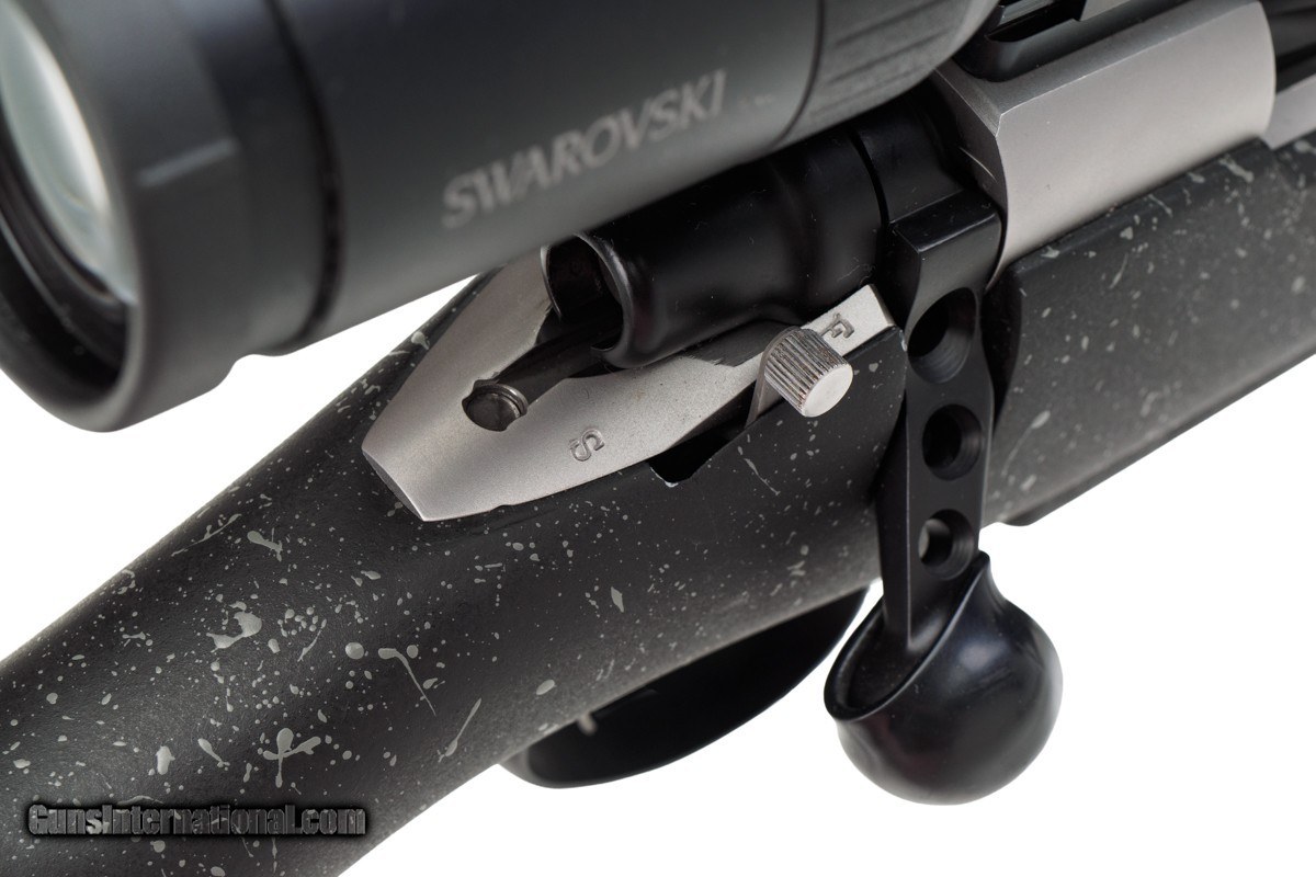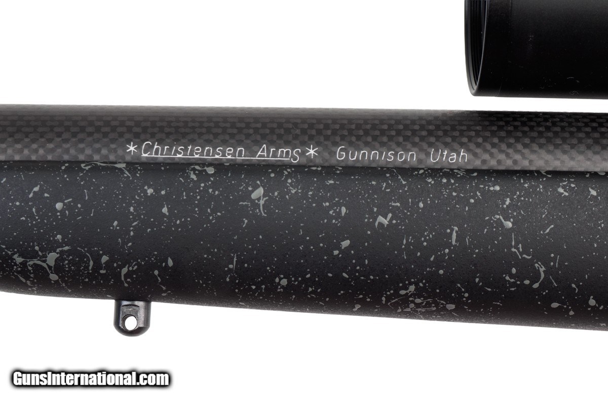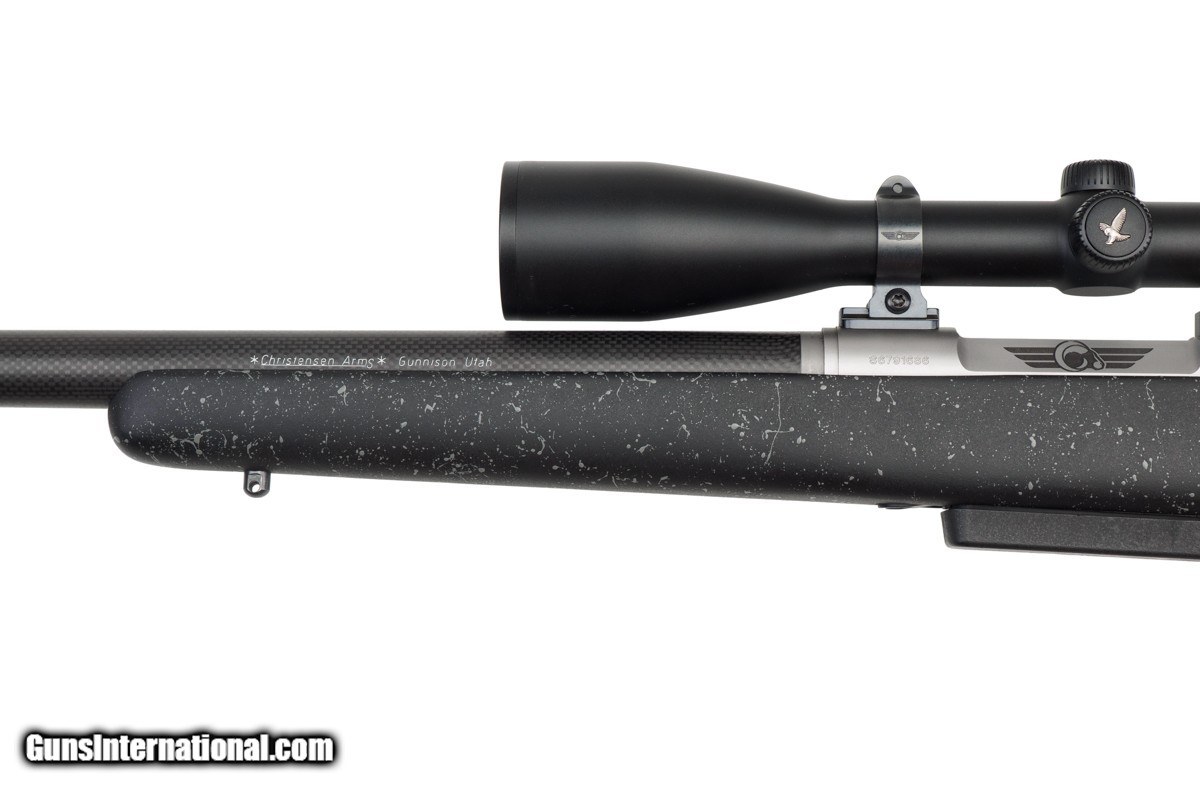 Description: STAINLESS-STEEL RECEIVER, 26" CARBON-WRAPPED BARREL, MUZZLE BREAK, SWAROVSKI Z6 3-18 x 50P SCOPE , CARBON FIBER STOCK, PISTOL HAND GRIP, 13-1/2" LOP, RUBBER PAD, 8 LBS. - 15-7/8 OZ. Bolt-action rifle designed for high-altitude, long-range shooting chambered for the .338 Lapua magnum cartridge. The 26" match grade, hand lapped, carbon-wrapped, free-floating barrel is fitted with a 2" threaded titanium muzzle break giving a total barrel length of 27-1/2". Built on Christensen Arms Remington Model 700 based stainless-steel action with fluted Teflon coated bolt, skeletonized bolt handle, detachable clip magazine and a 2-position side safety. The trigger guard with built-in magazine release protects a single trigger with a smooth blade. The left side of the stainless-steel receiver displays the Christensen Arms logo and has the serial number. Swarovski Z6 3-18 x 50P rifle scope is mounted to the receiver with Christensen Arms branded steel Talley rings onto fitted bases. Christensen Arms propriety carbon fiber classic stock with pistol hand grip, black with grey webbing finish, graphite bedding block, studs for sling swivels on both the toe line and forearm to and 13-1/2" LOP to a 7/8" LimbSaver black rubber recoil pad, 8 Lbs. - 15-7/8 Oz. with scope/mounts.