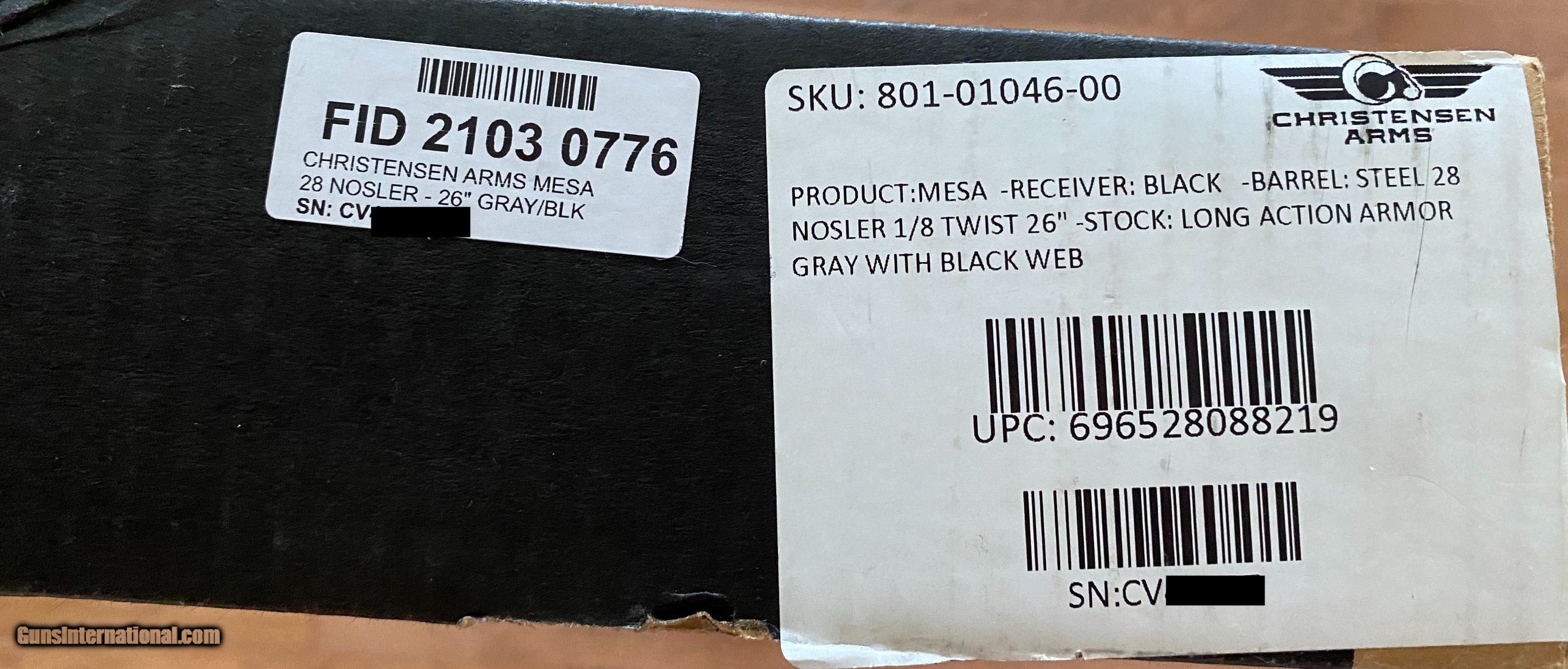 Description: As new Christensen Mesa Lipsey Exclusive CN8010104600 with 26" 1:8 barrel (Standard twist is 1:9). Purchased new. Comes with original box, manual, etc. Fired very little. Has one small mark on the left side of the stock near the barrel channel as can be seen in pics. The pic makes it look worse than it actually is. Shipping $50.00. Add $25.00 if your dealer doesn't accept shipment from an individual. SOLD Rifle Caliber: .28 Nosler Manufacturer: Christensen Arms Model: Mesa Condition: Like New |