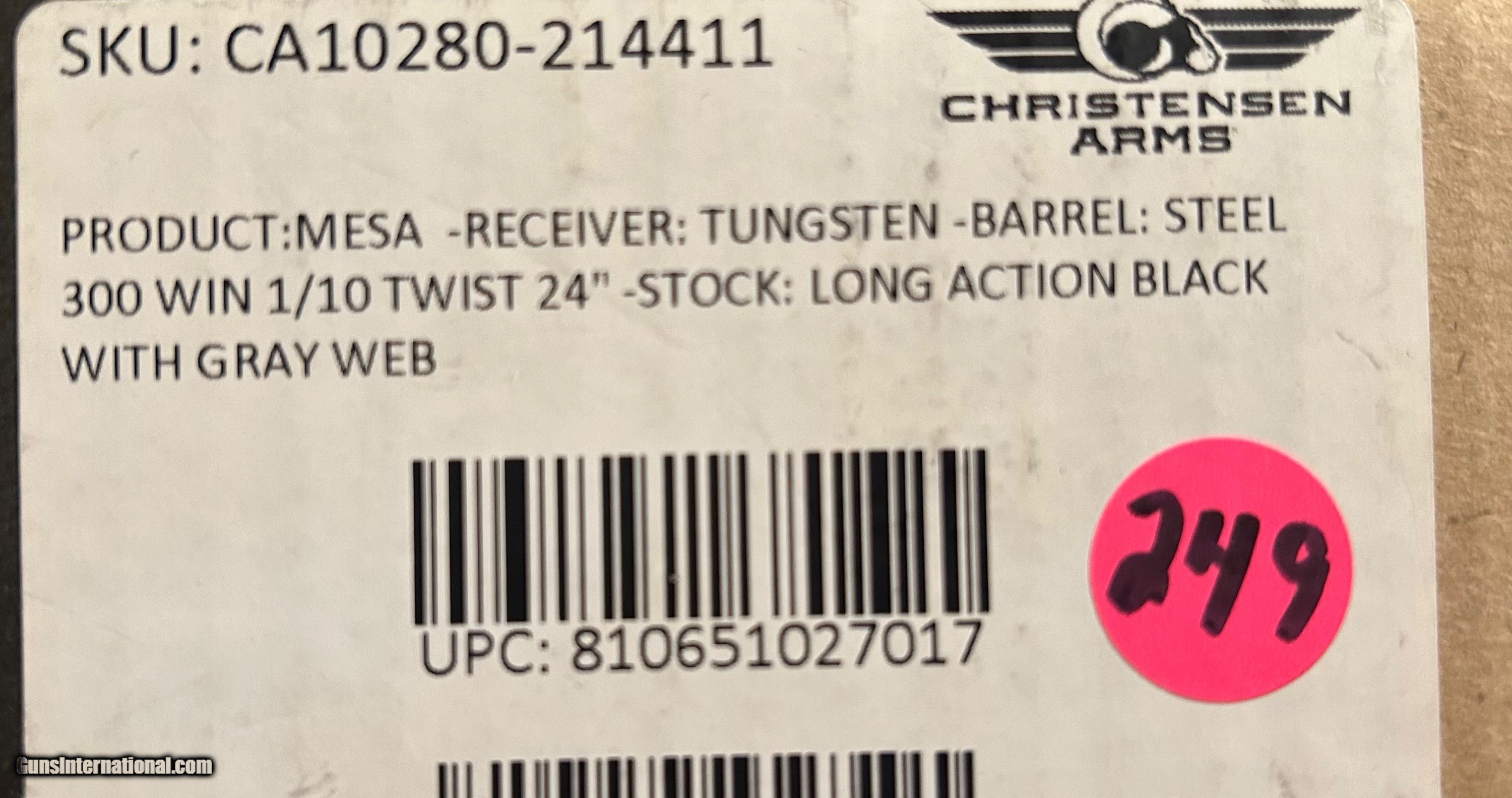 Description: Excellent condition CA Mesa 300 win mag. Includes original box and paperwork plus muzzle end cap. Also includes 30mm Talley rings. No California, Alaska or Hawaii sales. Will not ship to where prohibited. Shipping is $40. SOLD Rifle Caliber: .300 Winchester Magnum Manufacturer: Christensen Arms Model: Mesa Barrel Length: 24 inch Condition: Excellent Metal Condition: Excellent Bore Condition: Excellent Weight: 6 3/4 lbs |