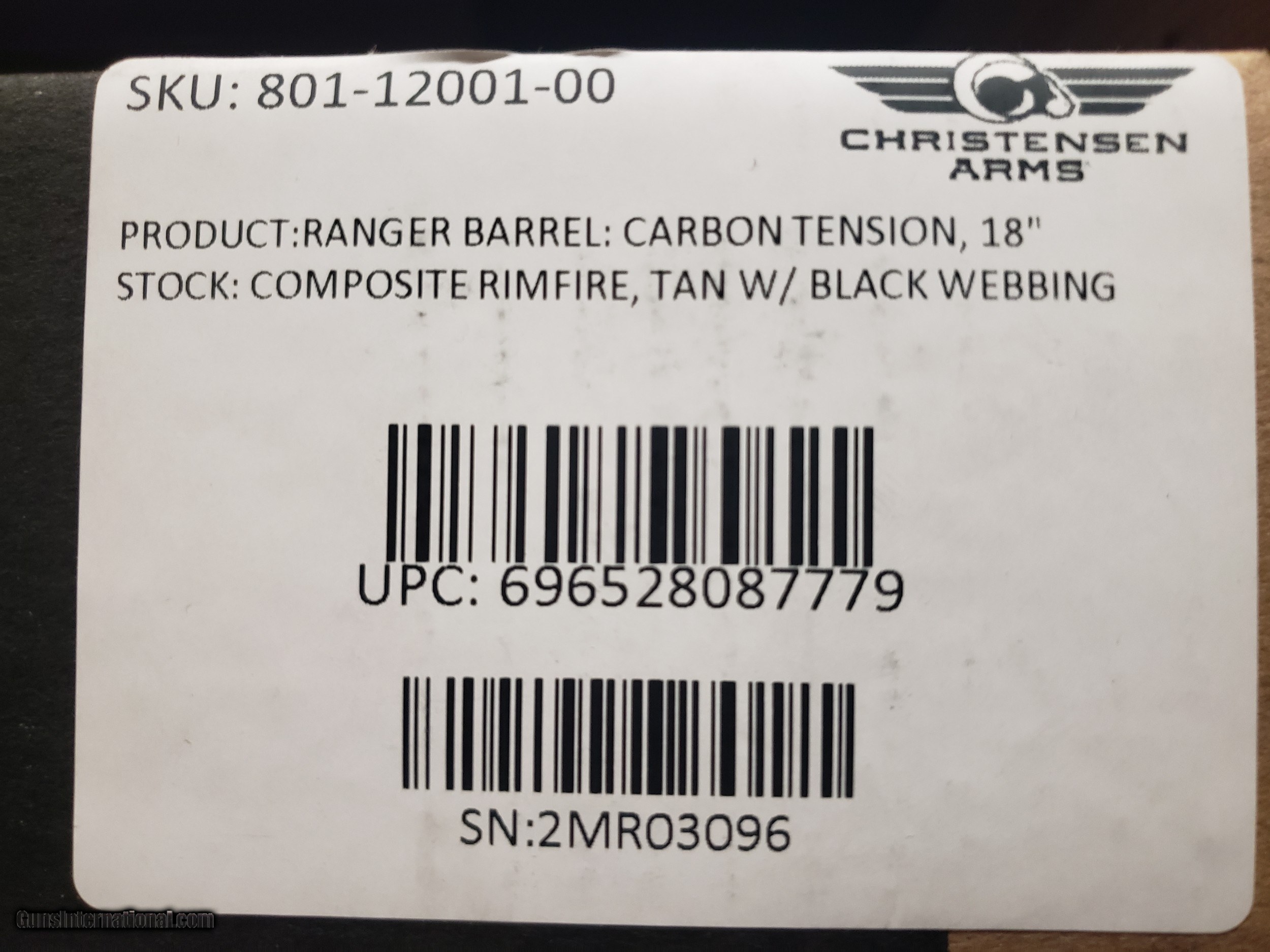 Description: This is a factory new Christensen Arms Ranger. It is a .22 Long Rifle rimfire rifle with a number of features. Built for precision—the bolt-action platform features an aluminum receiver with a steel recoil lug insert, Christensen Arms carbon fiber tension barrel, and a carbon fiber composite rimfire stock. The rifle is also well equipped with standard sling studs, a picatinny rail, and a match grade Rem 700 style trigger. The Ranger 22 weighs in starting at 5.1 pounds and is backed by a Christensen Arms Sub-MOA at 50 Yards Guarantee. All items are also available for sale in our brick & mortar store and are subject to prior sale. Think long, think wrong. Payment On firearms, we typically only accept credit cards or money orders/cashier's checks.