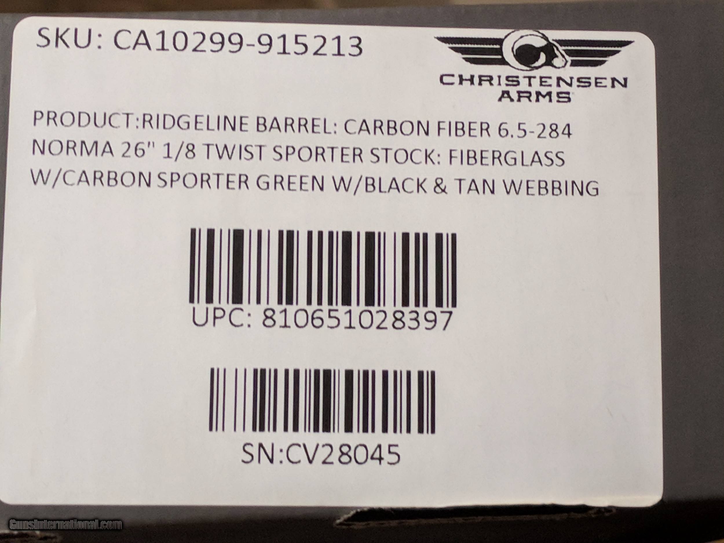 Description: Christensen Arms Ridgeline model 14 6.5-284 norma rifle 26" carbon fiber barrel 1/8 twist Sporter stock this gun is as new comes with all original box and documents, less than 20 rounds down the pipe, SOLD PENDING FUNDS SOLD Rifle Caliber: 6.5-284 Norma Manufacturer: Christensen Arms Model: 14 Serial Number: CV28045 Barrel Length: 26 Condition: As New |