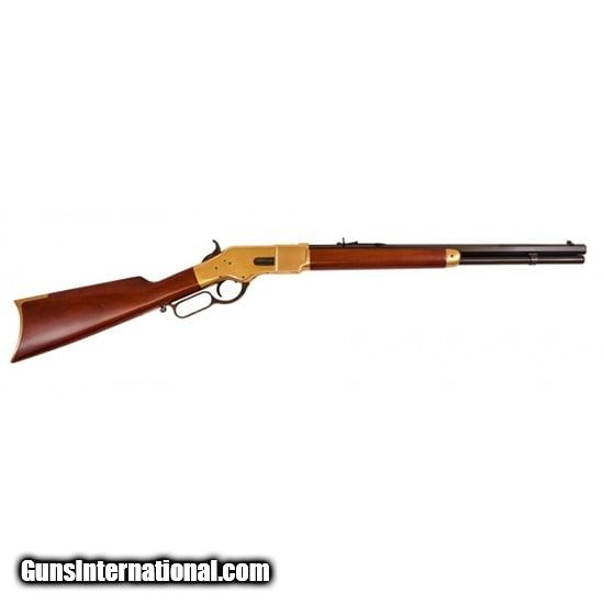 Description: Guns Listing ID: 507736 The Winchester Model 1866 Yellowboy was the first true cowboy lever-action rifle and Cimarrons 1866 Yellowboy family of rifles faithfully reproduces the rifle favored by Sitting Bull and by the Turkish Army in their fight against Russia in the 1870s. This family of rifles is highly diverse in terms of the specs of the blued barrel and in the ammunition used. The 1866 Yellowboy earned their nickname from the brass frame. These rifles have an all walnut stock. Details Originally known as the Improved Henry due to its patented loading gate on the side of the frame designed by Nelson King Winchesters plant superintendant and the addition of a wood forearm the 1866 model was known as the Yellow Boy by the Native Americans because of its brass frame. The 66 model was the first true cowboy lever-action and the first that adapted well to carrying in a saddle scabbard due to its slab sided design. With over 170000 made between 1866-1898--its popularity continued long after more powerful lever guns were introduced. The 66 model was famous worldwide with guns used by the forces of Benito Juarez in Mexico the Turkish army in their fight against the Russians and in the Wild West by such notables as Sioux Medicine Man Sitting Bull the Union Pacifics chief engineer General Grenville Dodge and desperado Bill Doolin. - Cimarron offers several 1866 Yellowboys such as the 24-inch barreled Sporting Rifle a 20-inch Short Rifle (both of these models sport octagon barrels) round barreled carbines including the 19-inch saddle ring carbine a brass tack-decorated 19-inch Indian carbine and a 16-inch Trapper model. Calibers available include .45 Colt .44-40 .44 Special .38 Special .38-40 .32-20 and .22 Long Rifle and with finishes like the Standard Blue Charcoal Blue or Original Finish depending on which model you select. One of Cimarrons true handsome Old West classics - Caliber .45 COLT - Style Short Rifle - Capacity 10 Rnds. - Frame Brass - Finish Standard Blue - StockForearm Walnut - Weight 7.56 Lbs. SOLD Manufacturer: CIMARRON Model: 1866 Caliber Info: .45 LC Condition: new Barrels: 20 BARREL |