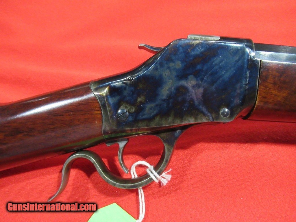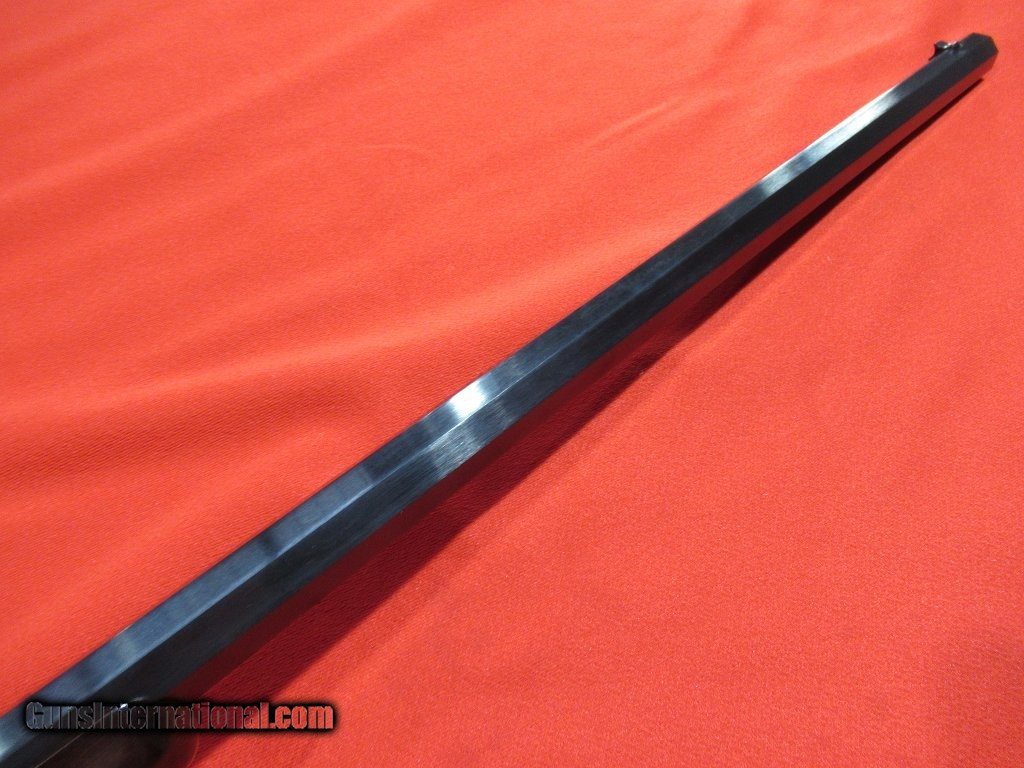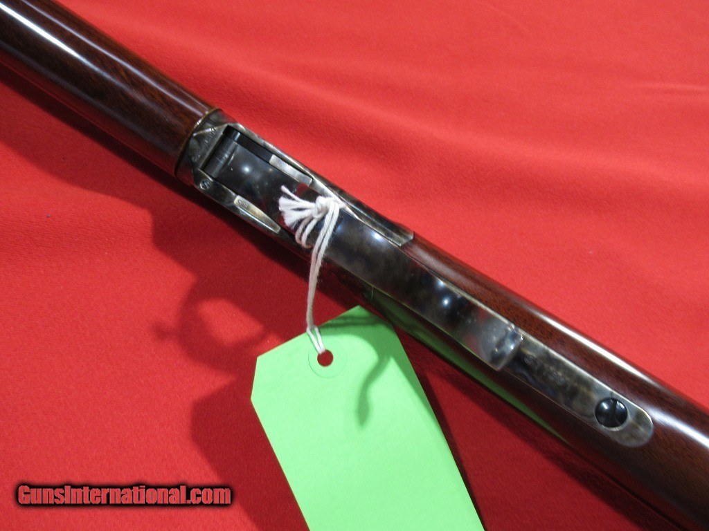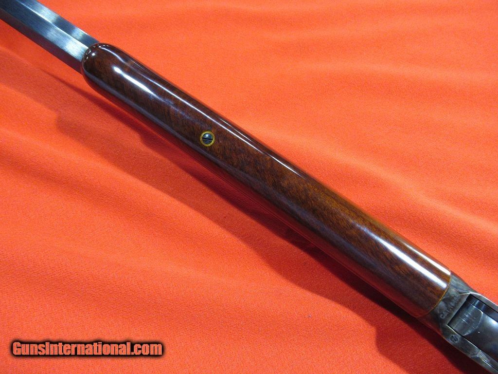 Description: Satin finished walnut stock that is noncheckered, case colored receiver, heavy octagon barrel, adjustable semi-buckhorn rear sight, steel crescent buttplate, pinned front sight. SOLD |