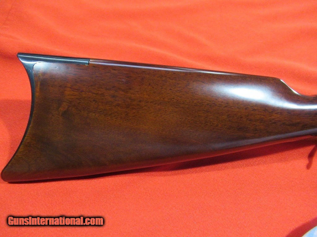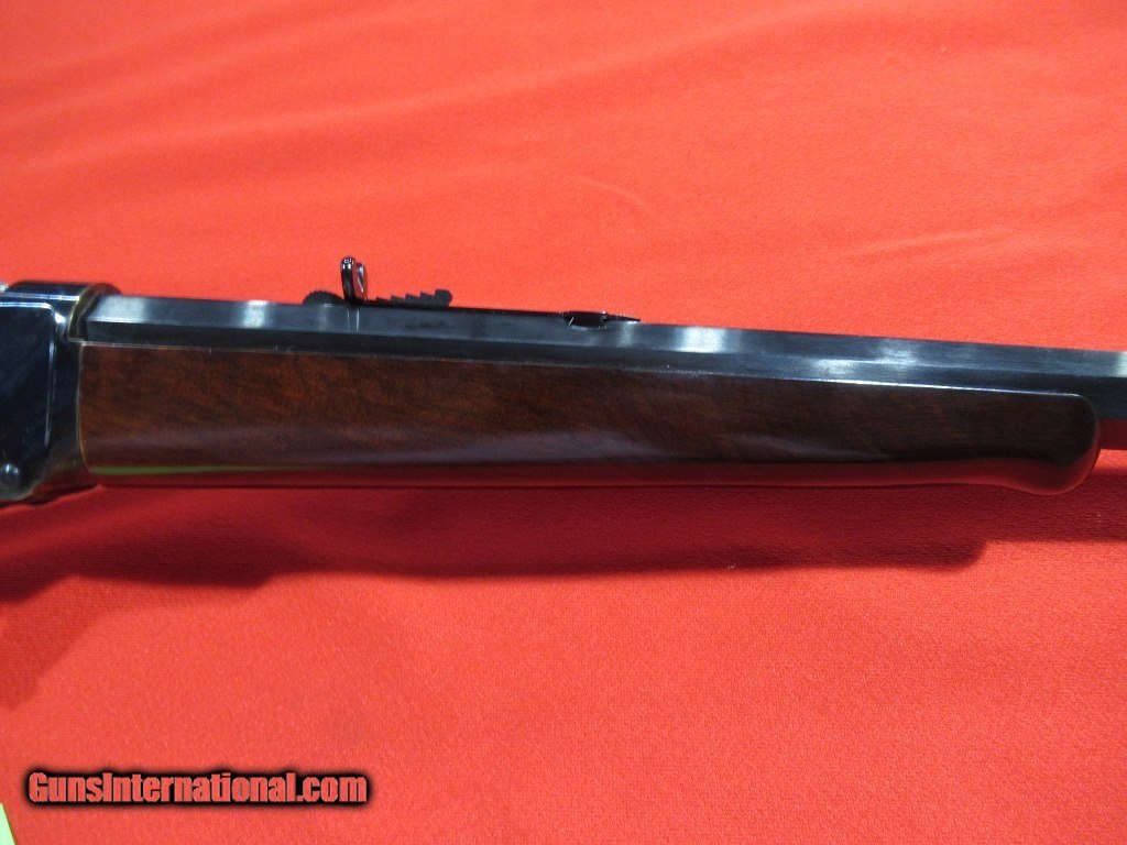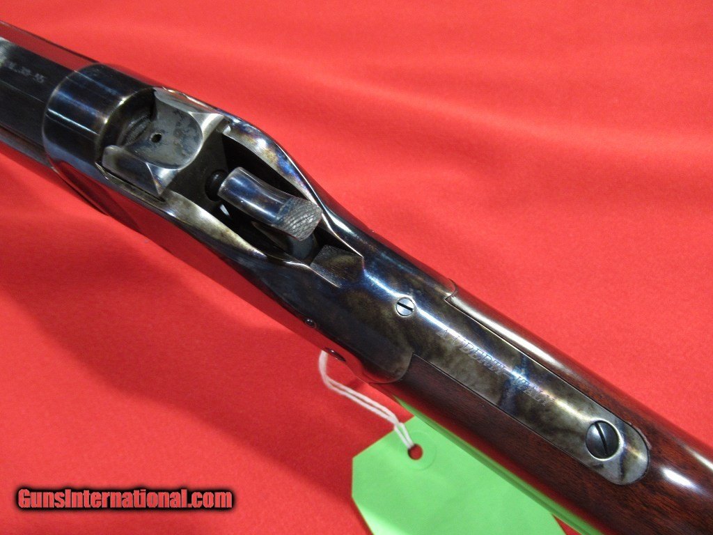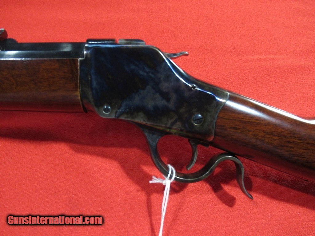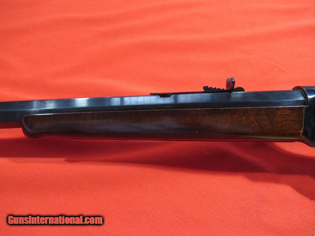 Description: Satin finished walnut stock that is noncheckered, case colored receiver, heavy octagon barrel, adjustable semi-buckhorn rear sight, steel crescent buttplate, pinned front sight. SOLD |