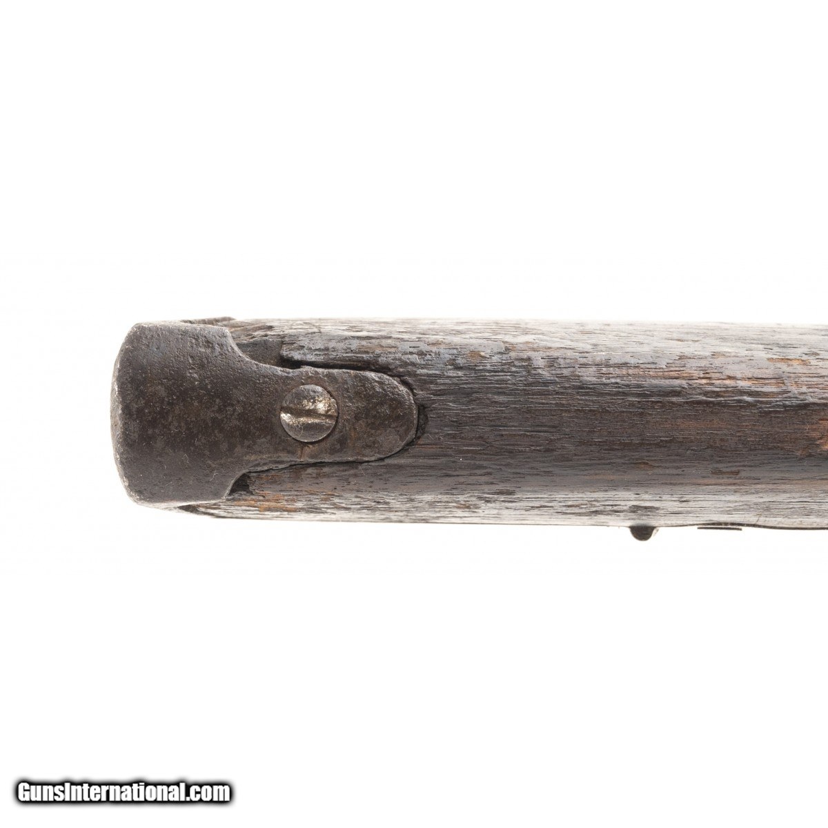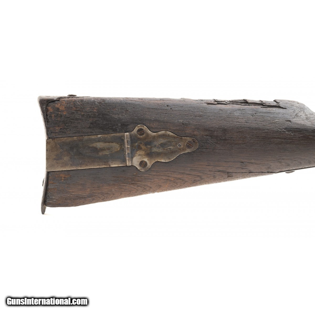 Description: " This Sharps New Model 1863 carbine has the ""been there, done that"" look. The metal is all brown with light pitting in the breech area. The bore is poor. The sights and bar and ring are intact. The upper tang is broken (but there) at the front screw. The butt stock is fair with battle wear, a stable 3.5"" age crack from the lower rear tang screw, chipped toe, chipping and wear around the butt plate, wear and erosion along the comb, , a crack on either side of the upper tang, and a chip at the upper left intersection with the frame. The patch box is smooth with finish added and a small age crack running forward of the front screw. The forend is good with a chip at the attachment screw. The action is tight but functions. If only this Sharps carbine could talk! SOLD Antique: Yes |