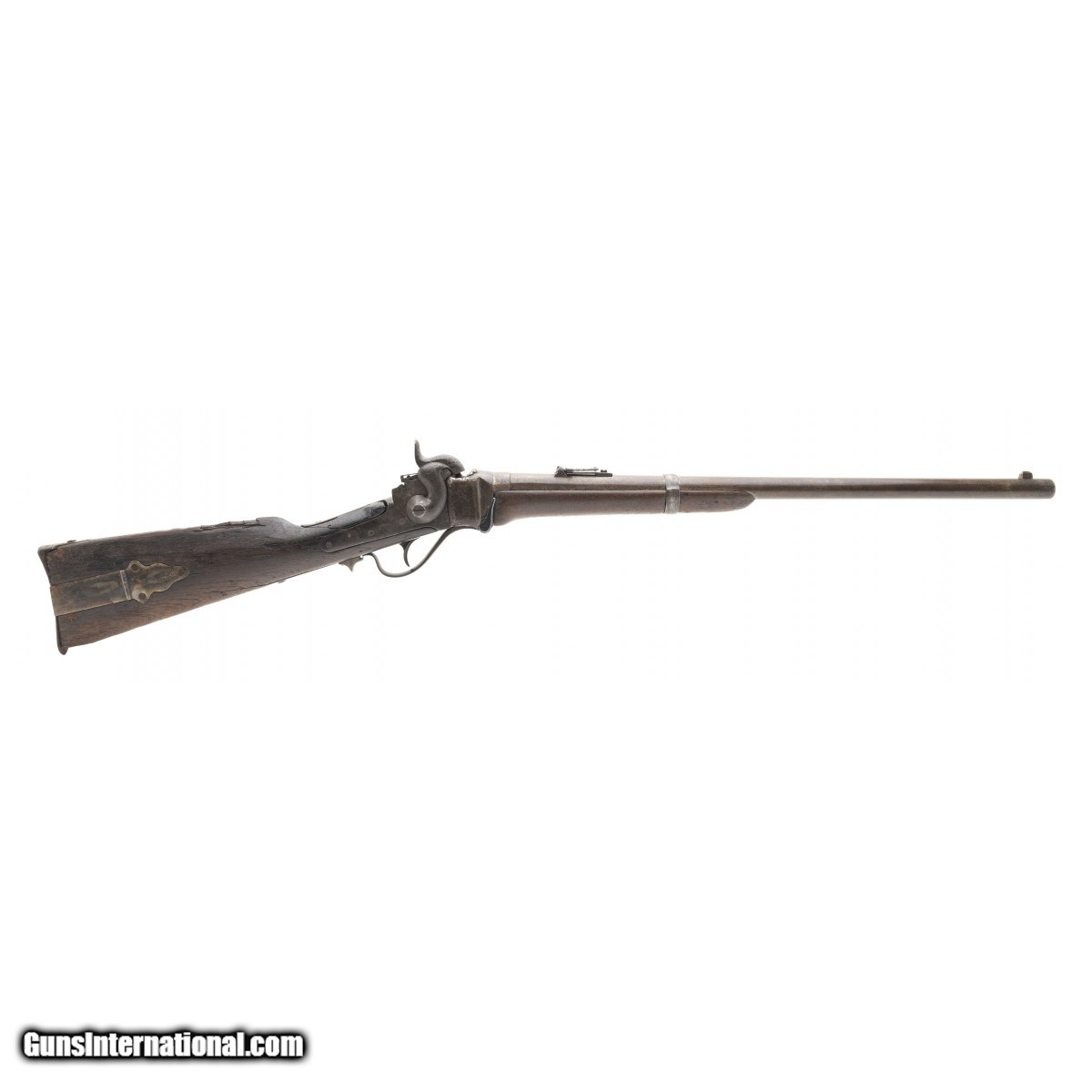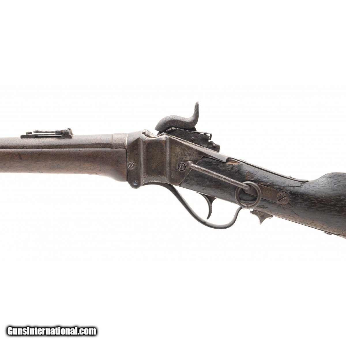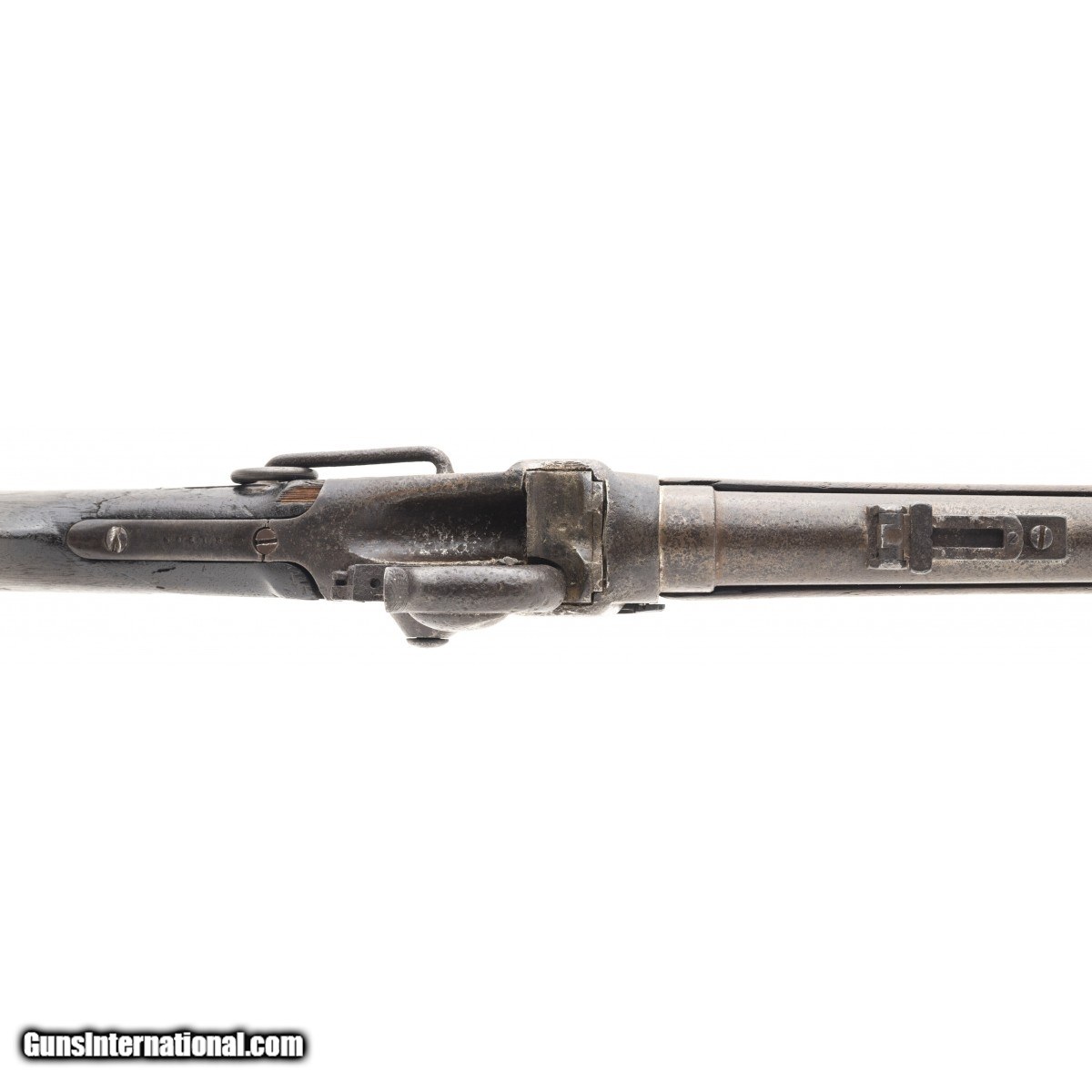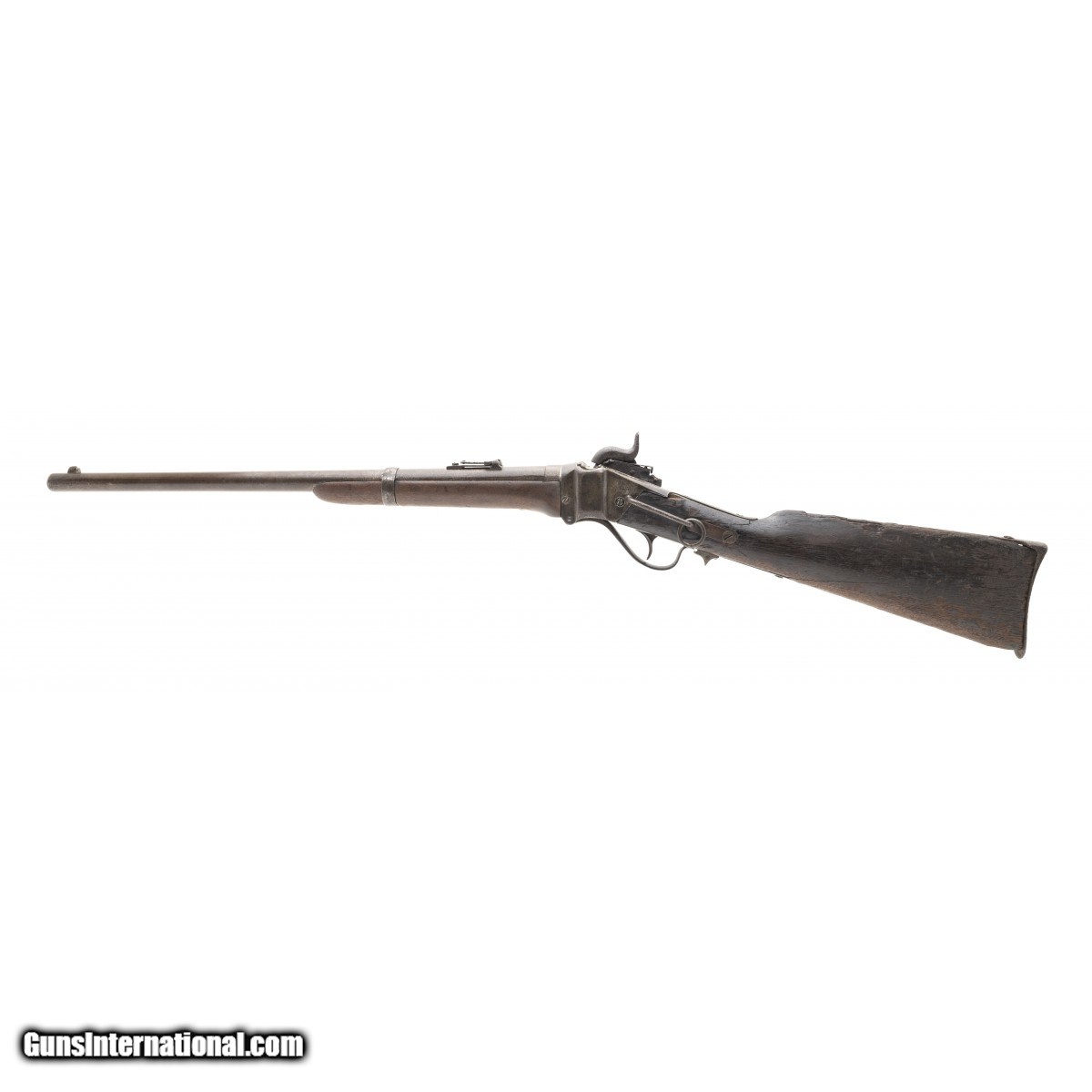 This Sharps New Model 1863 carbine has the ""been there, done that"" look. The metal is all brown with light pitting in the breech area. The bore is poor. The sights and bar and ring are intact. The upper tang is broken (but there) at the front screw. The butt stock is fair with battle wear, a stable 3.5"" age crack from the lower rear tang screw, chipped toe, chipping and wear around the butt plate, wear and erosion along the comb, , a crack on either side of the upper tang, and a chip at the upper left intersection with the frame. The patch box is smooth with finish added and a small age crack running forward of the front screw. The forend is good with a chip at the attachment screw. The action is tight but functions. If only this Sharps carbine could talk!