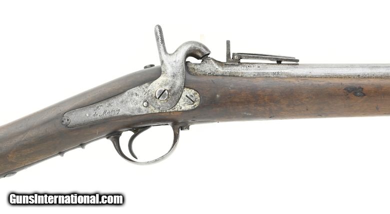 Description: "French Model 1842 Civil War carbine. Overall length is 50¾". The 32" round .81 caliber barrel has a very good rifled bore. The metal finish is bright mixed with brown patina. Stock is very good with no cracks or chips and the dents and dings to be expected of an issued firearm. The lock is marked “Mre Rle De Mutzig". It also has a small star over “W" inspection stamp. The barrel tang is marked “Mle 1842". The Barrel has “33" on the left flat with two inspection stamps, a small inspection stamp of “MR" and “1844" above. The sling swivels and ramrod are present. Herman Boker of New York imported 25,000 model 1840 and 1842 carbines in 1862. The action functions correctly. Here’s your chance to acquire a very nice model 1842 carbine that was imported for the Union. SOLD Antique: Yes |