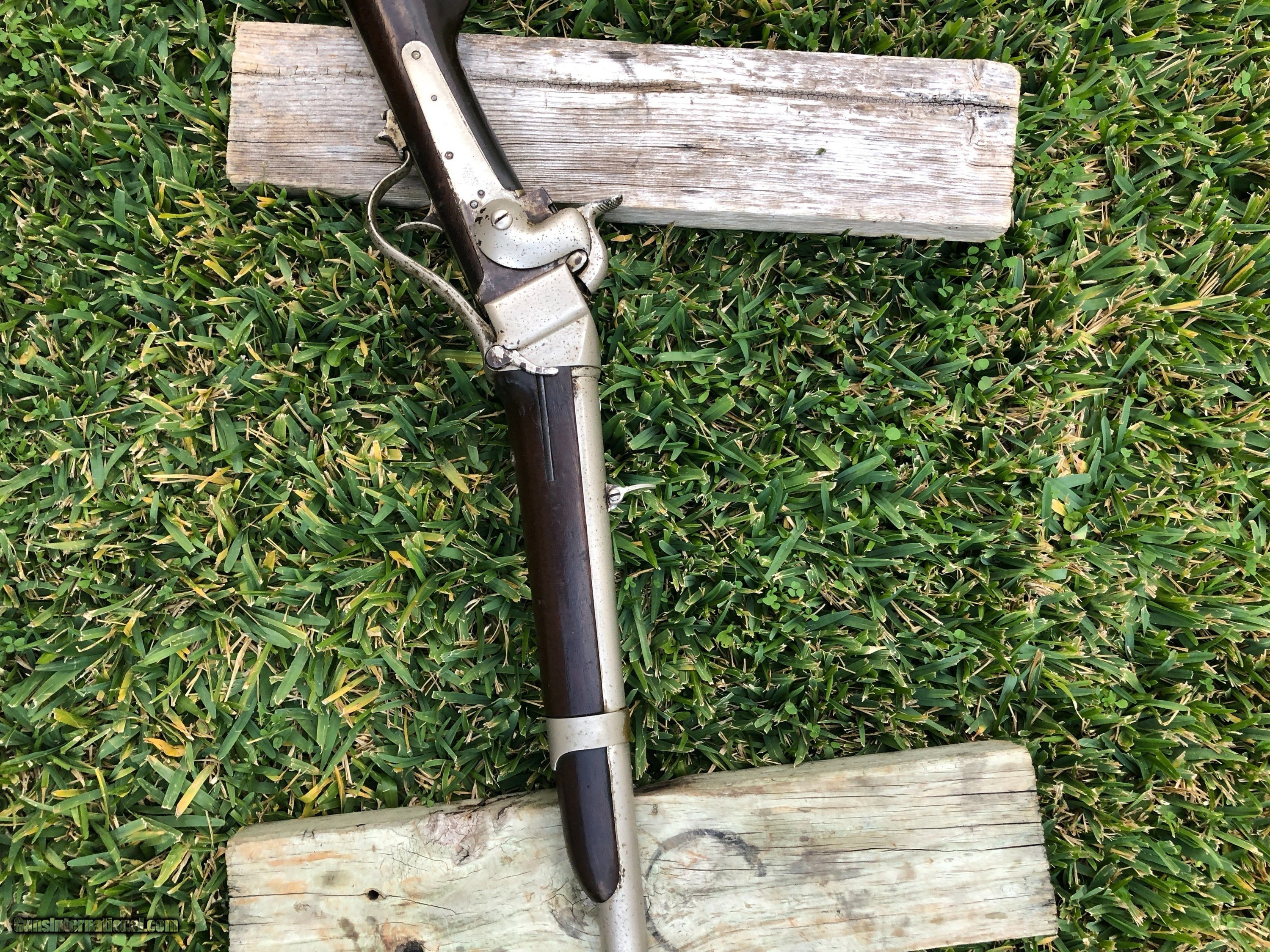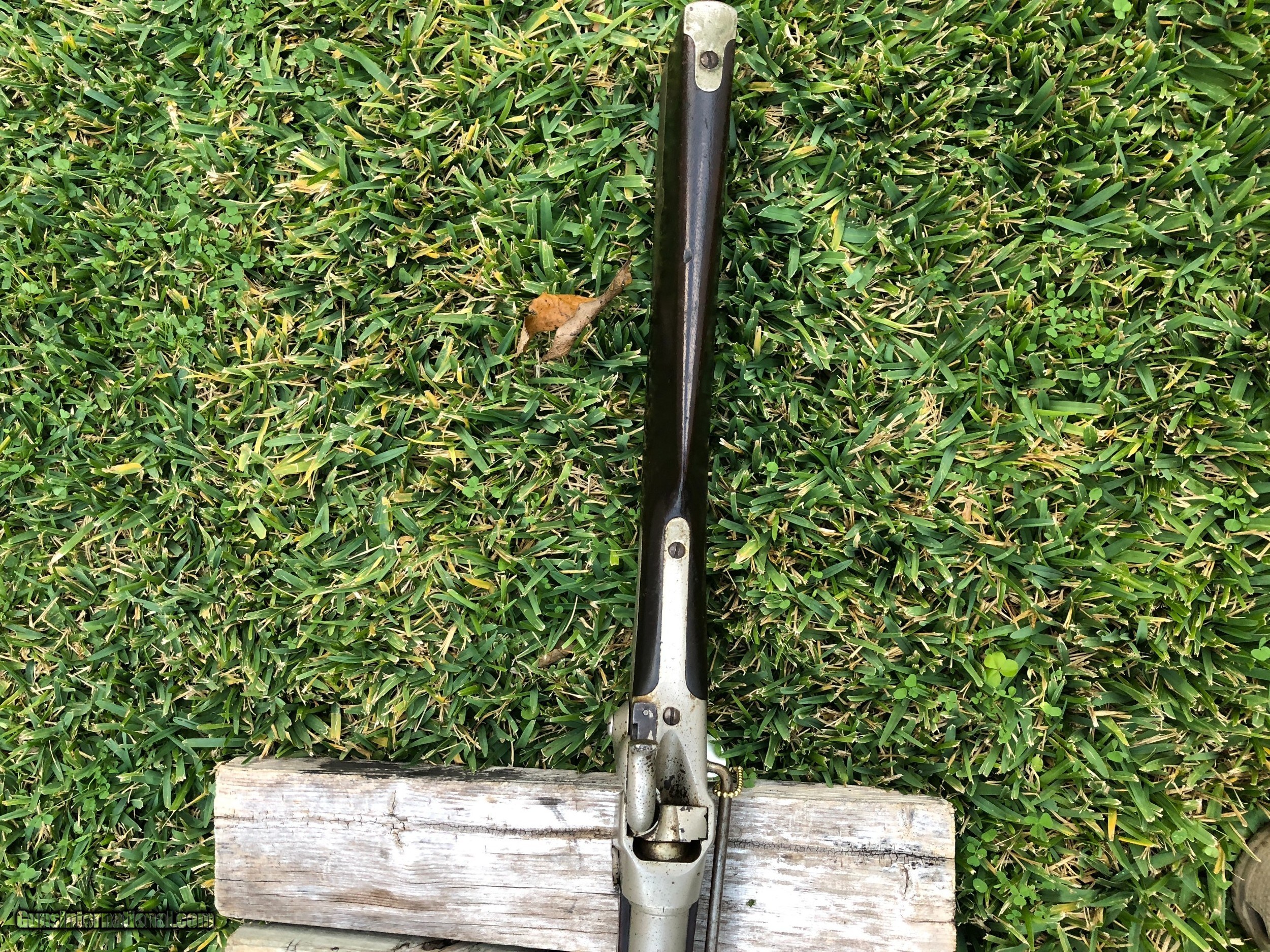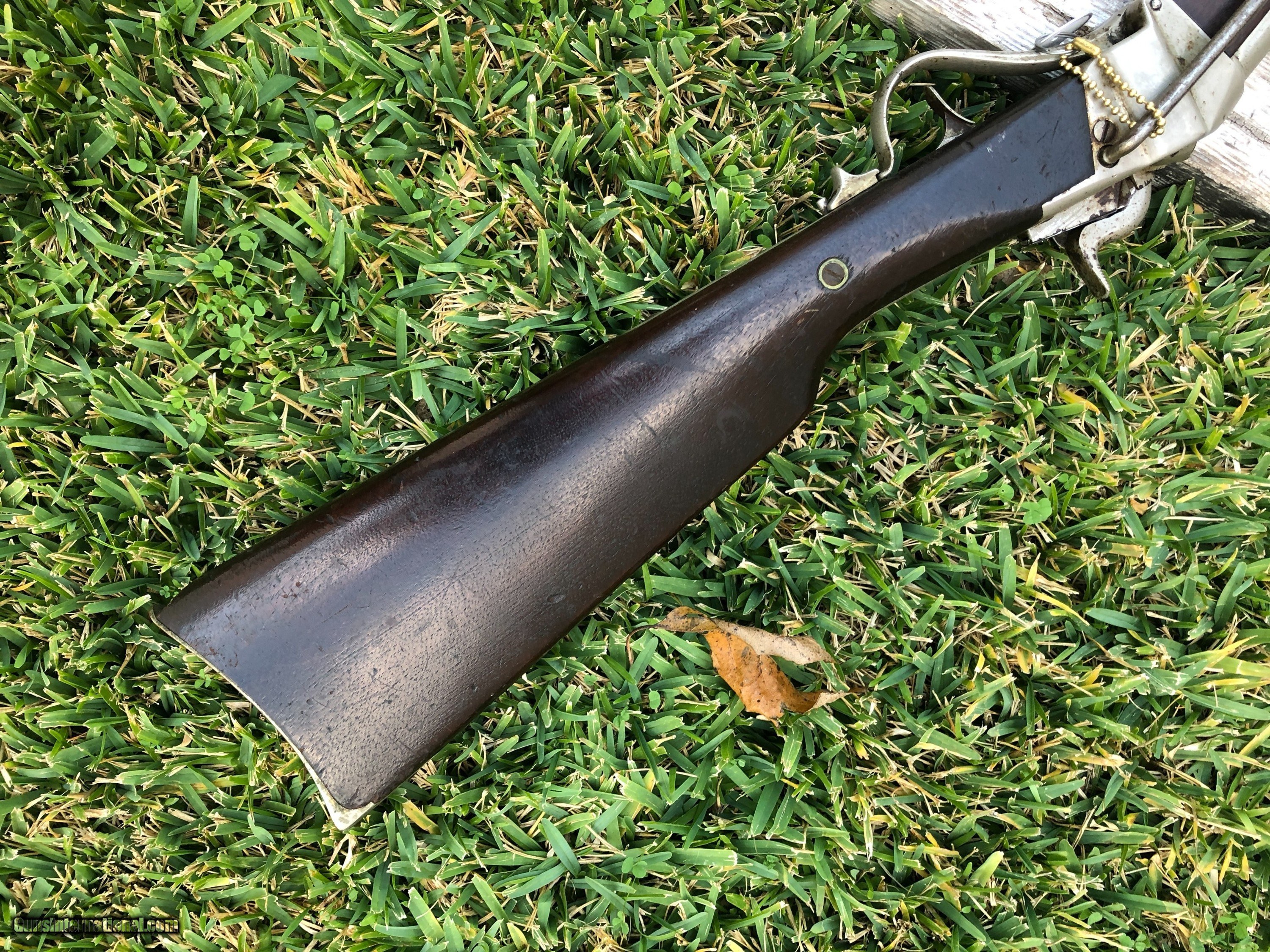 Description: This is a very good 1852 Sharps carbine caliber .52 with matching serial numbers on breech, barrel and breech block. Nice wood missing a chip at the toe of the stock. Fine bore and really good markings. The tinned finish could be removed by a compenet gunsmith. Mechanically excellent and Free Shipping. SOLD Antique: Yes |