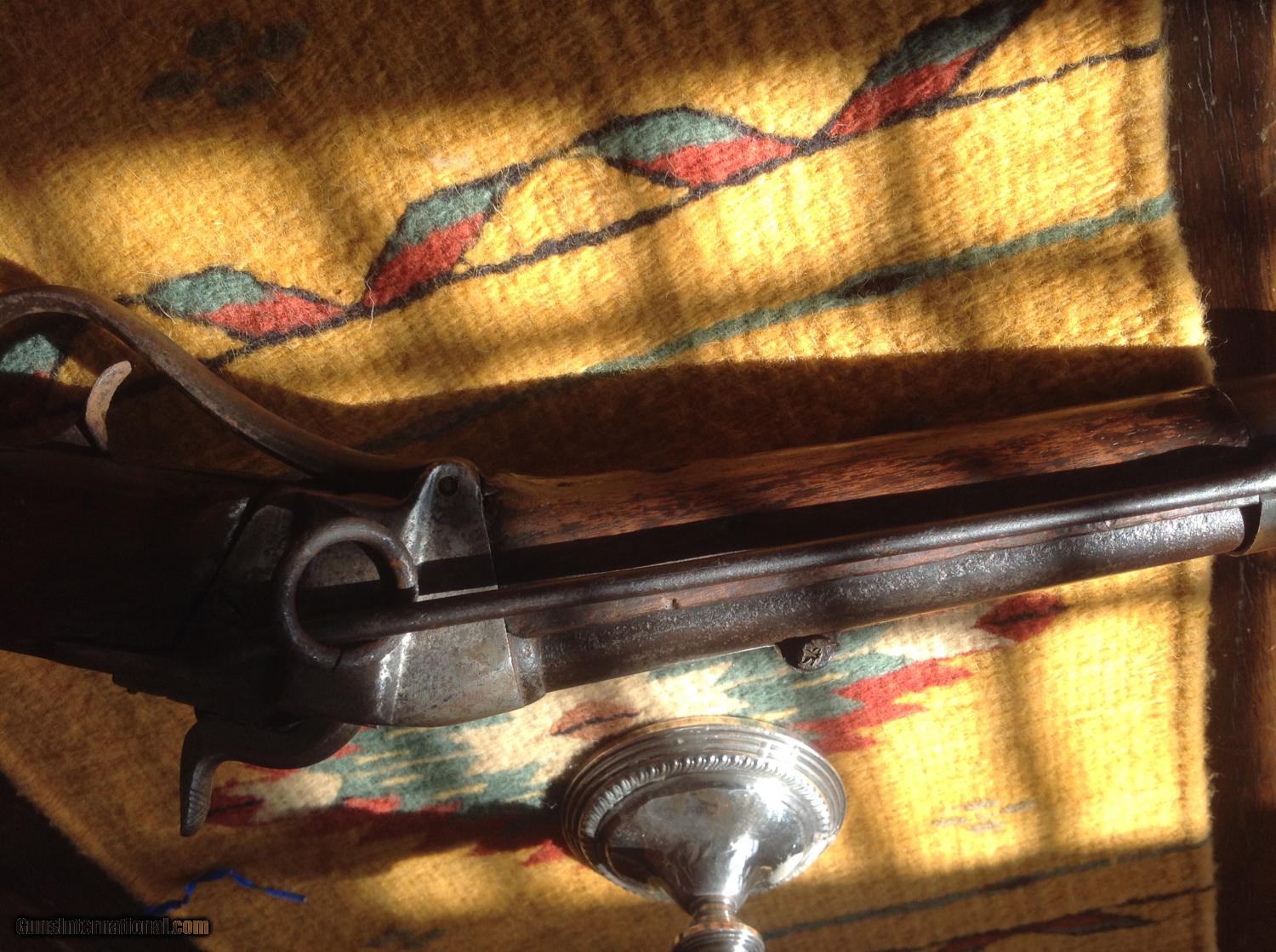 Description: SOLD! Civil War war Horse 1852 Sharps Slant Breech carbine that surfaced near Uvalde Texas with an 1852 Colt Pocket Colt and other Confederate items. Has a 21 inch barrel and the comma shaped lever key retaining pin. Some of the C. Sharps Patent is visible on the right side lockplate but not all. See photos. Most all of the Sharps marking on top of the barrel tang is visible as is the SN 5053. 1853 to 1855 production. Marking also visible on the top of the barrel. Barrel is a dark patina with very light pitting in a couple of areas. Lock plate has blotched patina. Light pitting on hammer. Brass butt plate, patch box and barrel band all have uncleaned patina. Breech block and loading lever has light rust and some pitting. Bore has deep rifling but has some light pitting. Cosmetic crack on neck right side above the lock plate. Small area of wood missing from toe. Missing screw on forearm underneath. Rotating portion of Beaver tail sight is Missing. Action works. Carbine ring is a replacement. Wood stock is solid with normal dings for a weapon of this age. Mid grade rare 1852 Slant Breech Sharps Carbine that saw the elephant and is very affordable. Compare prices and condition anywhere right now and you will not find a better deal on a rare 1852 Sharps Slant Breech Carbine. More photos available upon request for serious buyers. Thanks for looking. I am a collector not a dealer. SOLD Curio/Relic: Yes Antique: Yes |