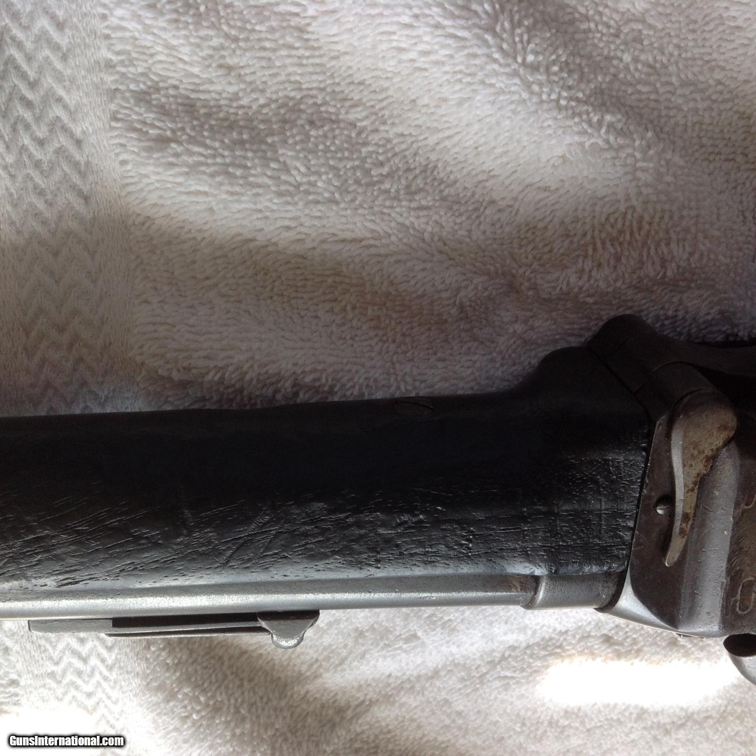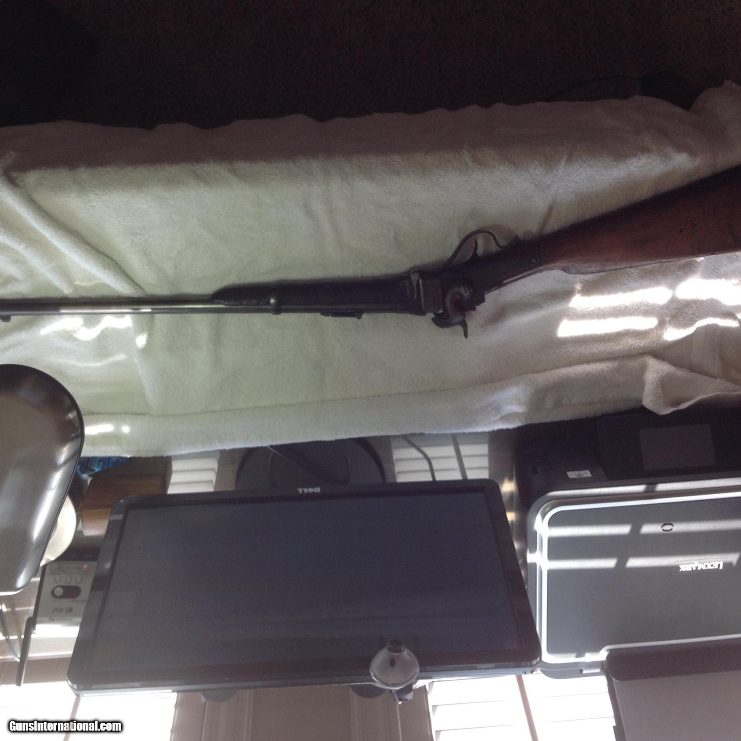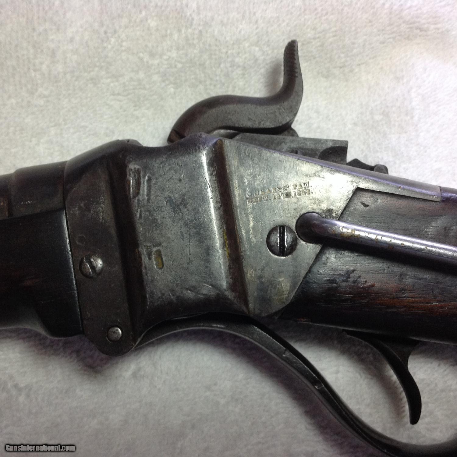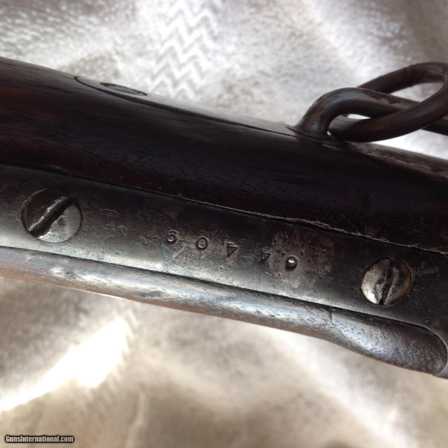 Description: REDUCED TO SELL!!! Good condition. Sharps New Model 1859 Civil War Carbine 52 Caliber. 22” barrel, 39” overall length. Marking near breech: New Model 1859, markings on barrel. Sharps Manufacture Co./Hartford, Conn. markings on left side of the receiver: C. Sharps Pat. Sept. 12, 1848. : C. Sharps’ Pat./Oct./5/1852, right side of lock: R.S. Lawrence pat. April 12, 1859. Markings are very readable. Walnut stock. Ser. #64409 makes it 1863 production. Condition: Barrel, bands and sight are brown-plum. Case hardening is grey/silver/brown. Wood has some dents, dings and small chip on right front forearm . Bore has rifling and corrosion. Pitting on butt plate. Missing sliding bar on sight. Tight action. Good condition 1863 production Sharps New Model Carbine that will not break the bank. Can send more photos on request. SOLD Antique: Yes |