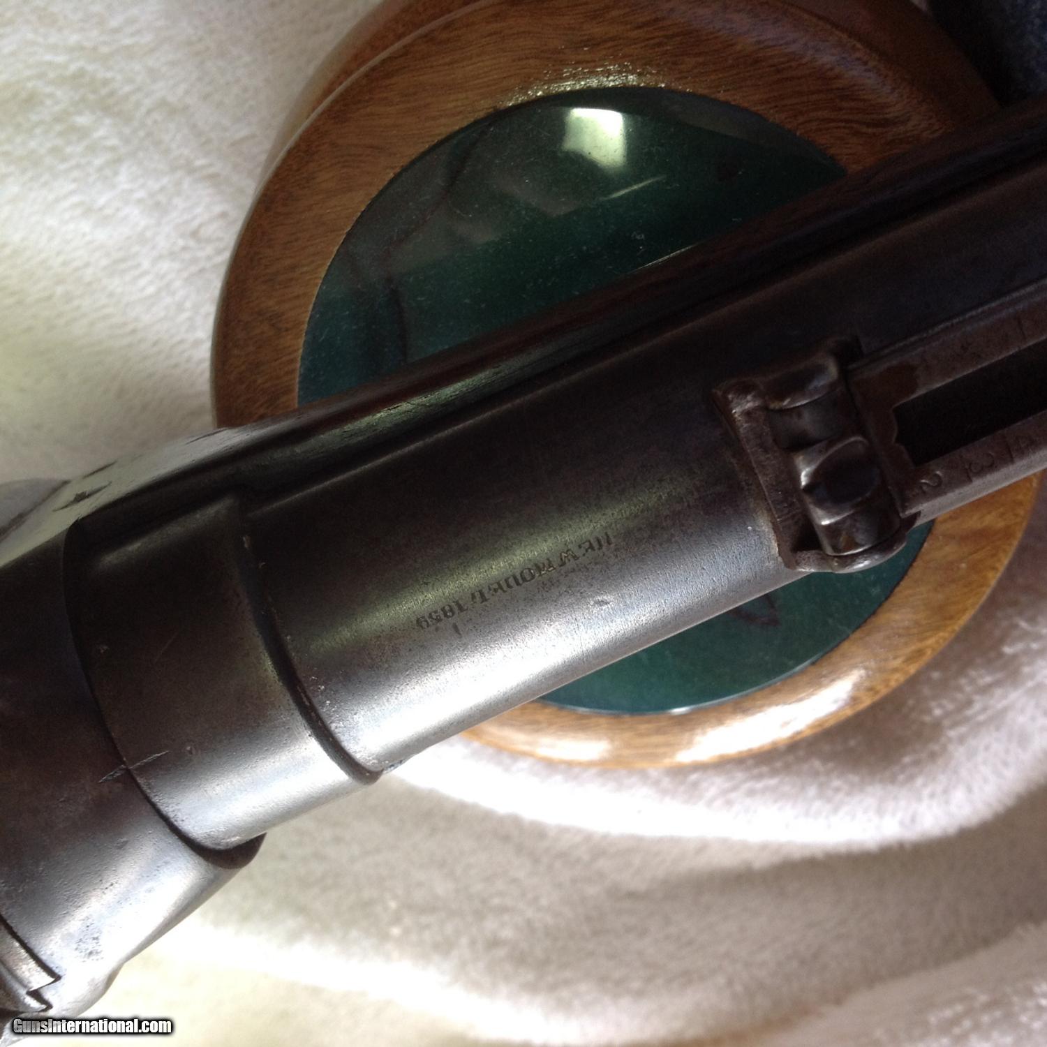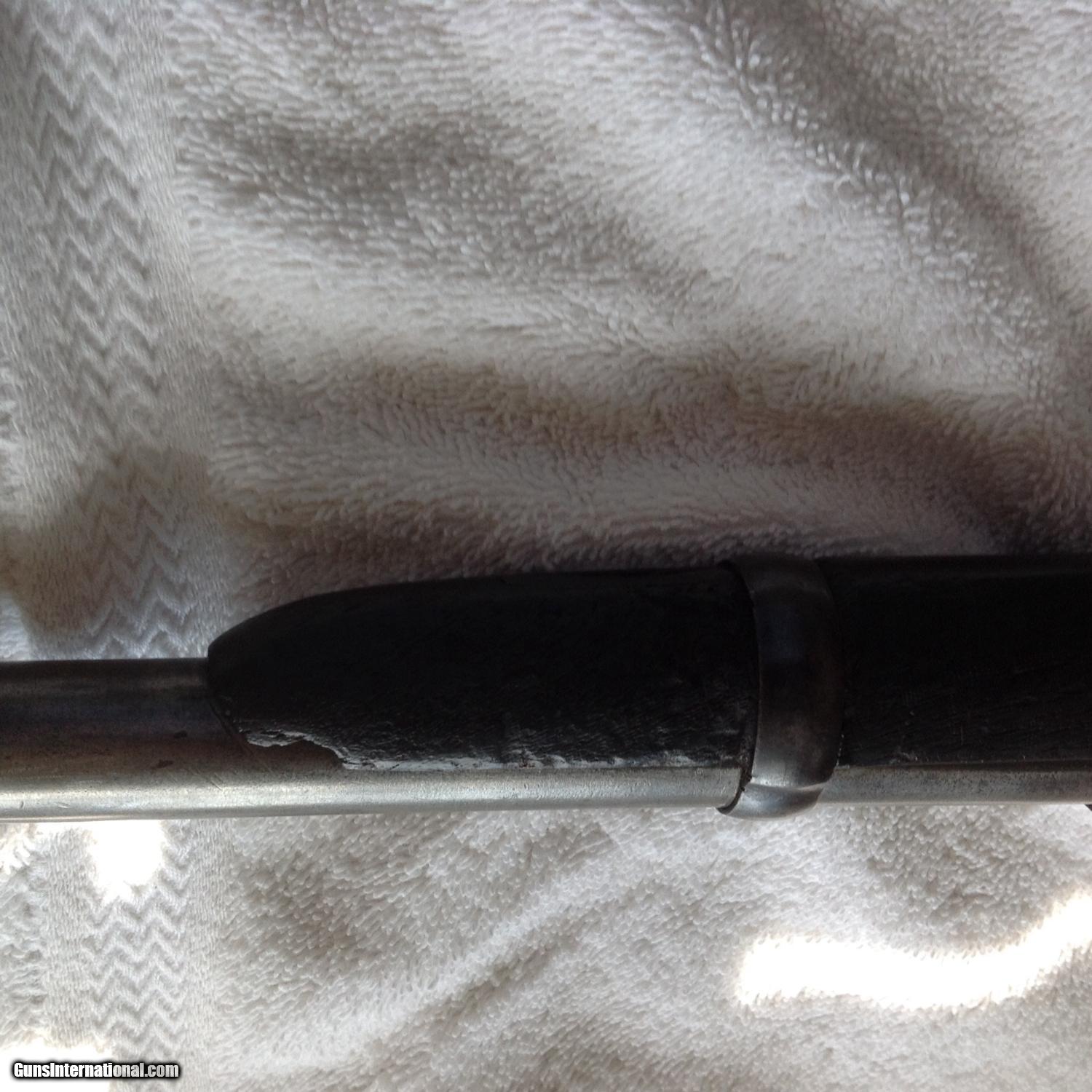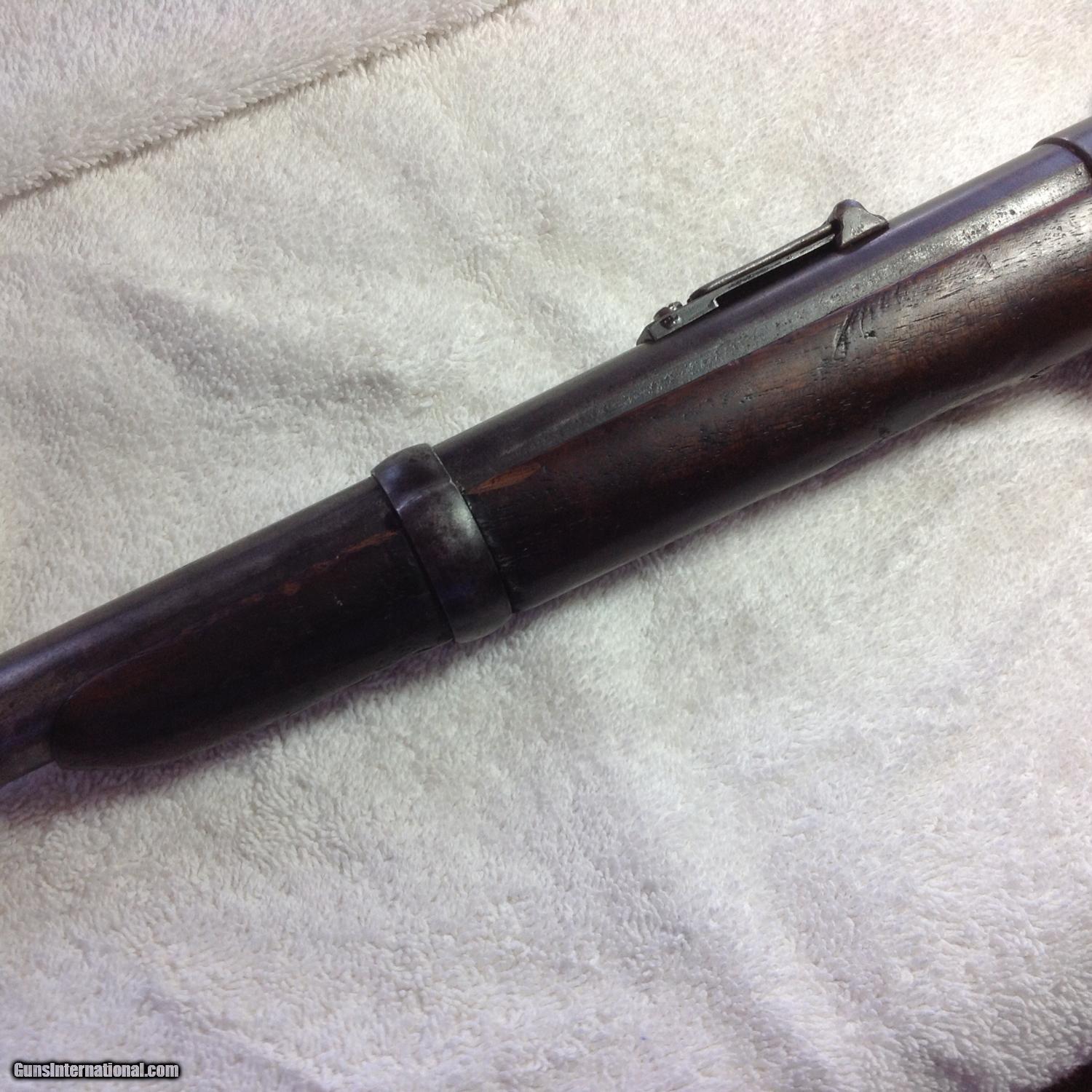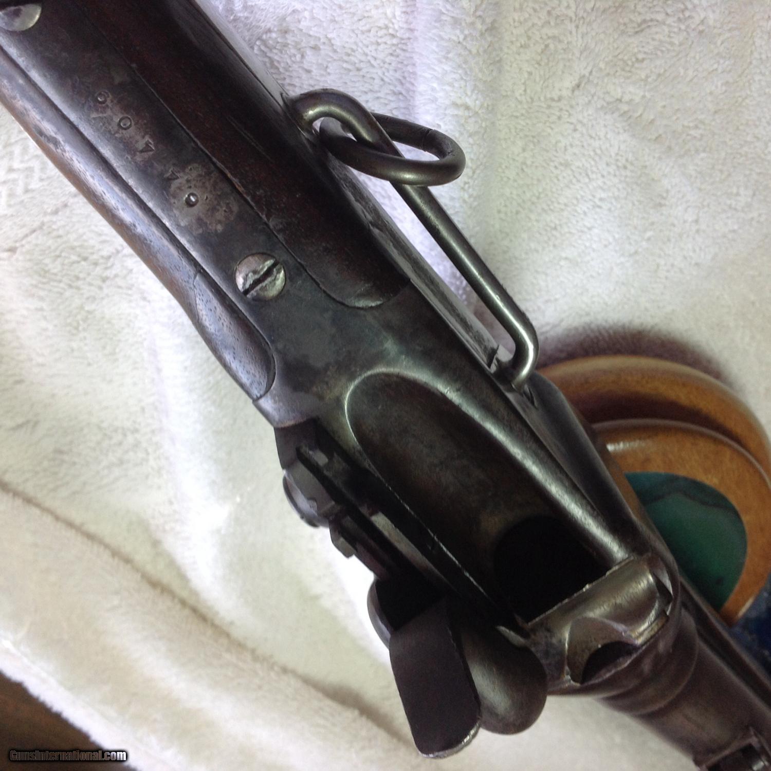 Description: REDUCED TO SELL!!! Good condition. Sharps New Model 1859 Civil War Carbine 52 Caliber. 22” barrel, 39” overall length. Marking near breech: New Model 1859, markings on barrel. Sharps Manufacture Co./Hartford, Conn. markings on left side of the receiver: C. Sharps Pat. Sept. 12, 1848. : C. Sharps’ Pat./Oct./5/1852, right side of lock: R.S. Lawrence pat. April 12, 1859. Markings are very readable. Walnut stock. Ser. #64409 makes it 1863 production. Condition: Barrel, bands and sight are brown-plum. Case hardening is grey/silver/brown. Wood has some dents, dings and small chip on right front forearm . Bore has rifling and corrosion. Pitting on butt plate. Missing sliding bar on sight. Tight action. Good condition 1863 production Sharps New Model Carbine that will not break the bank. Can send more photos on request. SOLD Antique: Yes |