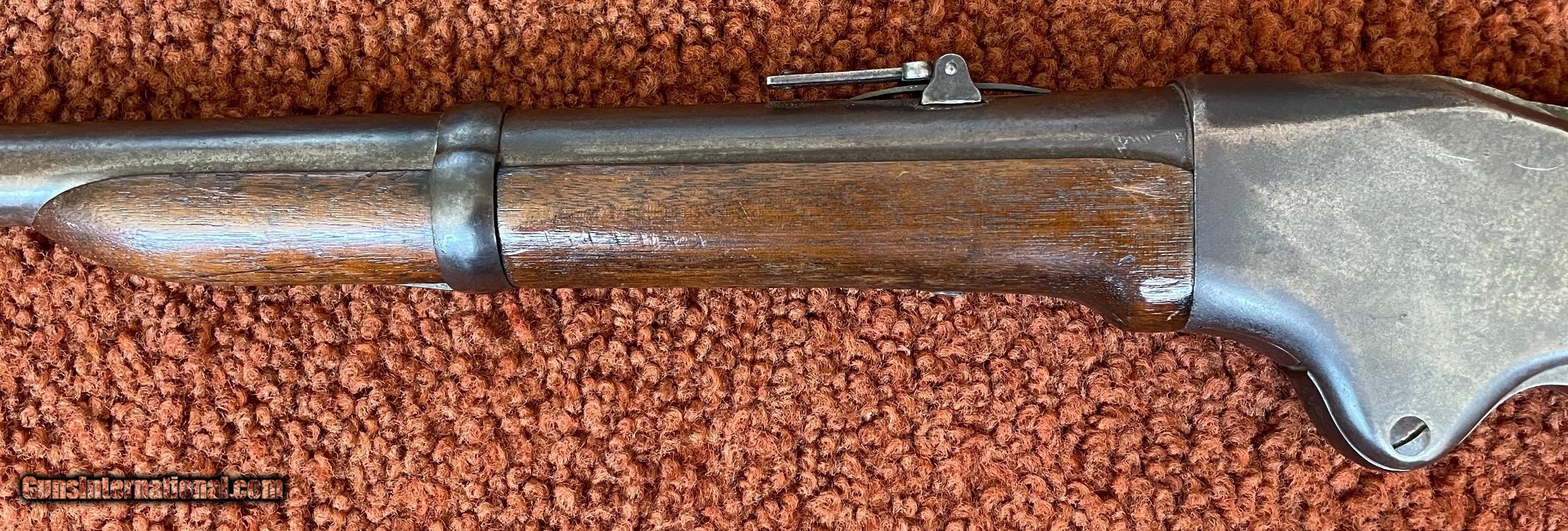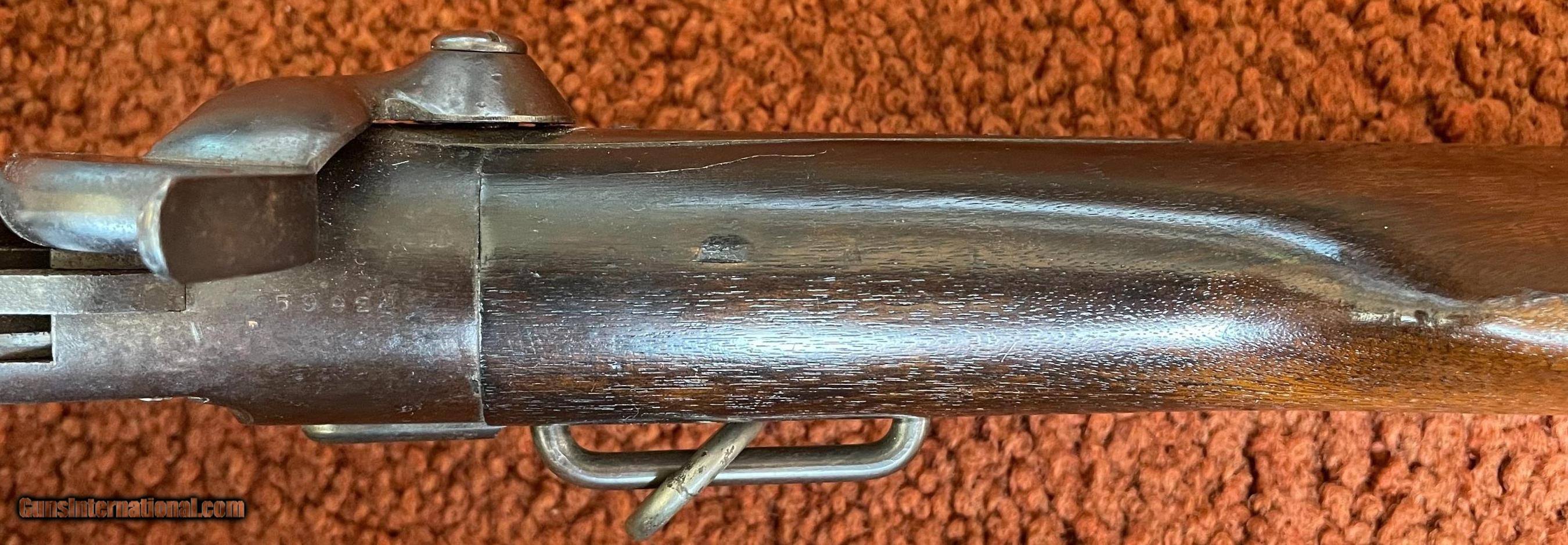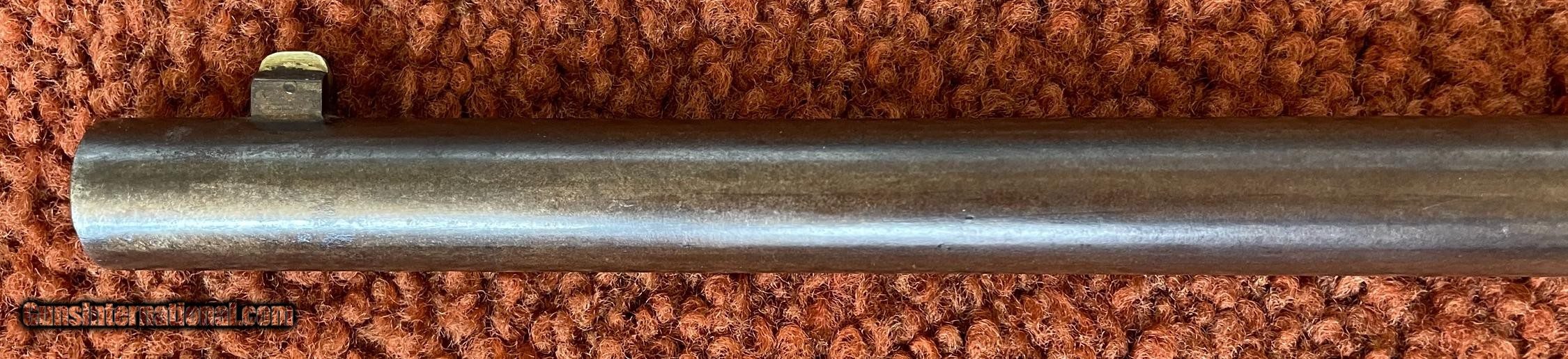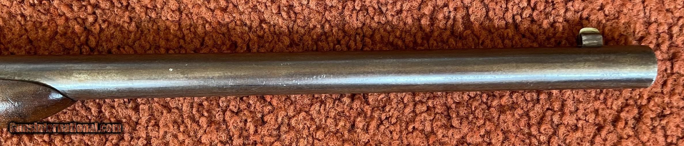 Description: The action works perfectly and the bore has some minor rough areas. There is a filled hole in fore arm where there was once a sling swivel. See photos for condition. SOLD Antique: Yes Manufacturer: Spencer Model: 1860 Serial Number: 59924 Barrel Length: 22 |