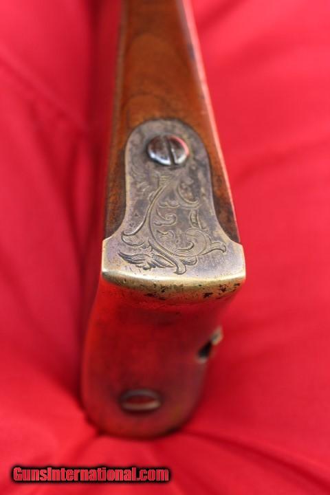 Description: Offered for sale is an unique Merrill Officers Model Carbine that is factory engraved with deluxe scrolls on the lock, hammer, patchbox, triggerguard and buttplate. Factory SILVER Plated brass and Deluxe xxx wood with original piano varnish. A VERY RARE Carbine as an OFFICERS MODEL (only a few known), but what makes this one even more UNIQUE is that it is the only one known with a SNAKE engraved breechblock. A very rare, and desireable piece of Civil War history- wish I knew the story on this one. Most of the original varnish still present, along with most of the silver plating remaining. The barrel was left in the bright and unfinished. Action crisp- bore strong but does have areas of pitting. The wood is solid- no cracks on the wrist but does have a grain check crack above the patchbox. The crack runs with the grain of the wood being very burly grain. The last one of these I saw sold at (Rock Island last year) brought just shy of $5K, and it was broken in the wrist/repaired with minimal engraving and actually pretty rough. This is a really fine, original and UNIQUE carbine that would be hard to improve upon. Check out my other offerings for some really nice, original items -THANKS!!! SOLD Antique: Yes Manufacturer: Merrill Model: 1st model Officers Carbine Serial Number: 8175 |