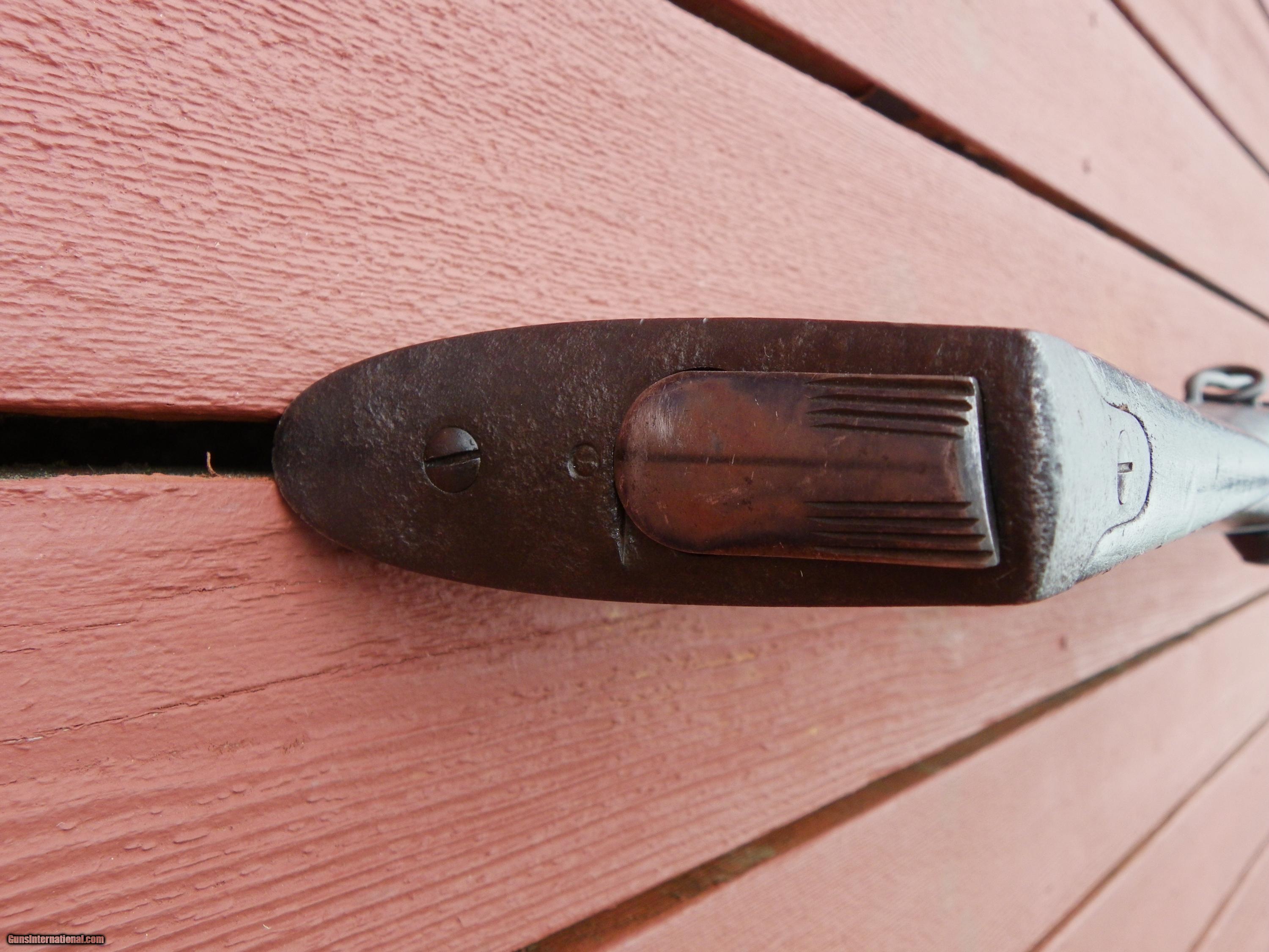 Description: 1865 Spencer Carbine mfg. by Burnside Rifle Company. SN 25624. .50 cal, 3 groove rifling, 20" bbl.7 shot repeater with Stabler cut-off. Wood is in pretty good shape with evidence that a decorative wrap was once on the aft portion of the stock, however it looks like soneone "chopped" away the front edge of the stock comb??? Also fore end on left side where it meets the receiver has a crack 1.5" long which ends in a dent. Bore is dark and pitted heavily, but grooves remain sharp. Sharp address: Spencer Repeating Rifle/ Pat'd March 6, 1865/ Manuf'd At Prov. R. I. /By Burnside Rifle Co./ Model 1865. Metal is a nice blue/brown patina, but has scattered pitting on lock and receiver, and heavy pitting on butt plate and forward part of muzzle. Mechanically perfect except it is possible loading tube may be a Spencer/Burnside replacement because the buttplate is quite pitted yet the "tube" release lever retains case color? SOLD SOLD Antique: Yes Manufacturer: Burnside Model: 1865 Carbine Serial Number: 25624 Caliber Info: .50 Bore: dark, pitted Condition: good Metal Condition: blue/brown patina pitted Wood Condition: good Bore Condition: dark, pitted |
