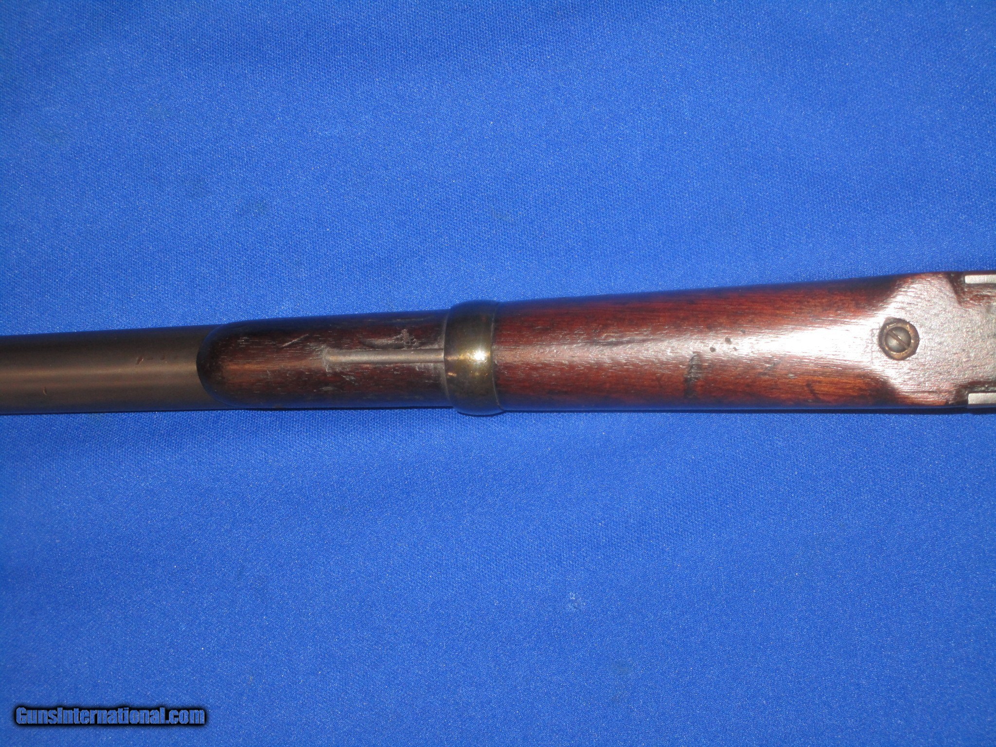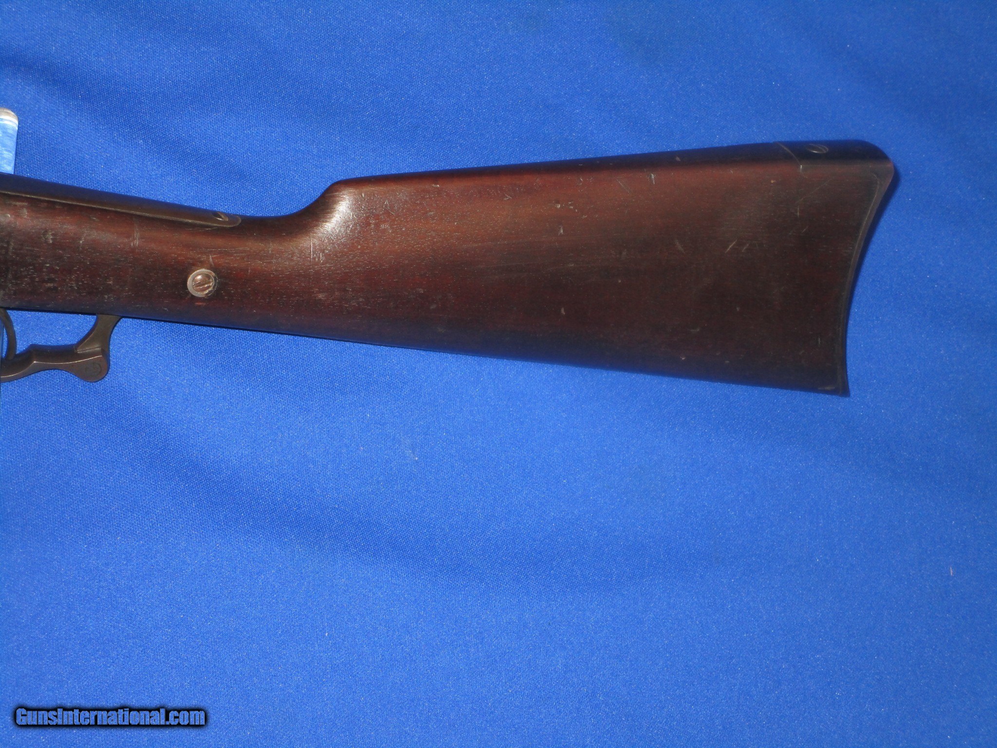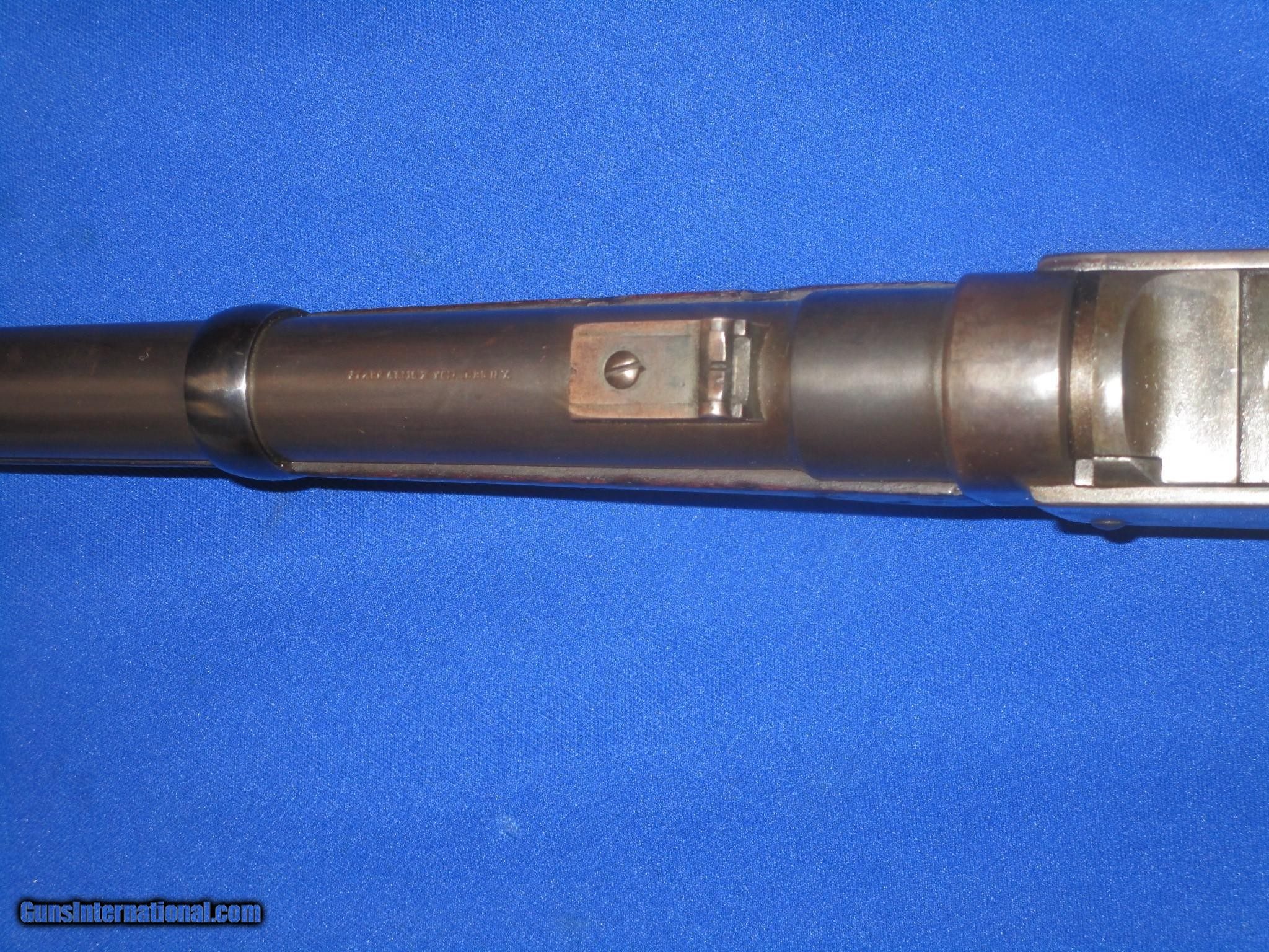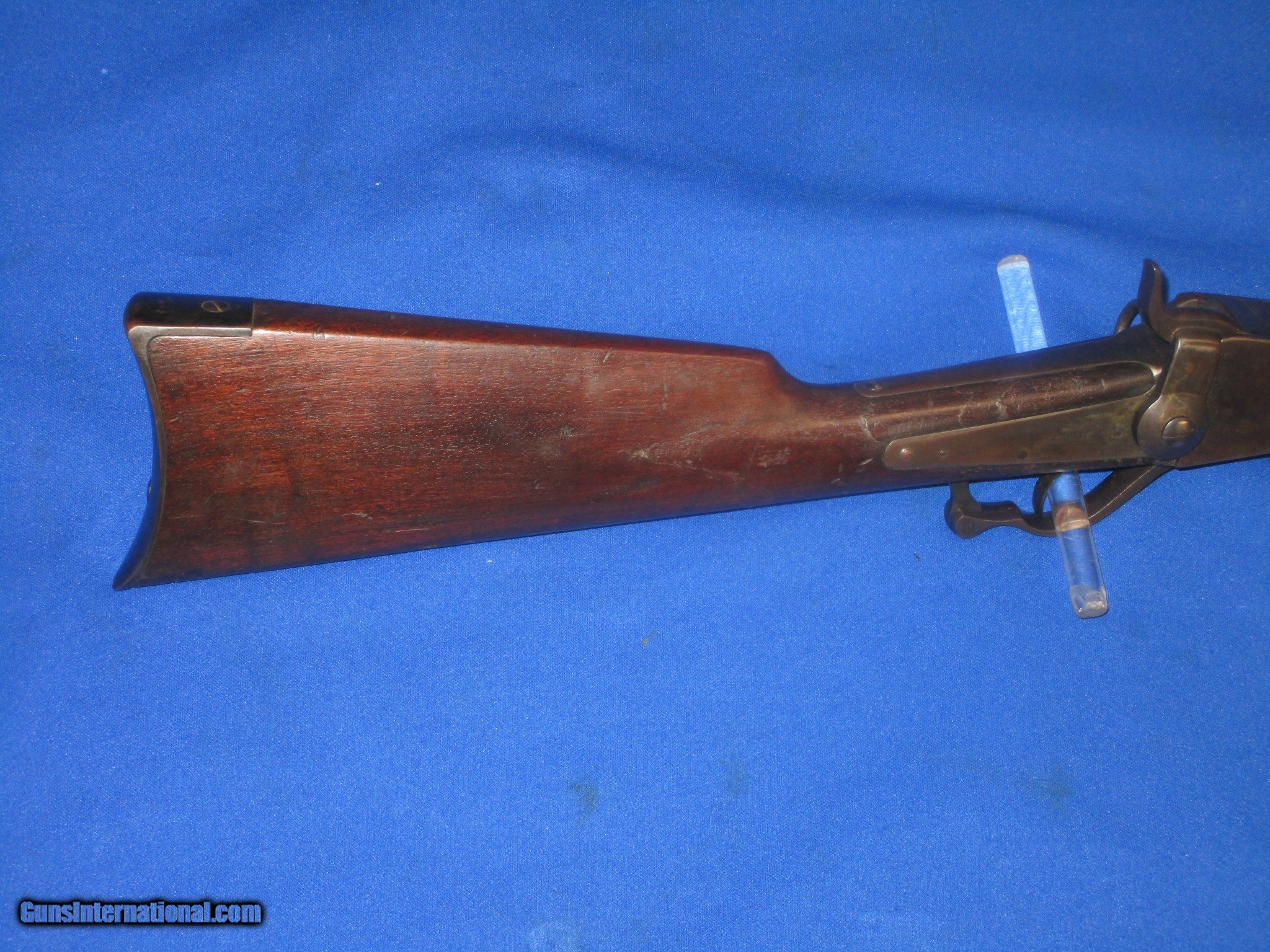 Description: A Civil War Starr Arms Co. Cartridge Carbine In Fine Untouched Condition. All original and complete. Serial #32,029 with all matching numbers. All original and complete. Only 5,002 made. The carbine has fine untouched metal and crisp markings throughout. All the edges are fine on the gun. The barrel and butt plate on the carbine both retain nearly all of their original factory blue on them. The lock plate, receiver, hammer and lever all show some original case colors. The wood on the carbine is good throughout with an old period repair in the stock behind the lock. The bore and action are excellent. This Is A Very Nice Untouched Example Of A Civil War Starr Arms Co. Carridge Carbine! SOLD Antique: Yes Manufacturer: Starr Arms Co. Model: Carbine Serial Number: 32,029 Metal Condition: Fine Wood Condition: Good Bore Condition: EXCELLENT Action: Excellent |