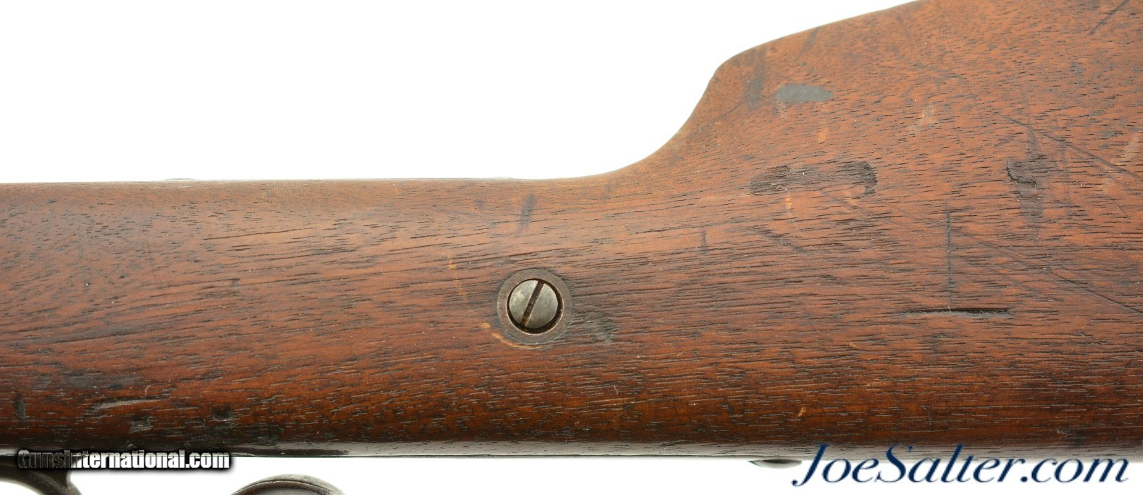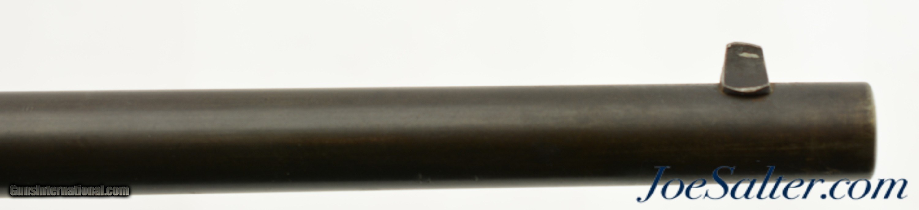 Description: Serial #22301, .54 Caliber, 21" barrel with a fine, bright bore that has mild freckling within the grooves. This carbine has about 70-75% of the original blue remaining on the barrel with the balance turned to a plum-brown and gray patina, with a few small impact marks on the top of the barrel ahead of the barrel band. The frame has a somewhat grayer patina with thin brown freckling throughout, as well as areas of pitting along the leading edge of the hammer, and on the forward portion of the lever. Original bright fire blue is still visible on the protected ares of the pivoting breechblock. The action locks firmly and is fully functional. The walnut forend and buttstock are in good shape with numeroushandling marks and minor surface blemishes scattered about the original oil finish finish. The inspector cartouche are still crisp and clear on the left side of the buttstock. This is a very good example of a Civil War Burnside, and would make a great representative example for a collection. Antique; Price: $1,695.00 Contact Seller |