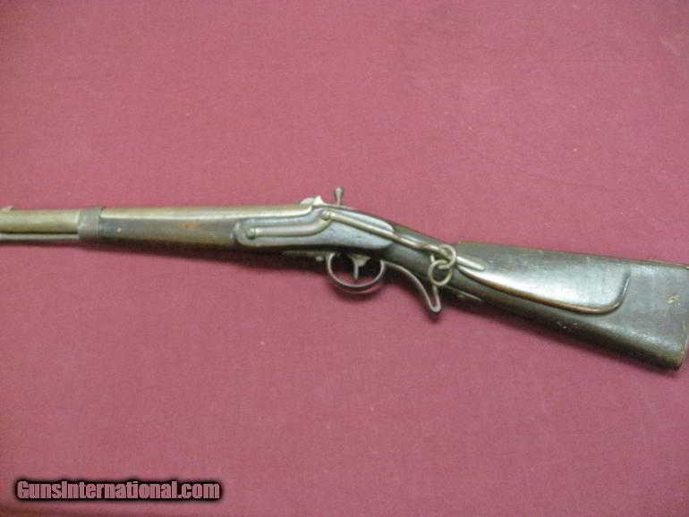 Description: Very possibly used in Civil War-Stock has no cracks, chips, or splits-72 Caliber-14.5" barrel-Sadddle Ring Carbine-Gun apppears to be 100% original-Little to no pitting but lots of patina-Proof marks visible-Original cleaning rod-Lock and barrel serial numbers match-Serial #852-Untouched and beautiful-Completely fireable-Bore and rifling excellent-Action excellent-No FFL required SOLD Antique: Yes |