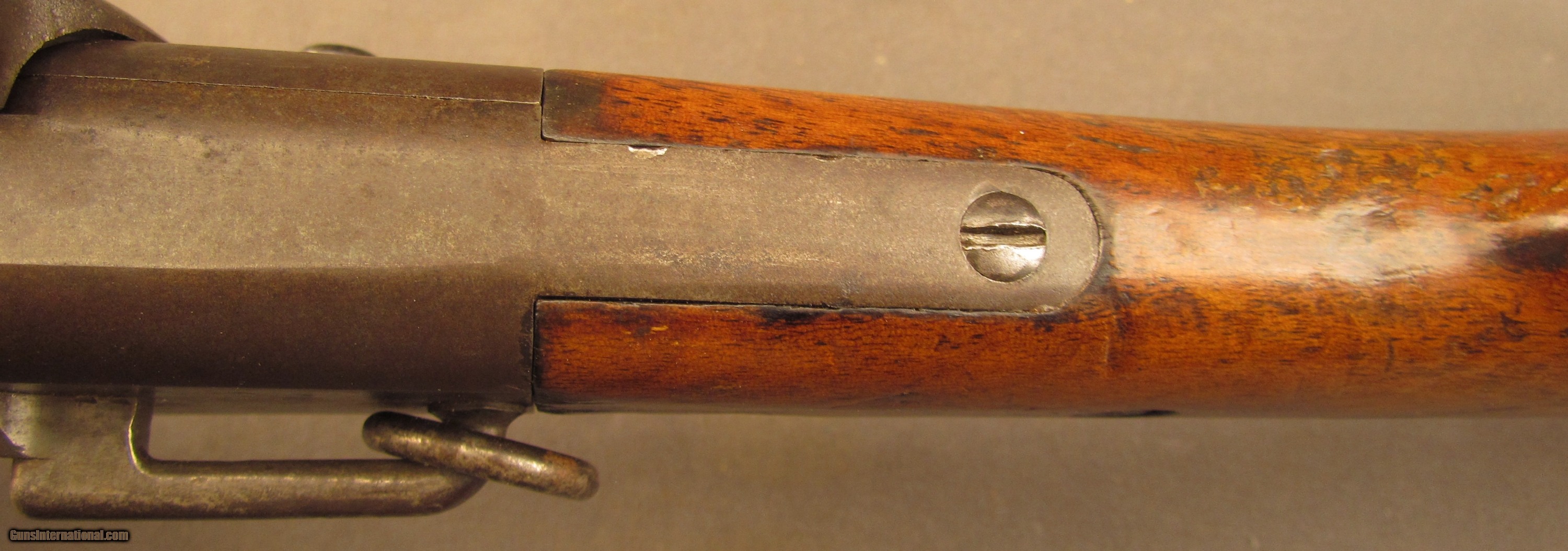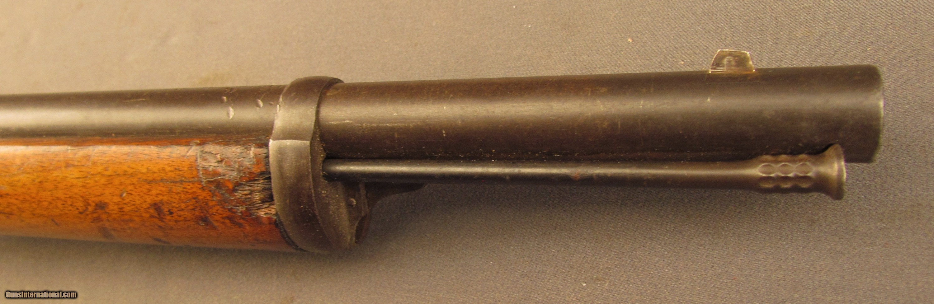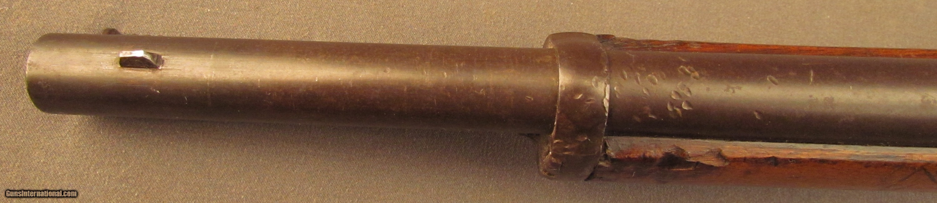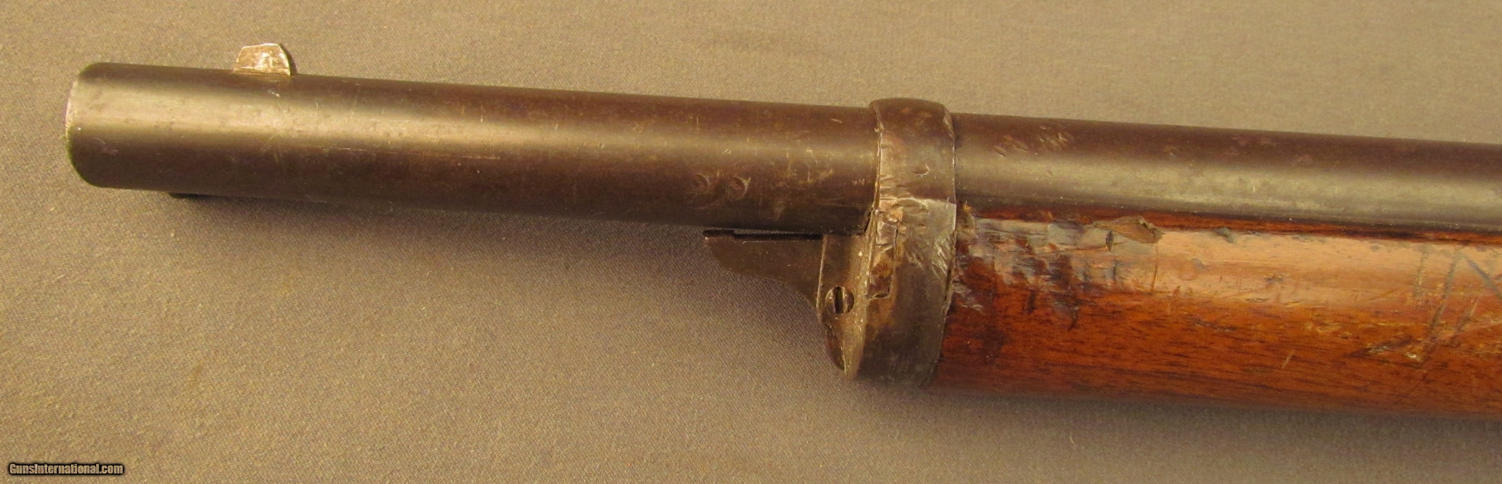 Description: NSN, .50 RF, 20 1/2" barrel with a very good bore that has some light freckling and pitting within the grooves. This is a seldom seen carbine that has an overall dark plum-brown patina with some traces of mild gray on the hammer and right side of the frame and bolt. Additionally, there is a series of peen marks along the top of the receiver and lower edge of the sideplate just behind the hammer. The magazine cut-off on the left side and the triggerguard/lever pin retain about 90% of an added blue finish with mild gray fading on the balance. The "US" and Lamson & Co markings on the left side are still quite clear. The walnut forend and buttstock have an added varnish finish over numerous small handling marks and surface blemishes throughout with a further sizable chip missing from the left side of the wrist. The carbine comes with an original ramrod and the action is fully functional. These carbines were ordered in 1864 but weren't delivered until May of 1865 after hostilities had ceased (1002 produced). Nevertheless, they are considered a secondary Civil War weapon and are seldom seen today. This example is in very good condition and would make a great addition to any collection. Antique SOLD Antique: Yes Manufacturer: Ball Model: Carbine Caliber Info: .50RF Gauge Info: .50RF |
